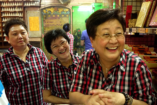 相識數載,當Emily (相左)、Jenny (相右)、Angela(中)看到 師父到訪,十分欣喜。熱情的她們,負責打理仙祖宮日常大小廟務工作。