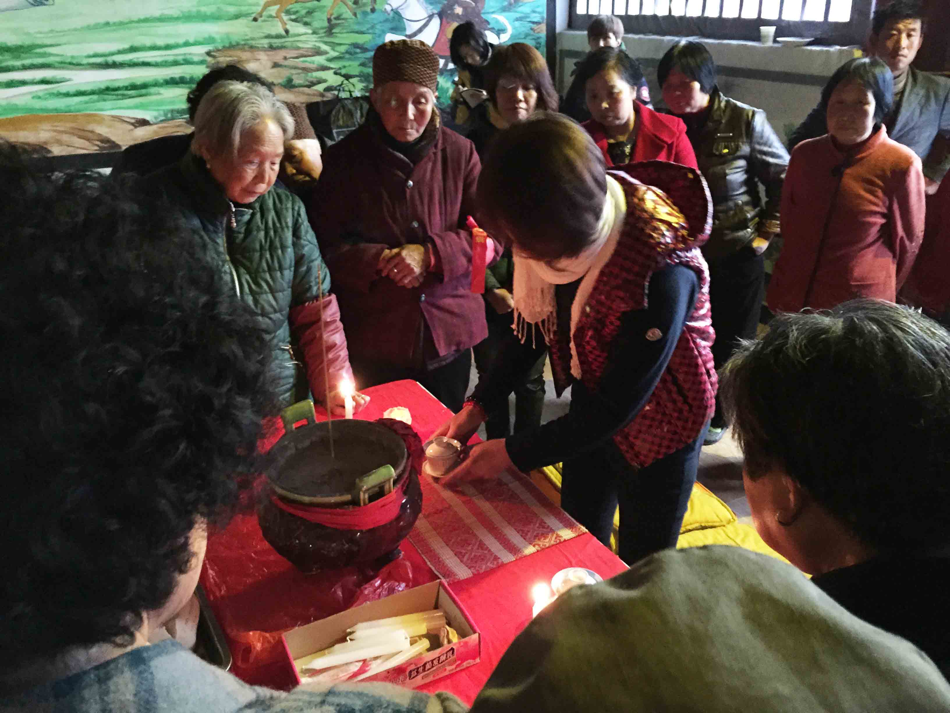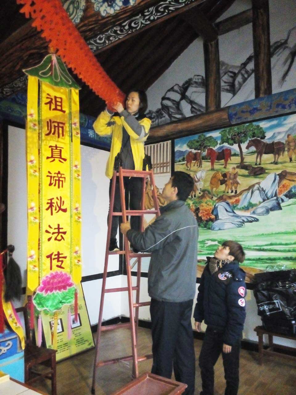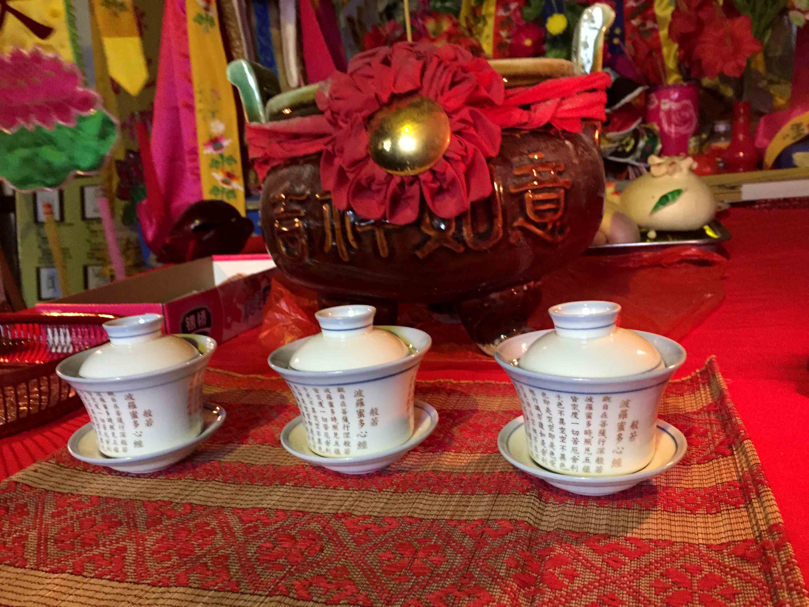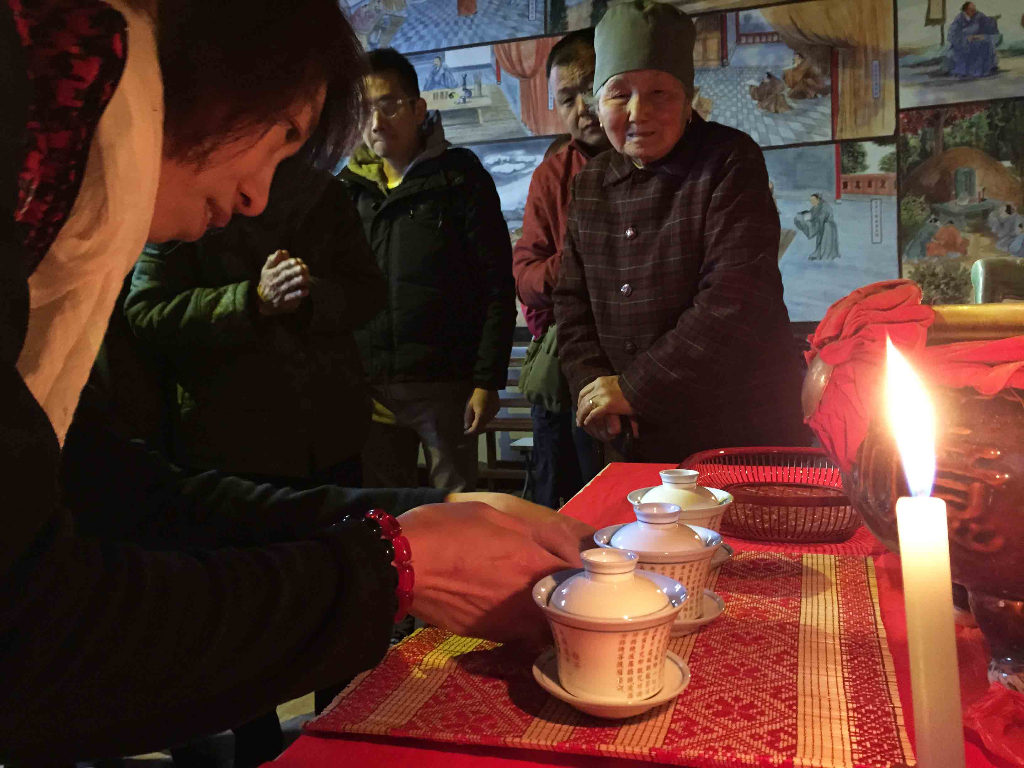 師父從港澳帶來供杯、絲花、佈置物品等,莊嚴岐山 淳風祠,為翌日的祭祀慶典做好準備。 師父還耐心教導當地村民以恭敬心供茶。感恩 師父!