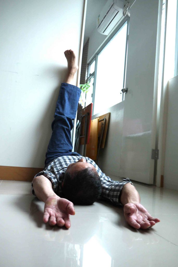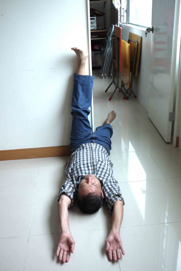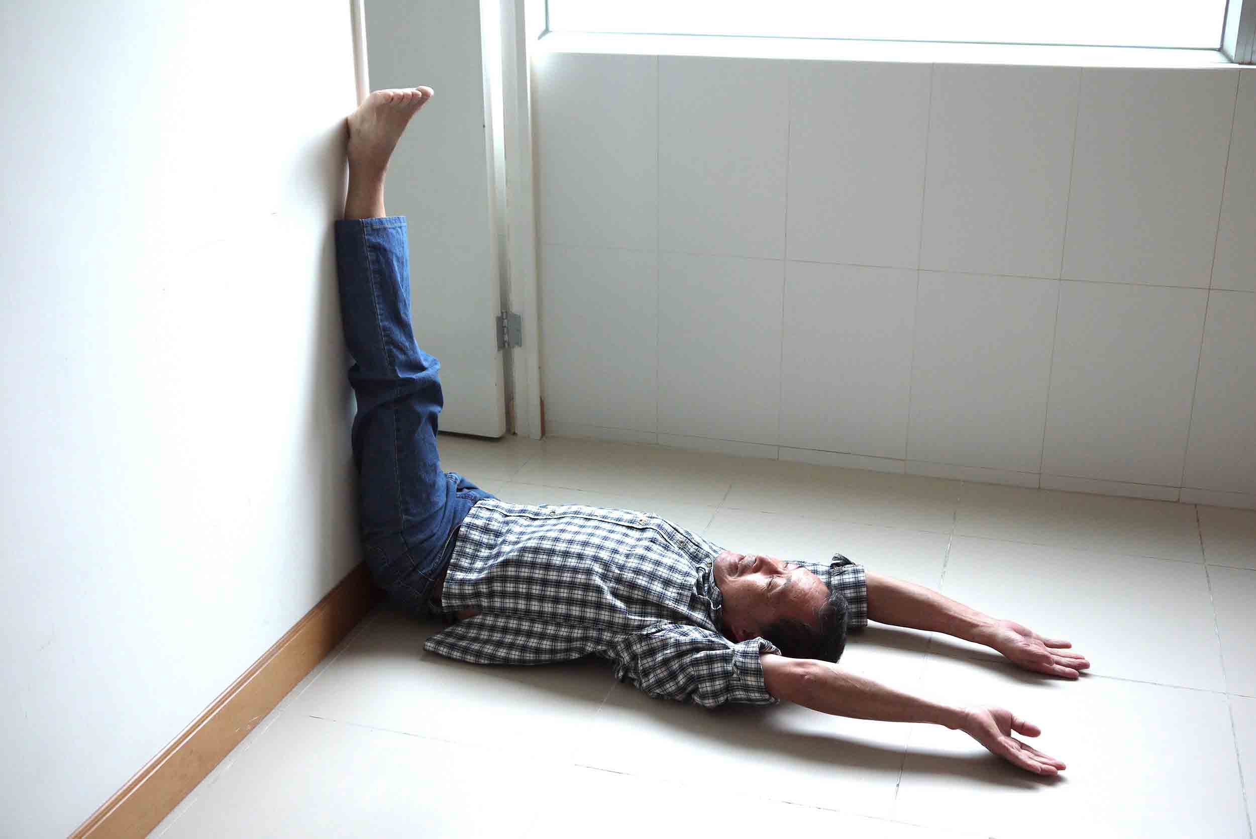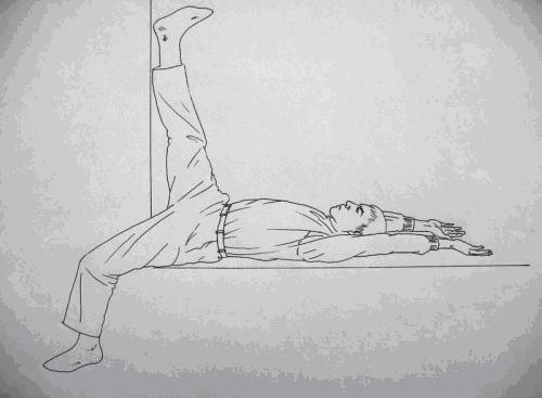 躺下仰臥,右腳伸直倚在牆柱或門框上,左腳屈膝落地,盡量觸及地面,雙手舉起平放在椅上,做十分鐘。期間左腳亦可作踏單車姿勢擺動,有利放鬆髖部的關節;移動椅子至另一面,再依上述方法,左、右腳轉換,再做十分鐘。