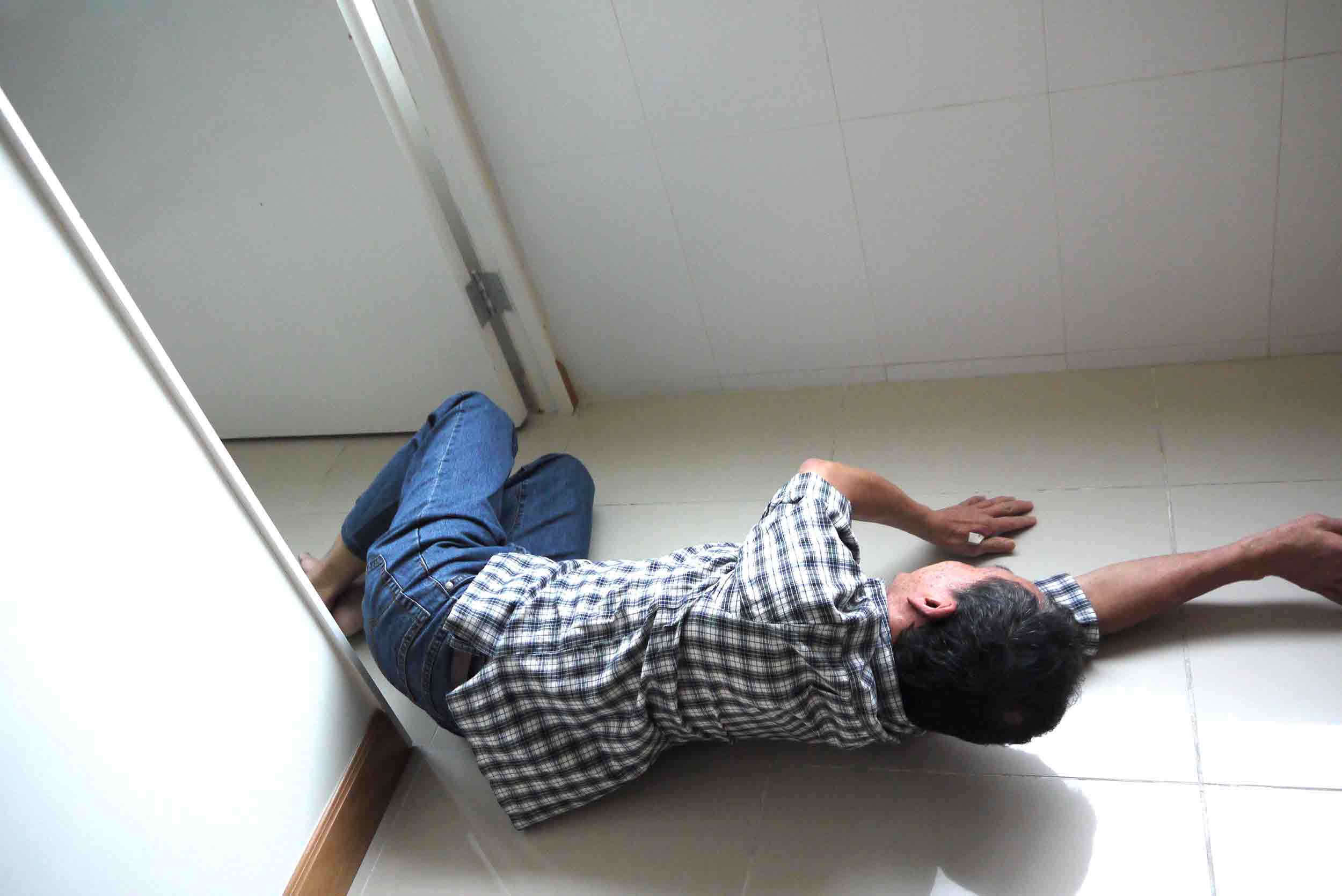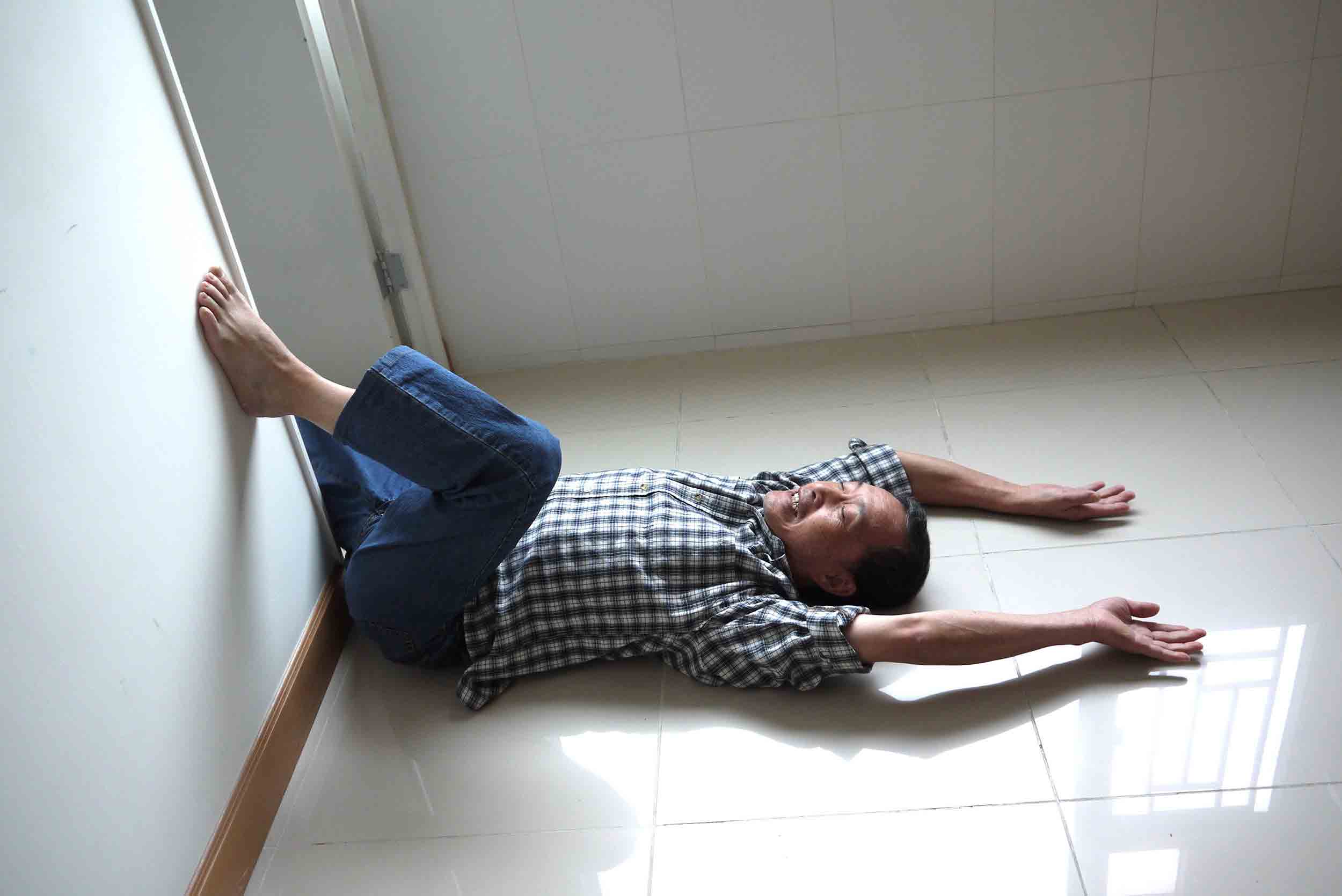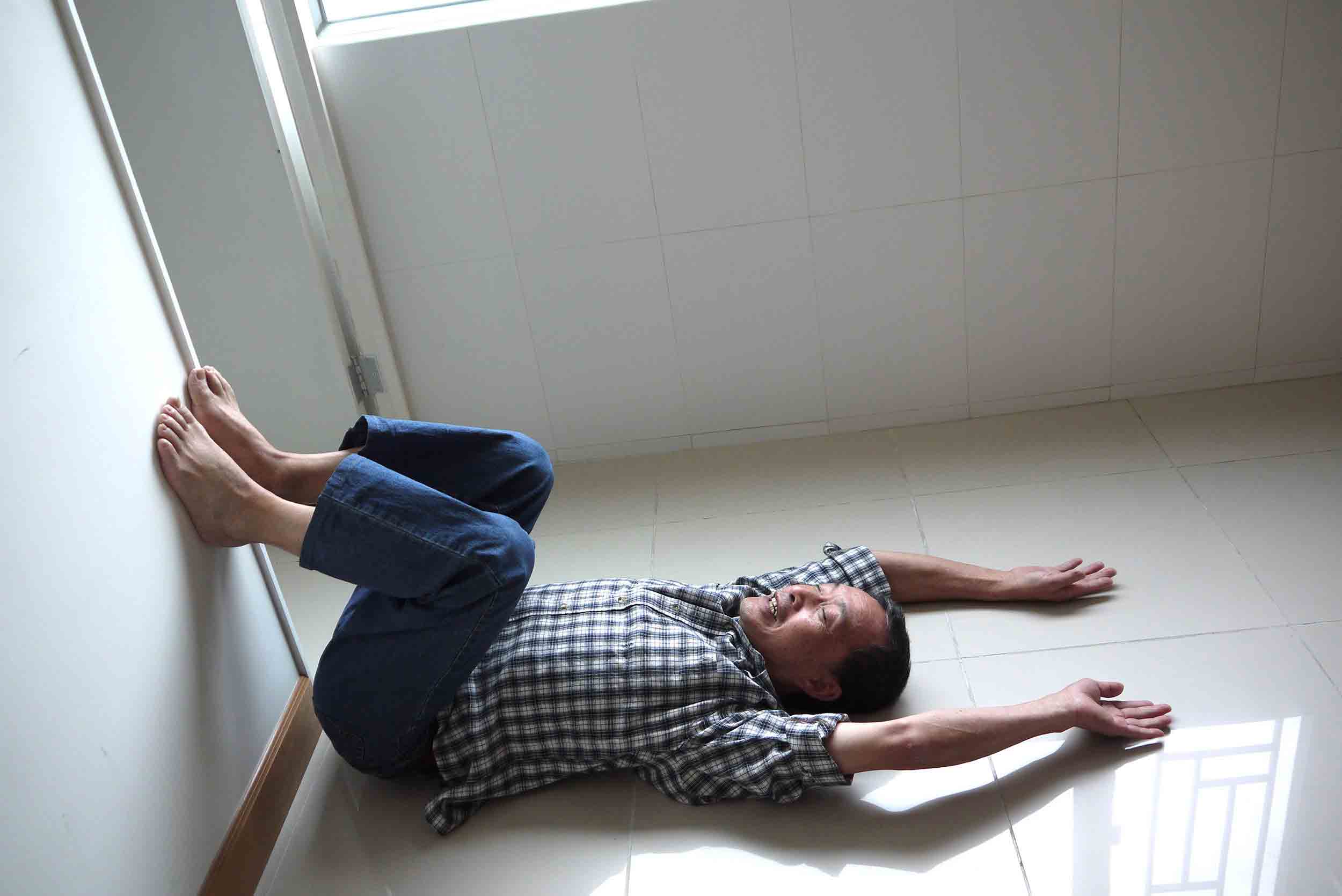 躺下仰臥,右腳伸直倚在牆柱或門框上,左腳屈膝落地,盡量觸及地面,雙手舉起平放在椅上,做十分鐘。期間左腳亦可作踏單車姿勢擺動,有利放鬆髖部的關節;移動椅子至另一面,再依上述方法,左、右腳轉換,再做十分鐘。