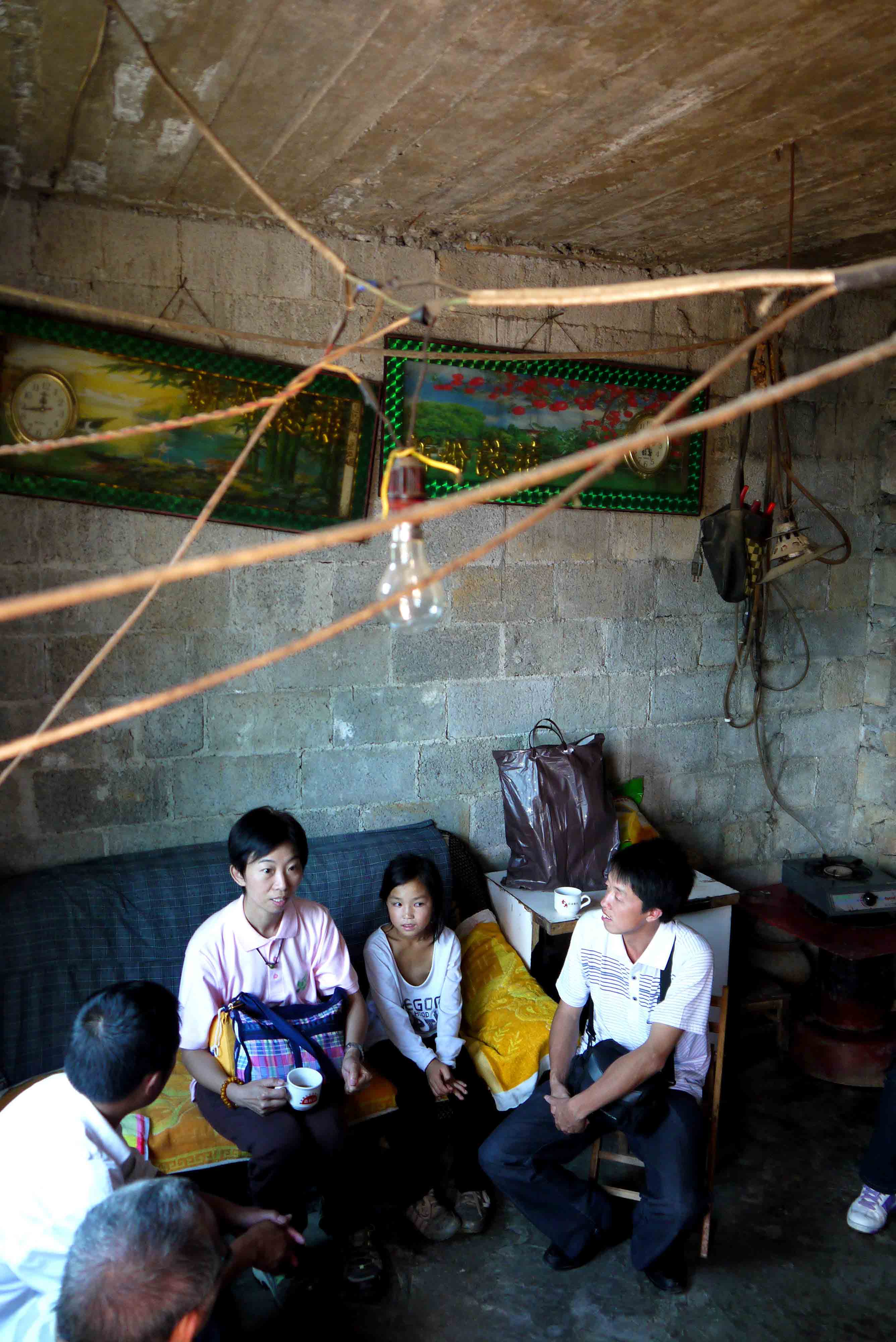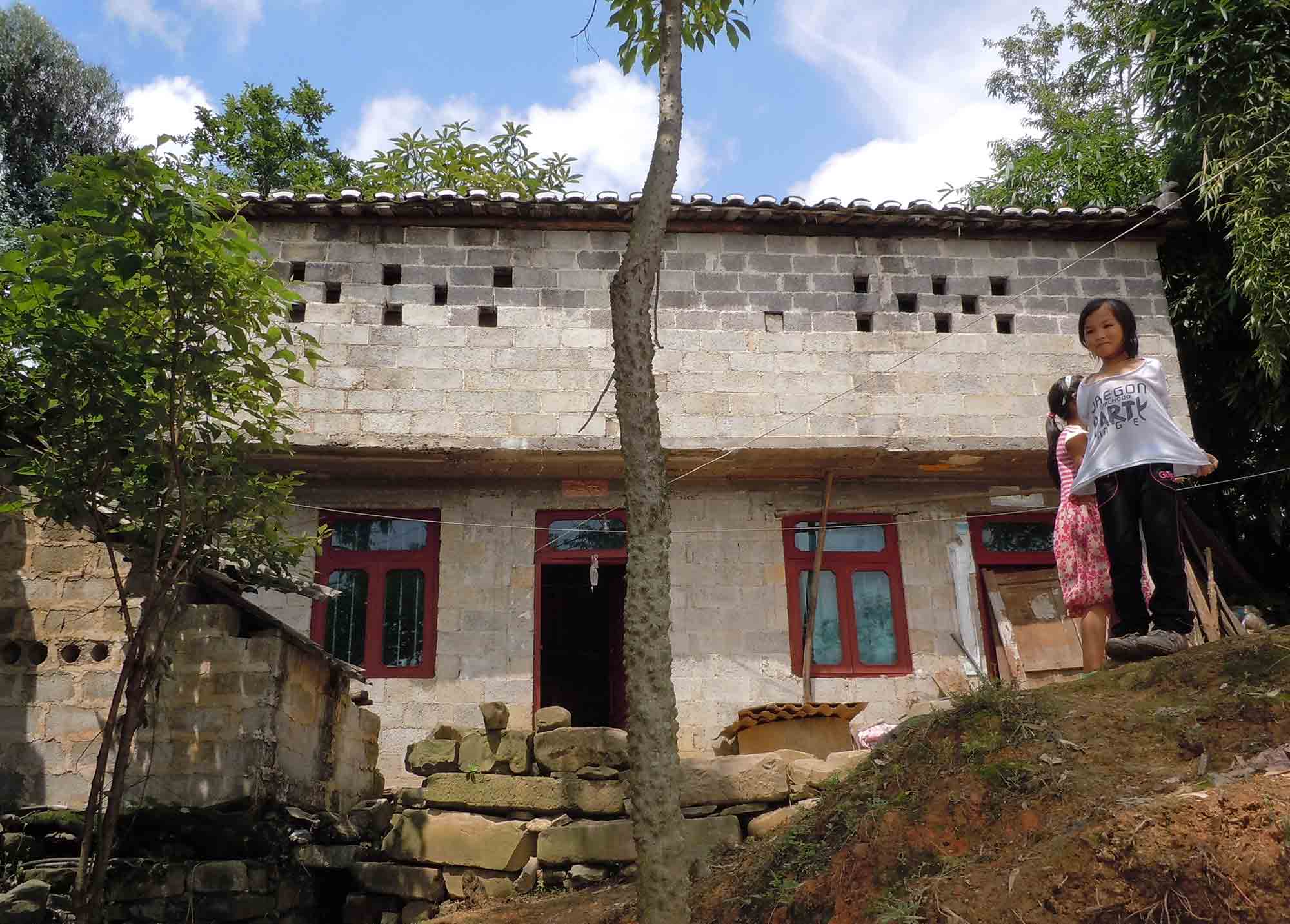 王明麗同學,十歲,四年級,最近搬進政府資助修建、屋頂用瓦片砌的石屋。原來住的是破舊木屋。新屋倘大而且涼快,屋子當眼處貼有貴州風俗的羽毛平安符。