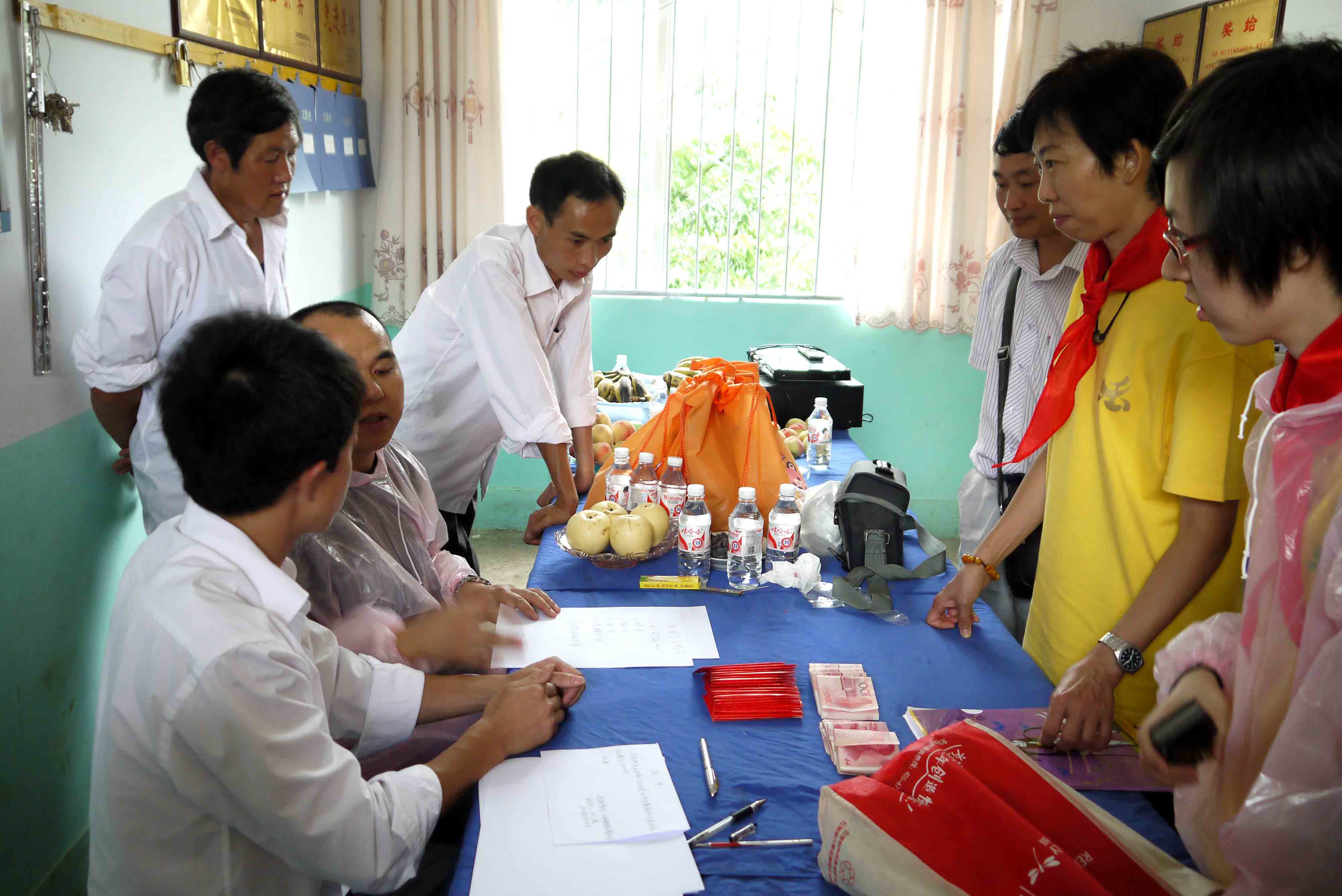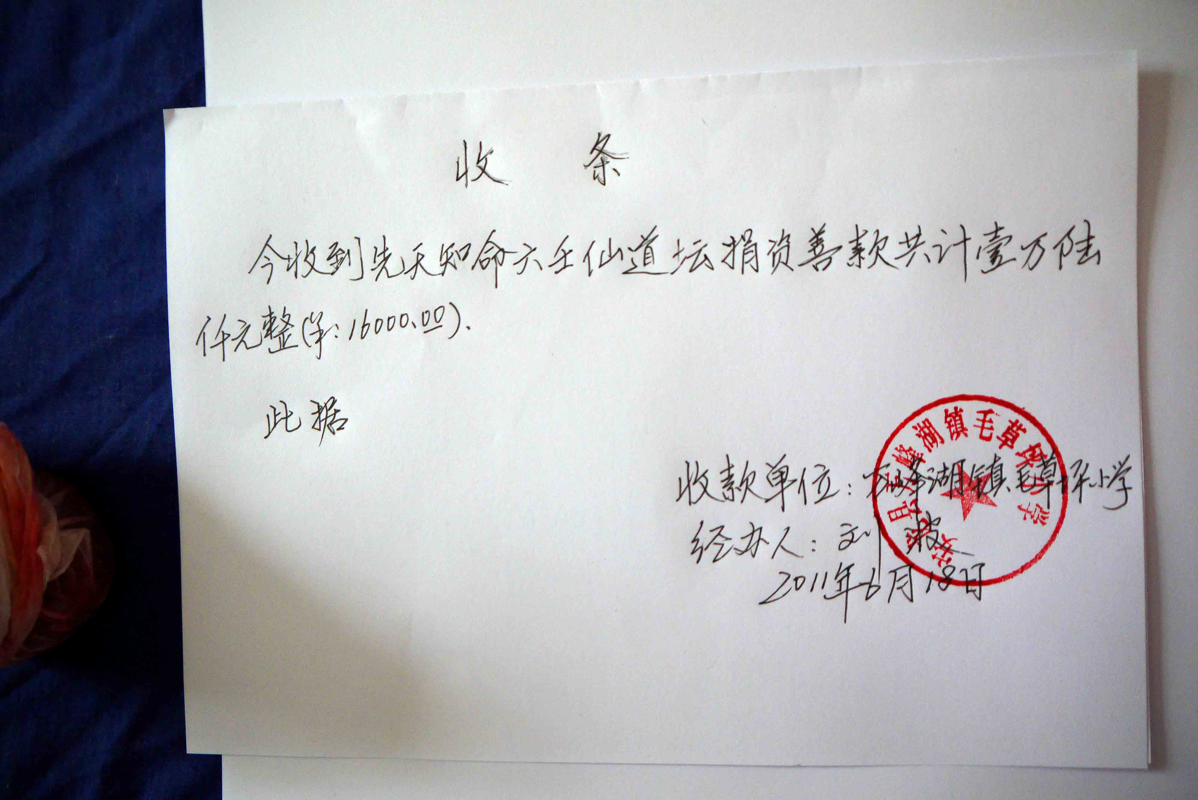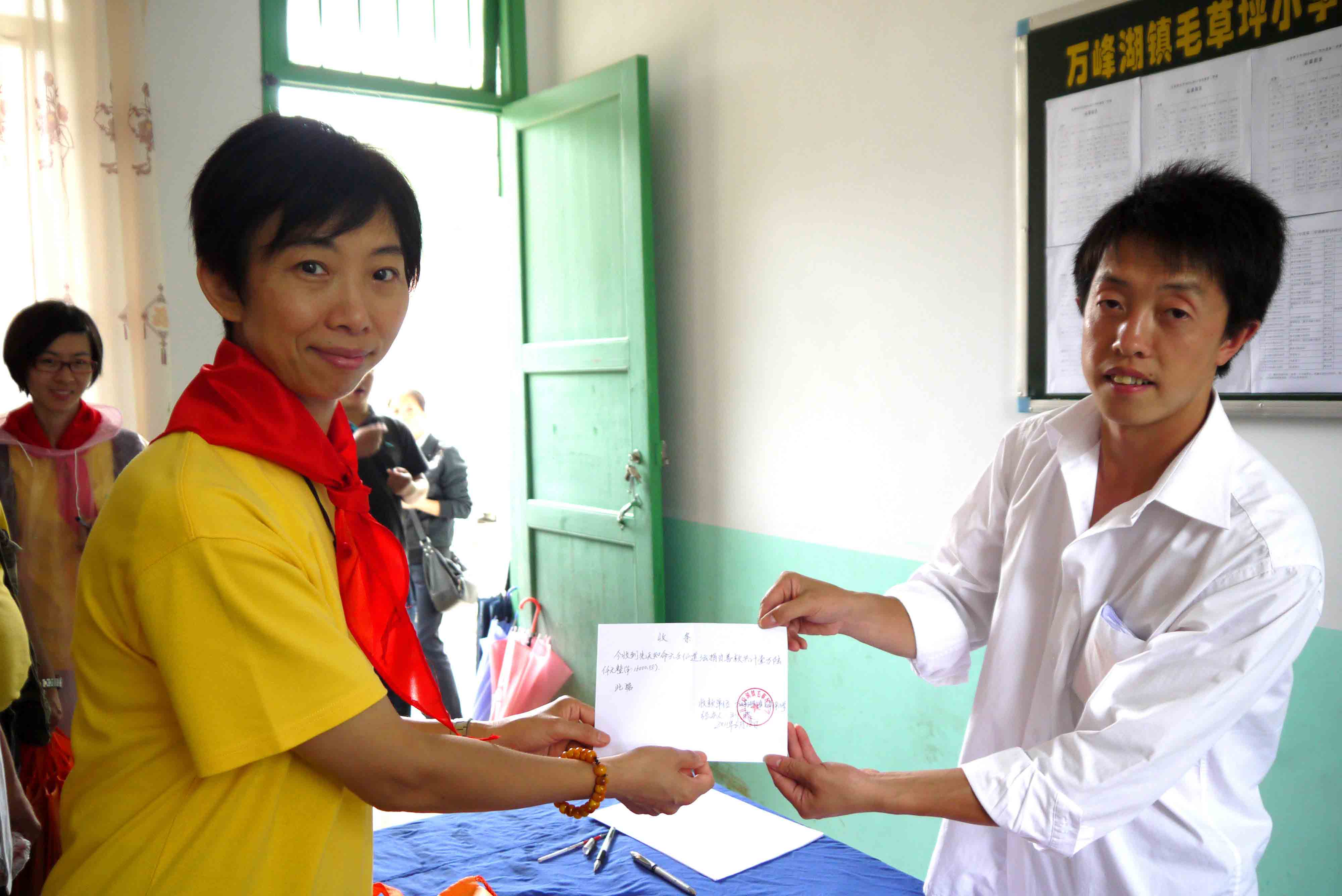 師父將點點心意捐助學校。 師父教導我們,透過親身的探訪,將真愛帶給山區兒童,令他們相信:「人間滿希望。」收過結緣金,毛草坪小學劉波校長認真寫下收據,同時亦代表家長將他們的心意送贈我們,還緊張的給我們講解每一份禮物,原來都是當地小數民族的出品,包括親手縫製的鞋墊和新鮮合桃。