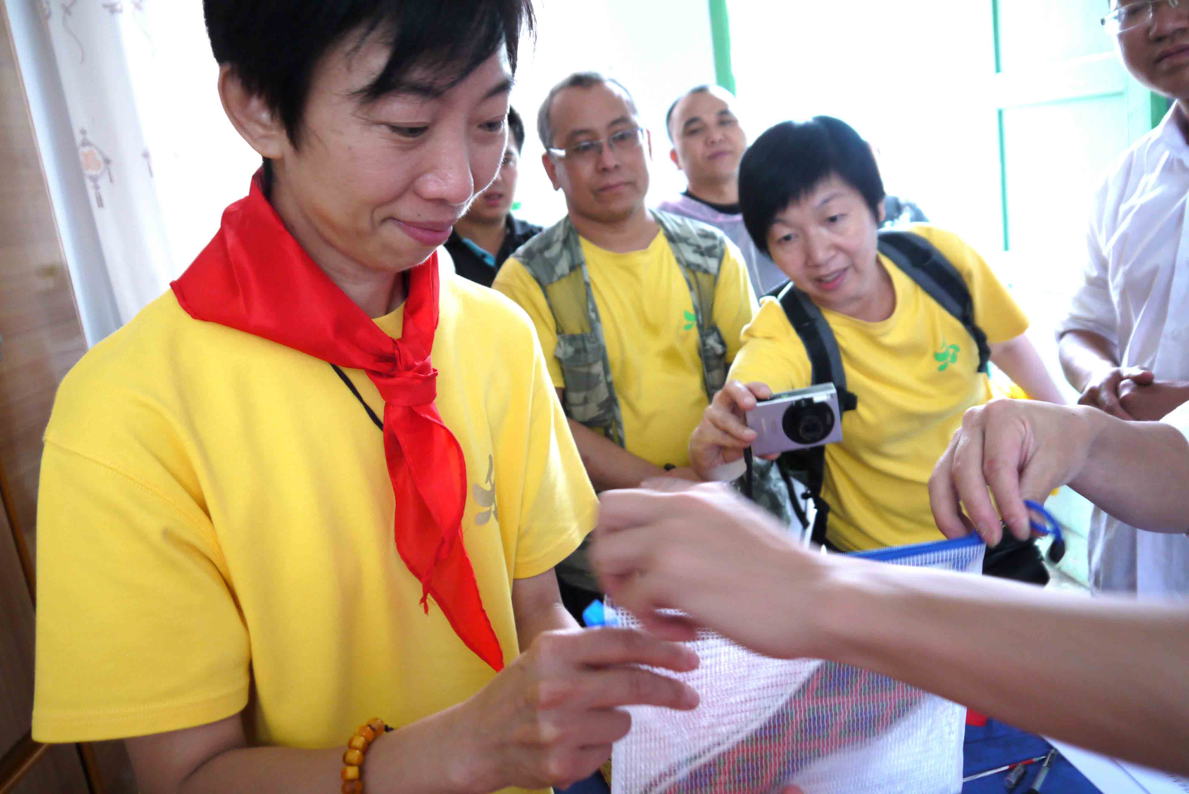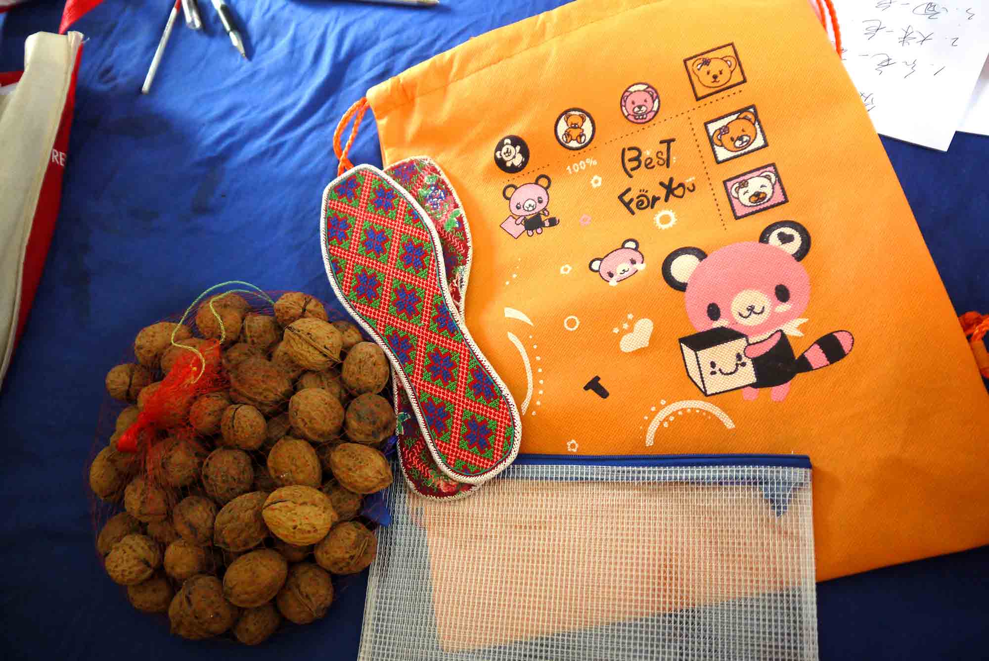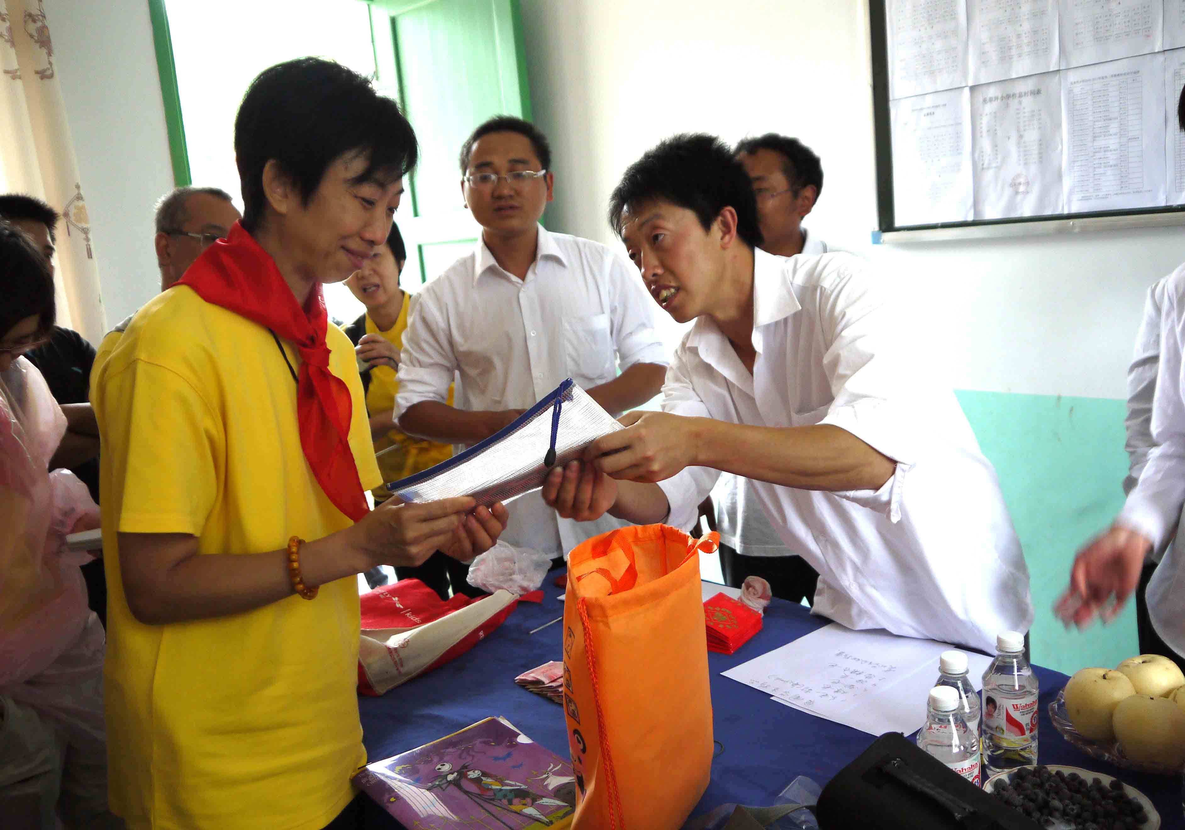師父將點點心意捐助學校。 師父教導我們,透過親身的探訪,將真愛帶給山區兒童,令他們相信:「人間滿希望。」收過結緣金,毛草坪小學劉波校長認真寫下收據,同時亦代表家長將他們的心意送贈我們,還緊張的給我們講解每一份禮物,原來都是當地小數民族的出品,包括親手縫製的鞋墊和新鮮合桃。