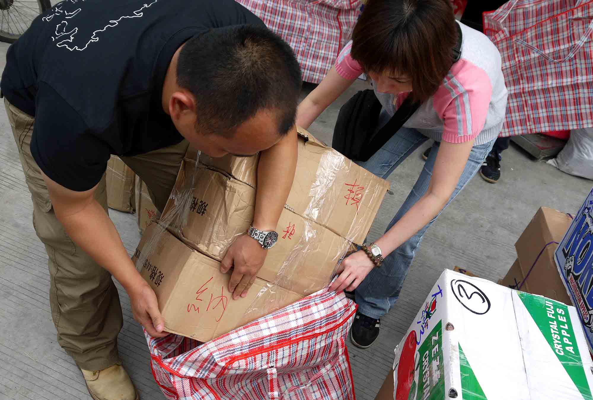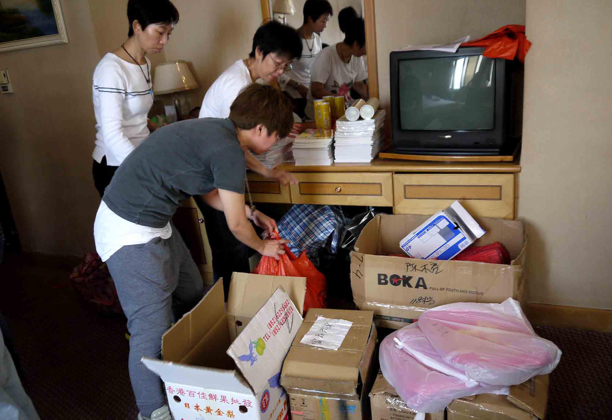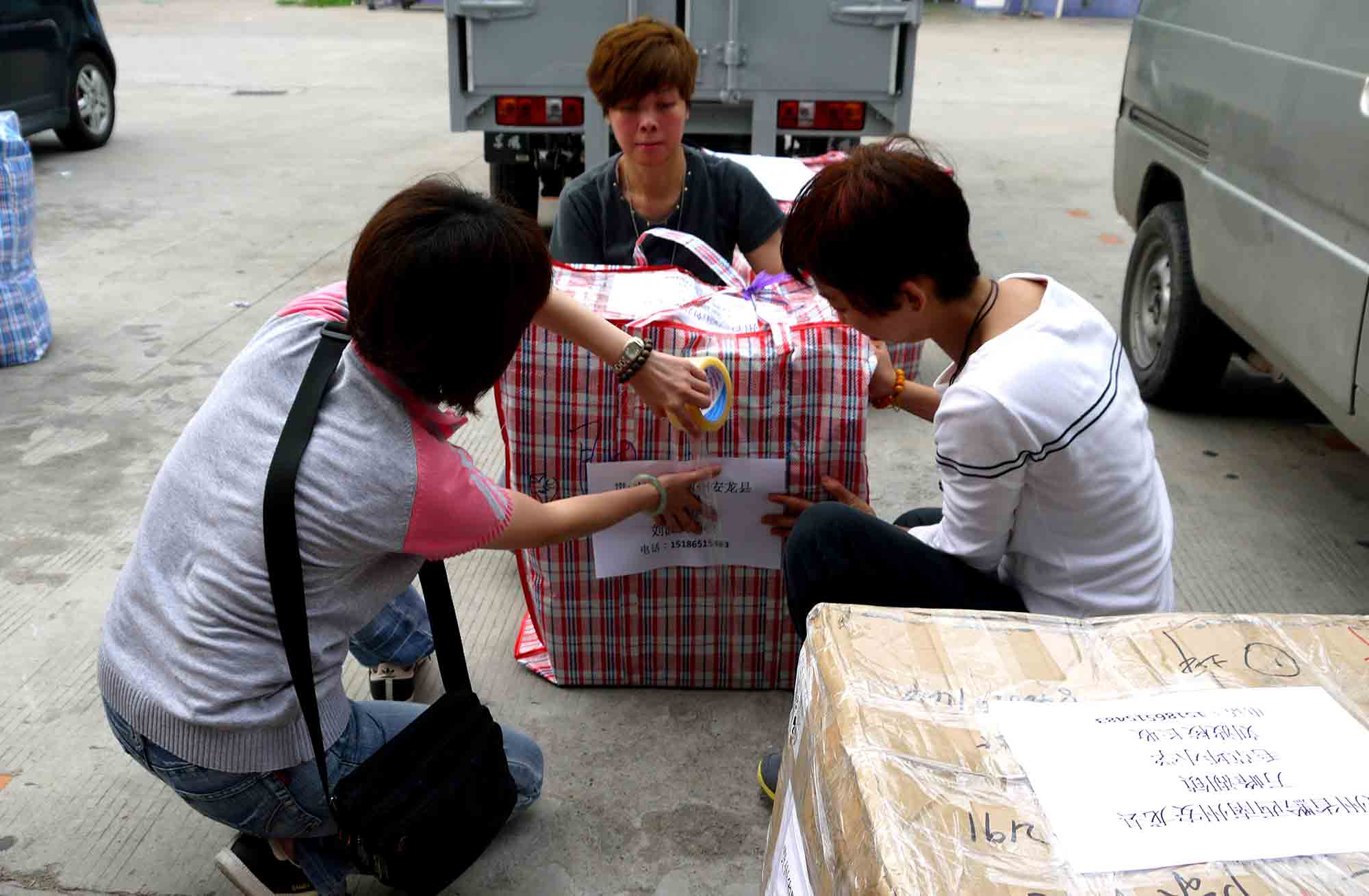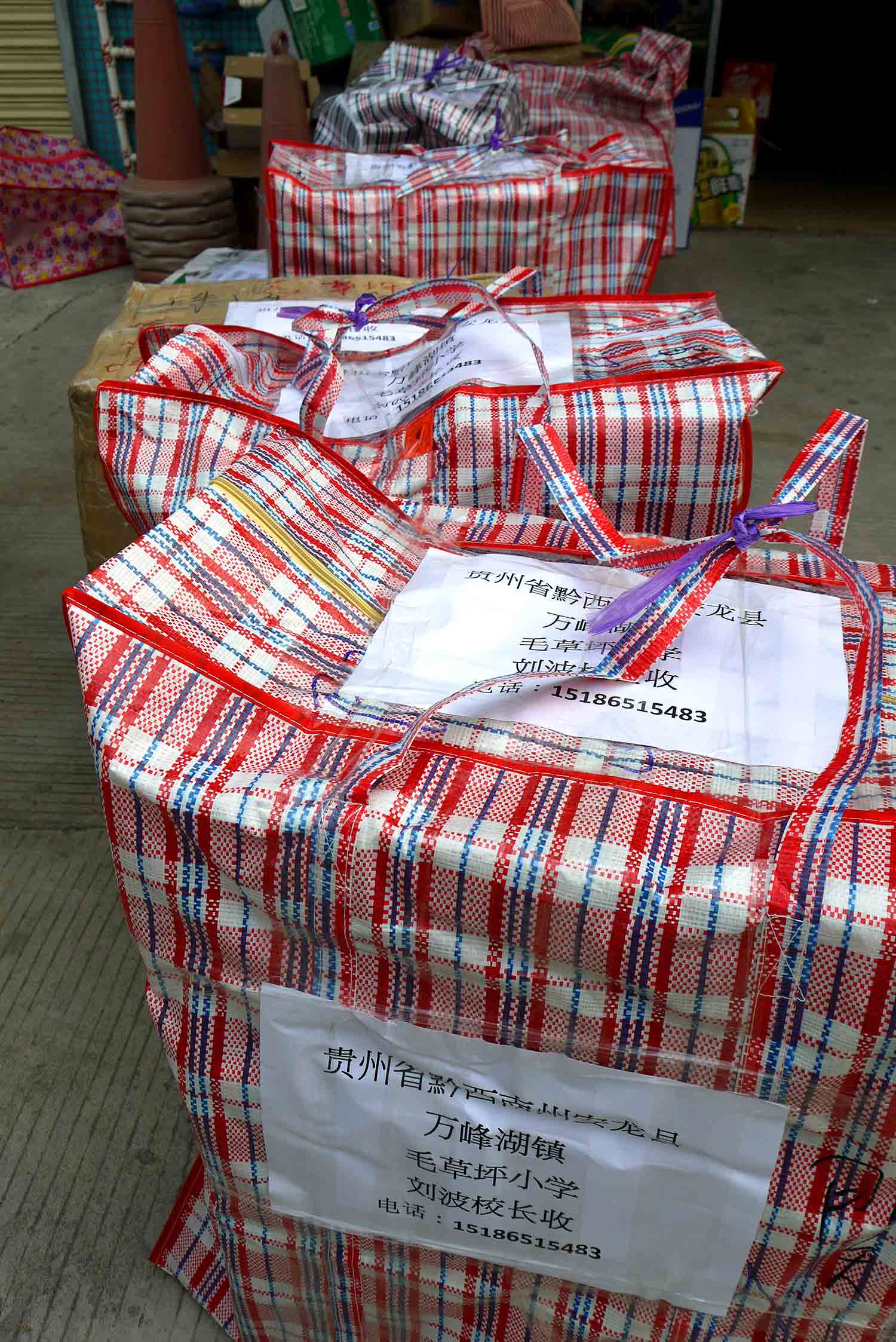 於珠海一酒店房間內,我們正準備寄往貴州山區學校的部份物資。大家同心協力,無分彼此,將物資分類包裝,準備托運寄給貴州四間山區小學共7個教學點,為的是將希望和關愛送給山區小孩。感恩 師父!到達托運公司,我們將小盒的物資歸一入在紅白藍大袋裡,再在每一袋/箱上貼上正確的寄貨地址,以確保物資不會寄失。