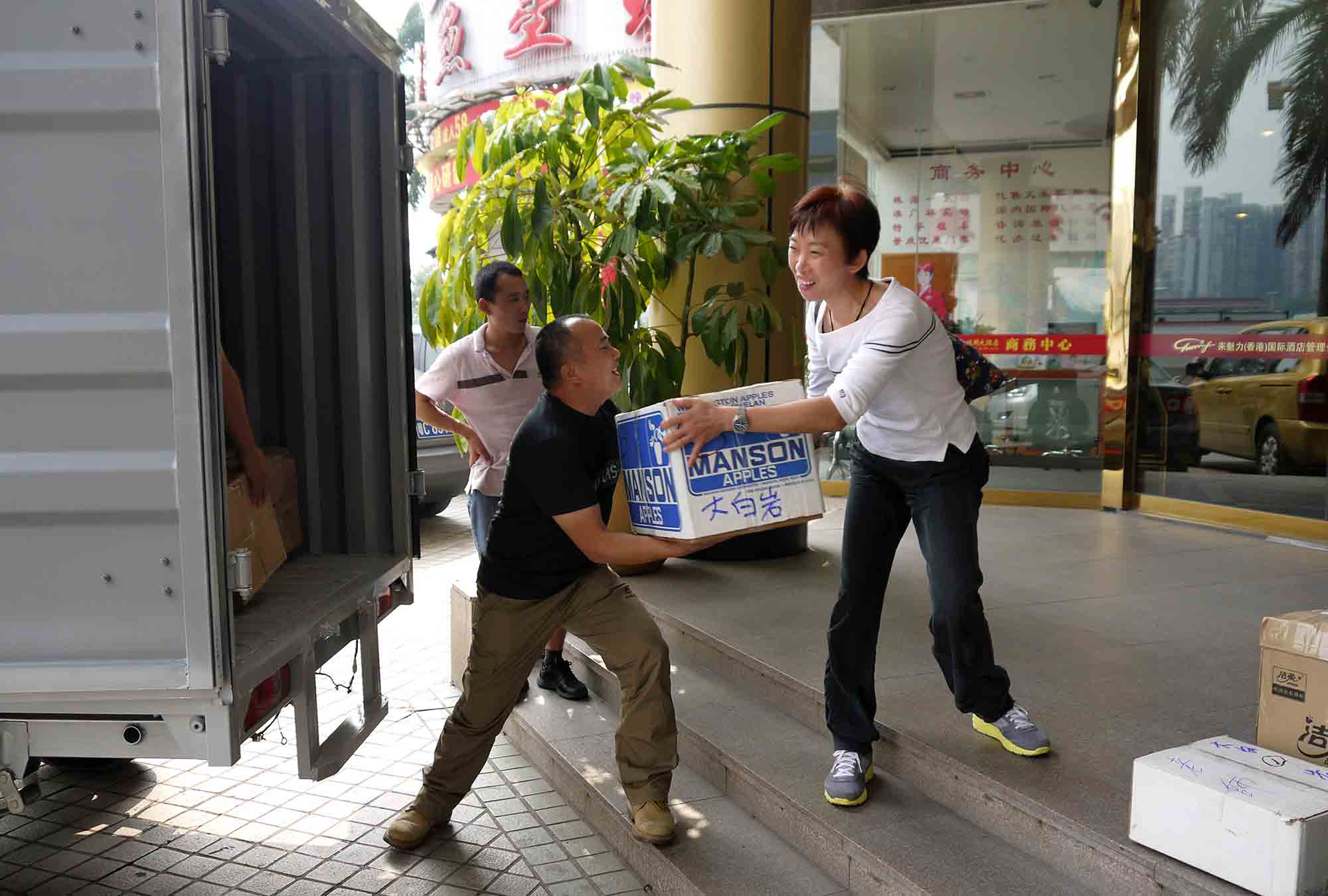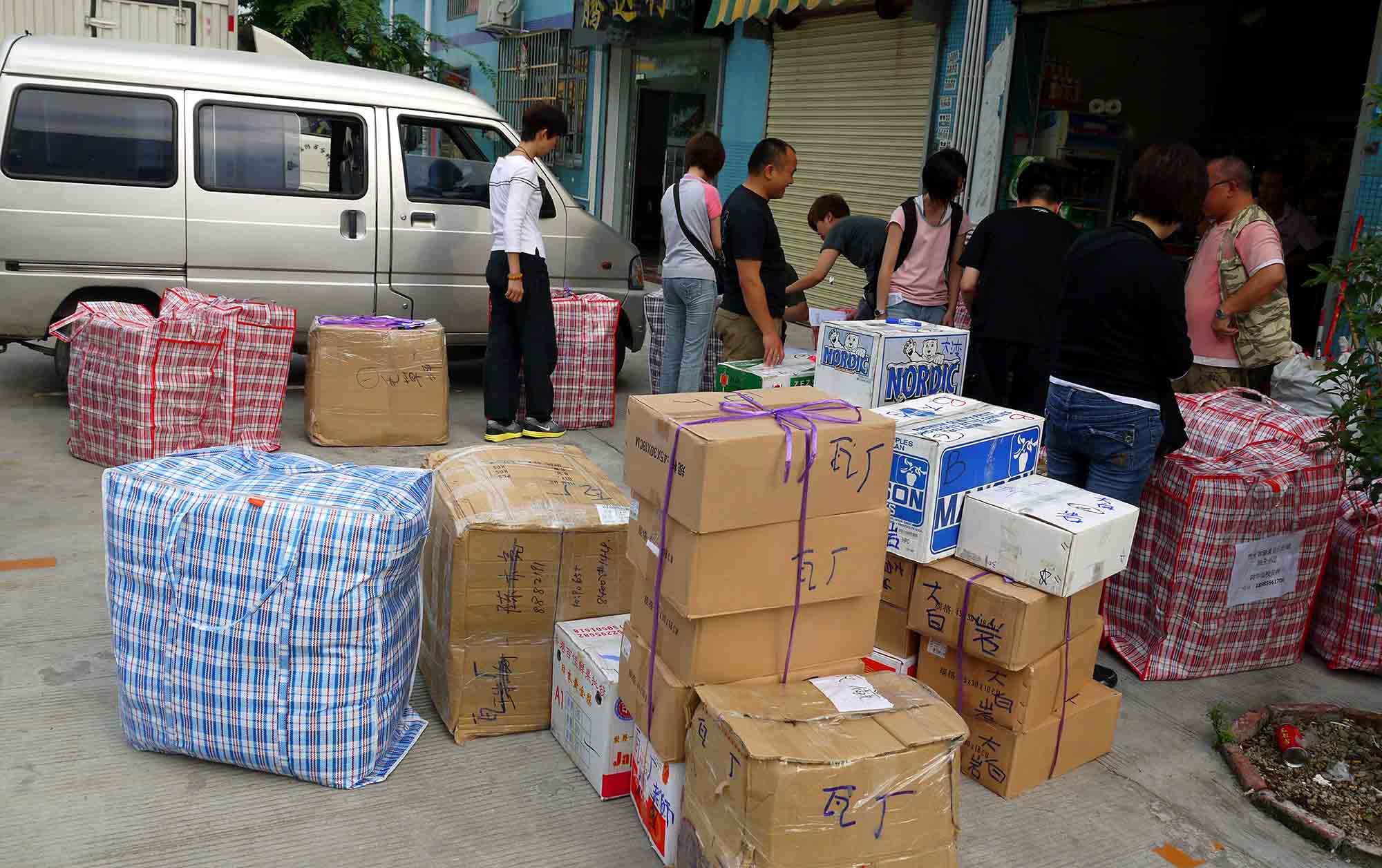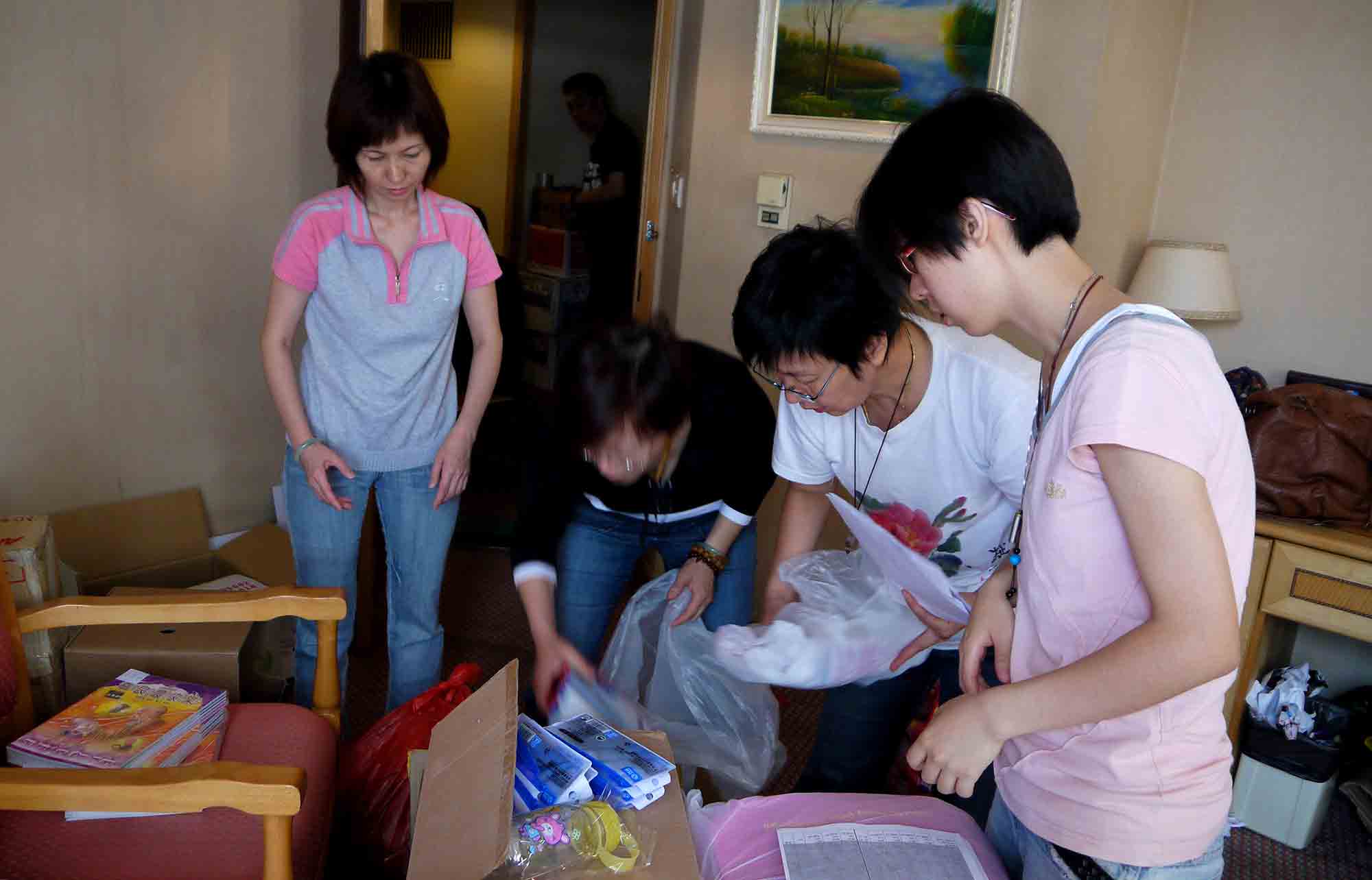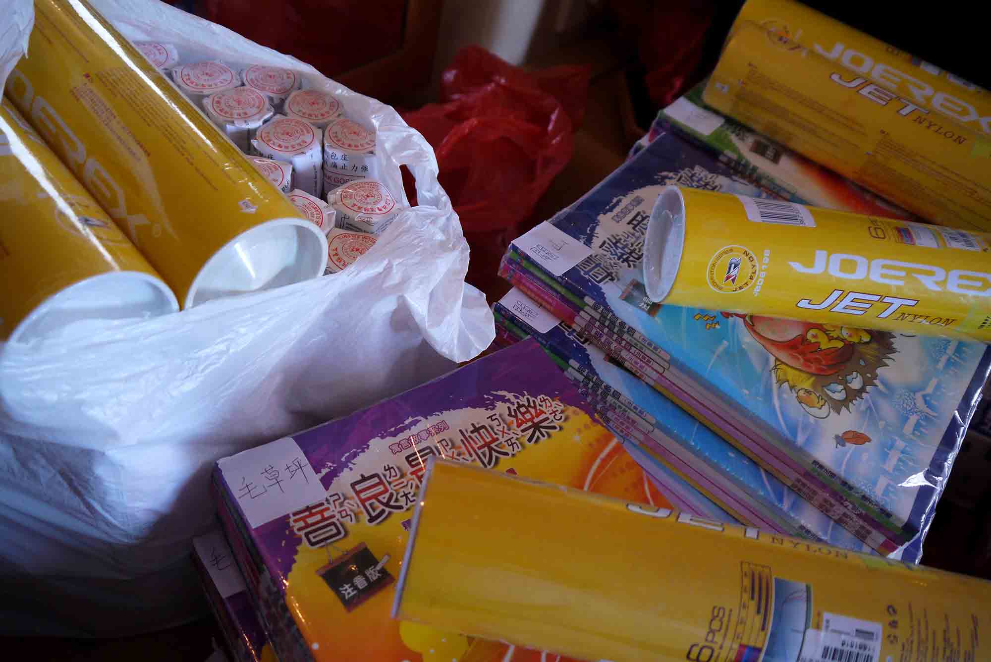 於珠海一酒店房間內,我們正準備寄往貴州山區學校的部份物資。大家同心協力,無分彼此,將物資分類包裝,準備托運寄給貴州四間山區小學共7個教學點,為的是將希望和關愛送給山區小孩。感恩 師父!到達托運公司,我們將小盒的物資歸一入在紅白藍大袋裡,再在每一袋/箱上貼上正確的寄貨地址,以確保物資不會寄失。