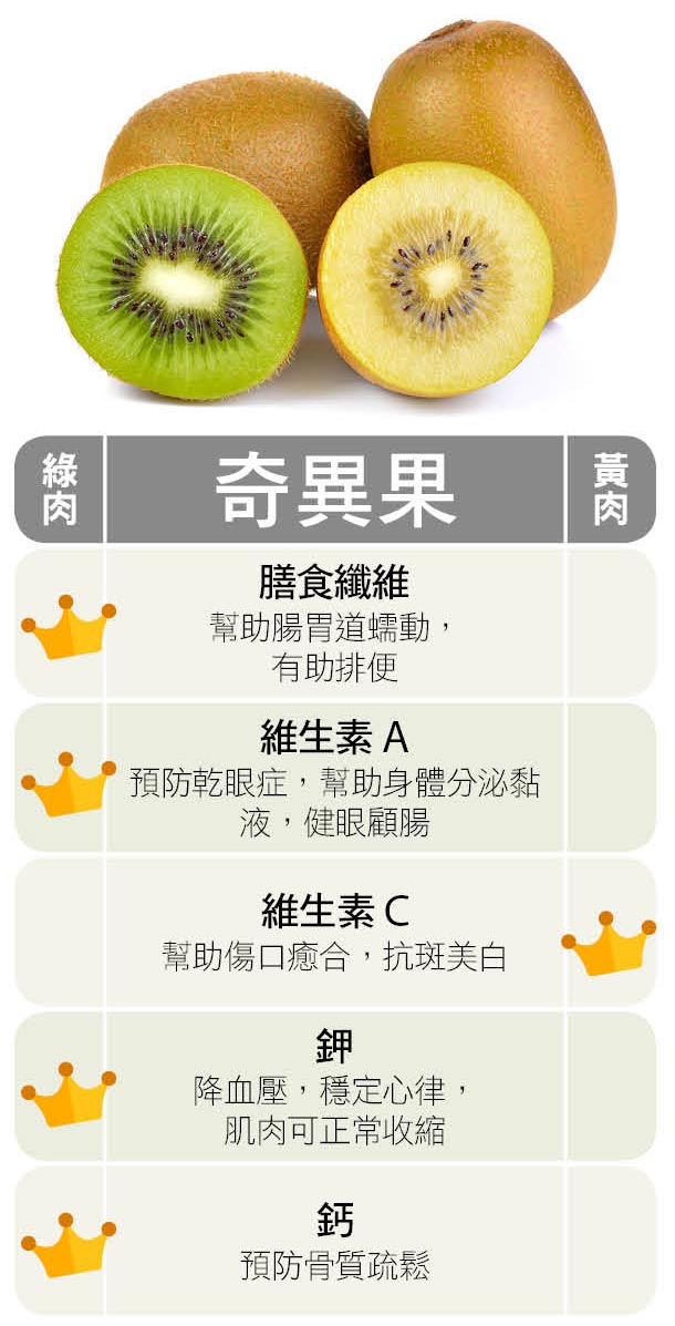 綠色奇異果則比黃金奇異果多了1倍的膳食纖維,有助排便,改善便秘。綠色奇異果的維生素A也是黃金奇異果的1倍,想要顧眼不妨多吃綠色奇異果!