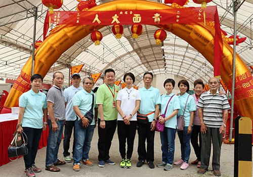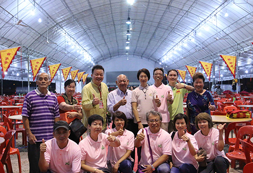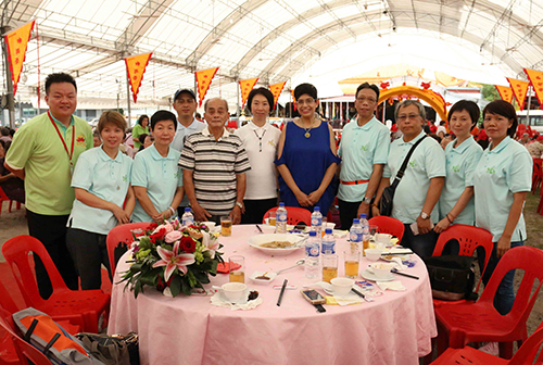 師父、 師伯帶領我們參與金鳳廟慶祝建國五十年免費招待建國先鋒長者的慈善午宴,與新加坡馬林百列集選區國會議員花帝瑪醫生(Associate Professor Fatimah Lateef,右五)及李先生合照。