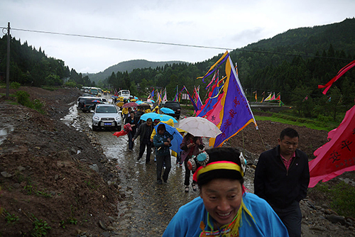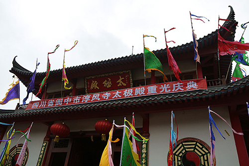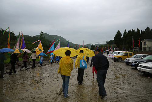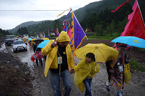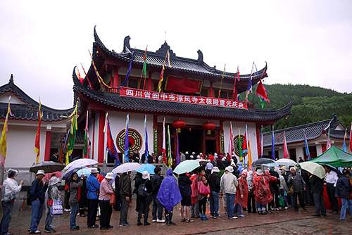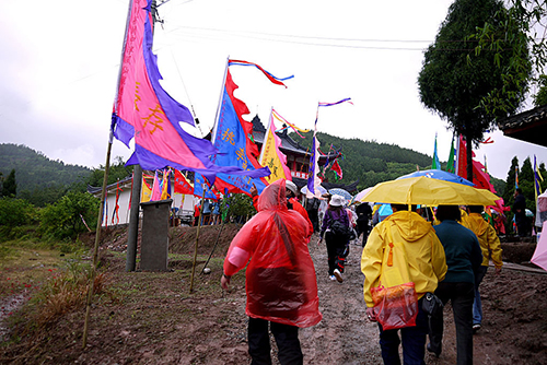 閬中是 祖師爺晚年修道和得道的地方; 師父帶領我們,冒雨踏著難行的泥路上山,參與 淳風寺太極殿開光大典,朝拜 祖師爺。縱使路是多麼的難走,只要與 師父同行……也不覺懼怕,無懼風雨!