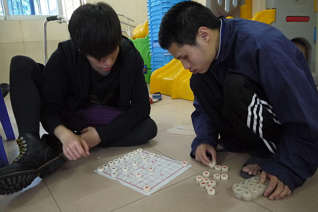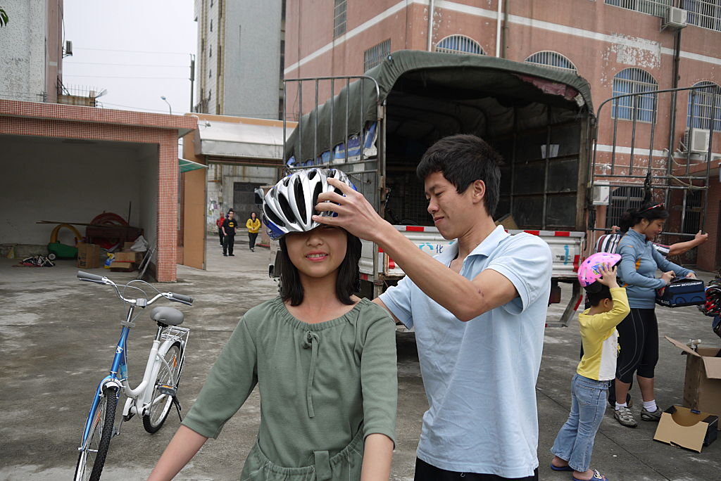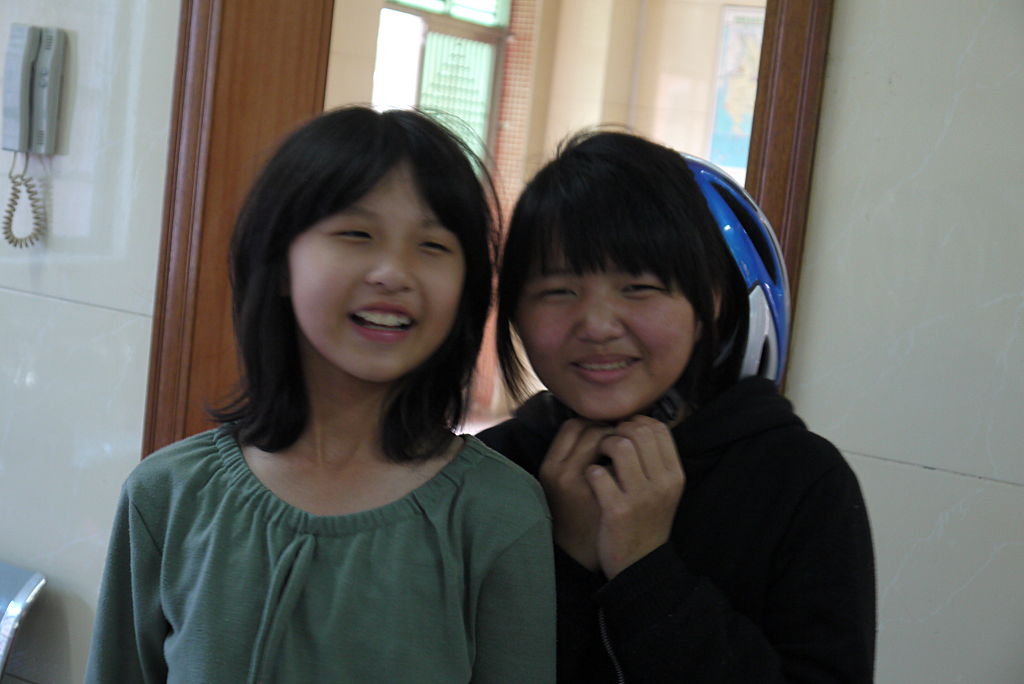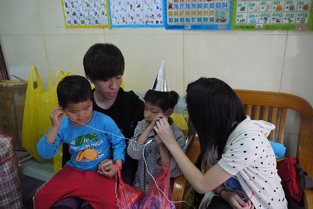 其中一名院童猶如兄長般,細心的為女孩扣上安全帽。