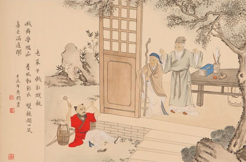 周朝之老萊子,天性至為孝順,奉養雙親,盡擇極甚甘甜爽脆之食品。自己雖行年七十,但從不自稱年老,且時常穿着五彩斑爛之衣服,在雙親之側扮裝嬰兒之遊戲,又常挑水至雙親堂上,故意跌臥地上,學出嬰兒啼哭之聲,以娛雙親。