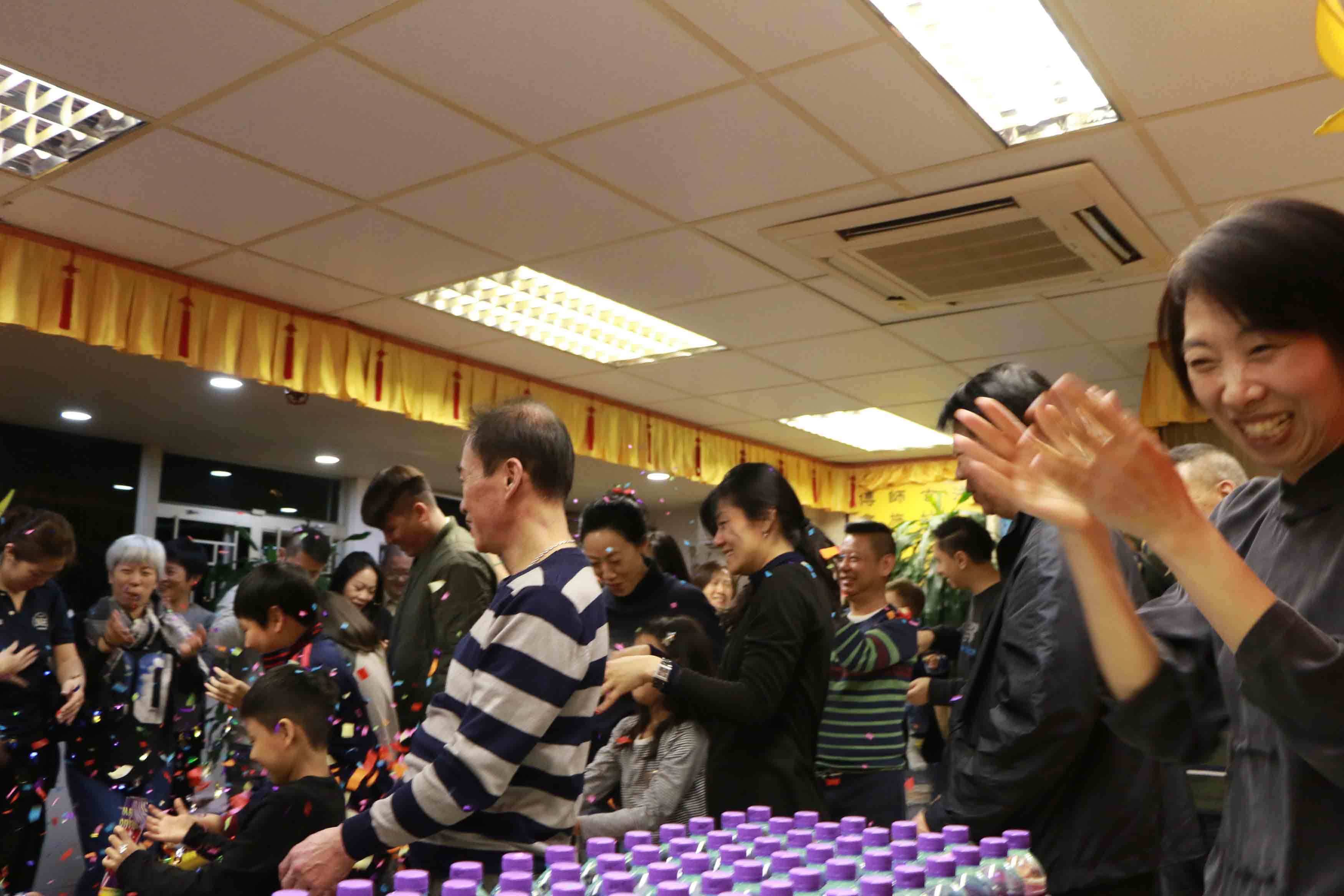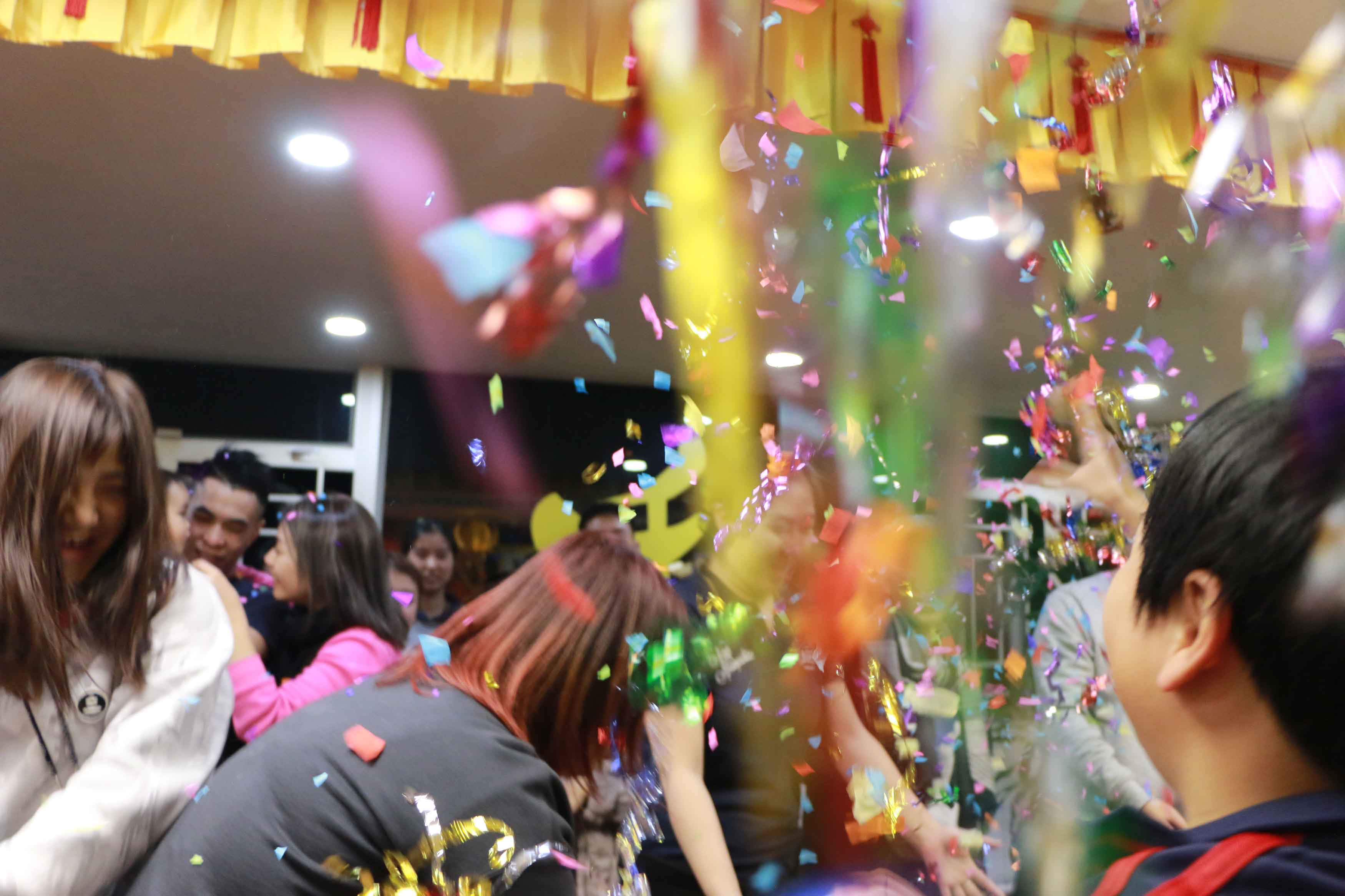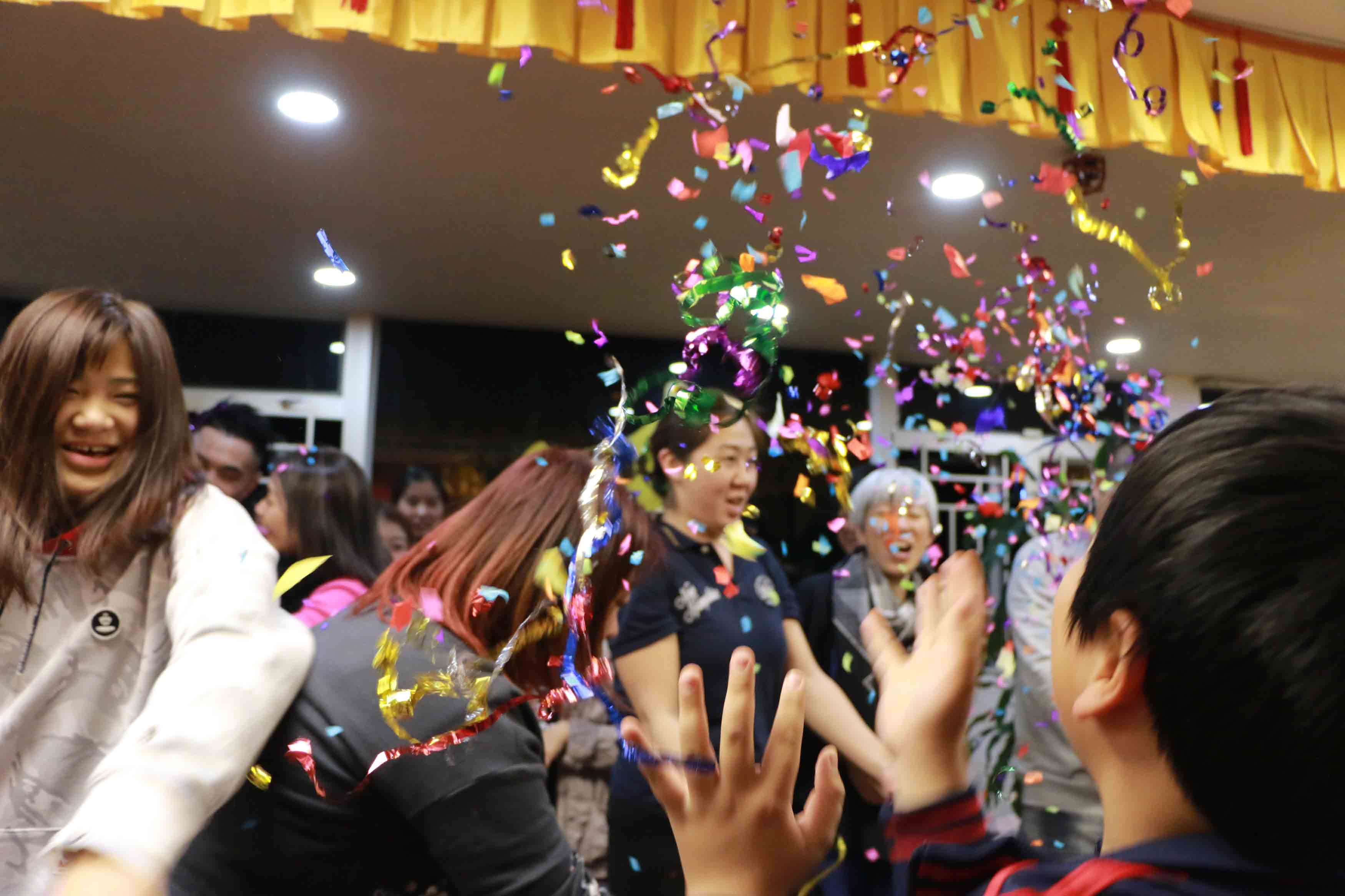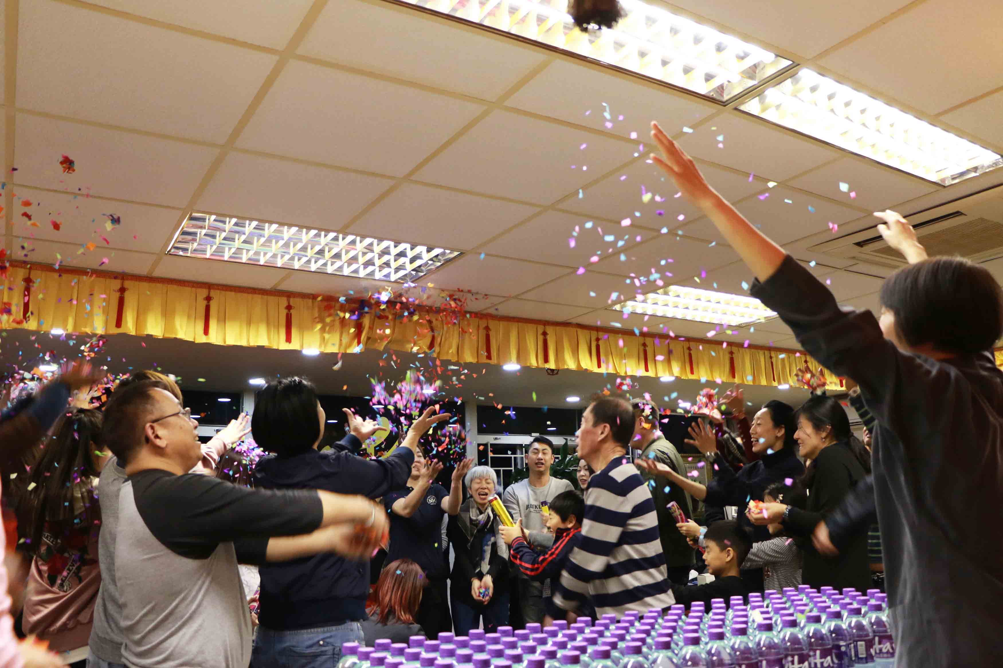 師父今年指示弟子預備「拉砲」、彩色「縐紙」,於完成祈福請神後,邀請在場弟子、善信一起將手中的彩紙用力拋出,喻意來年開開心心、充滿歡樂、事事順利、如彩紙般繽紛燦爛!