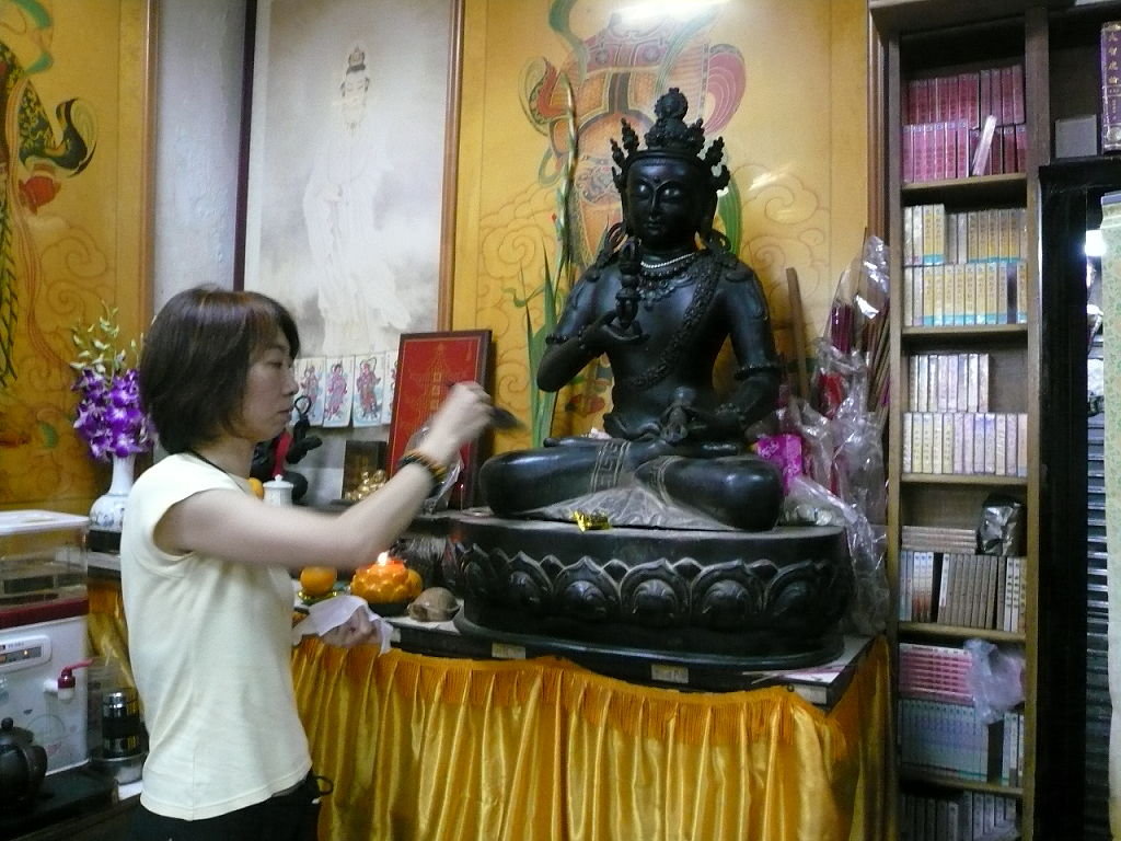 開始清潔像、爐、香筒等…用了太約3小時,手指甲都捆了黑邊。老闆娘很高興,拿了檀香油出來,說用來抹像, 師父再三推卻,但她很熱情的將油倒出來, 師父便開始抹油。