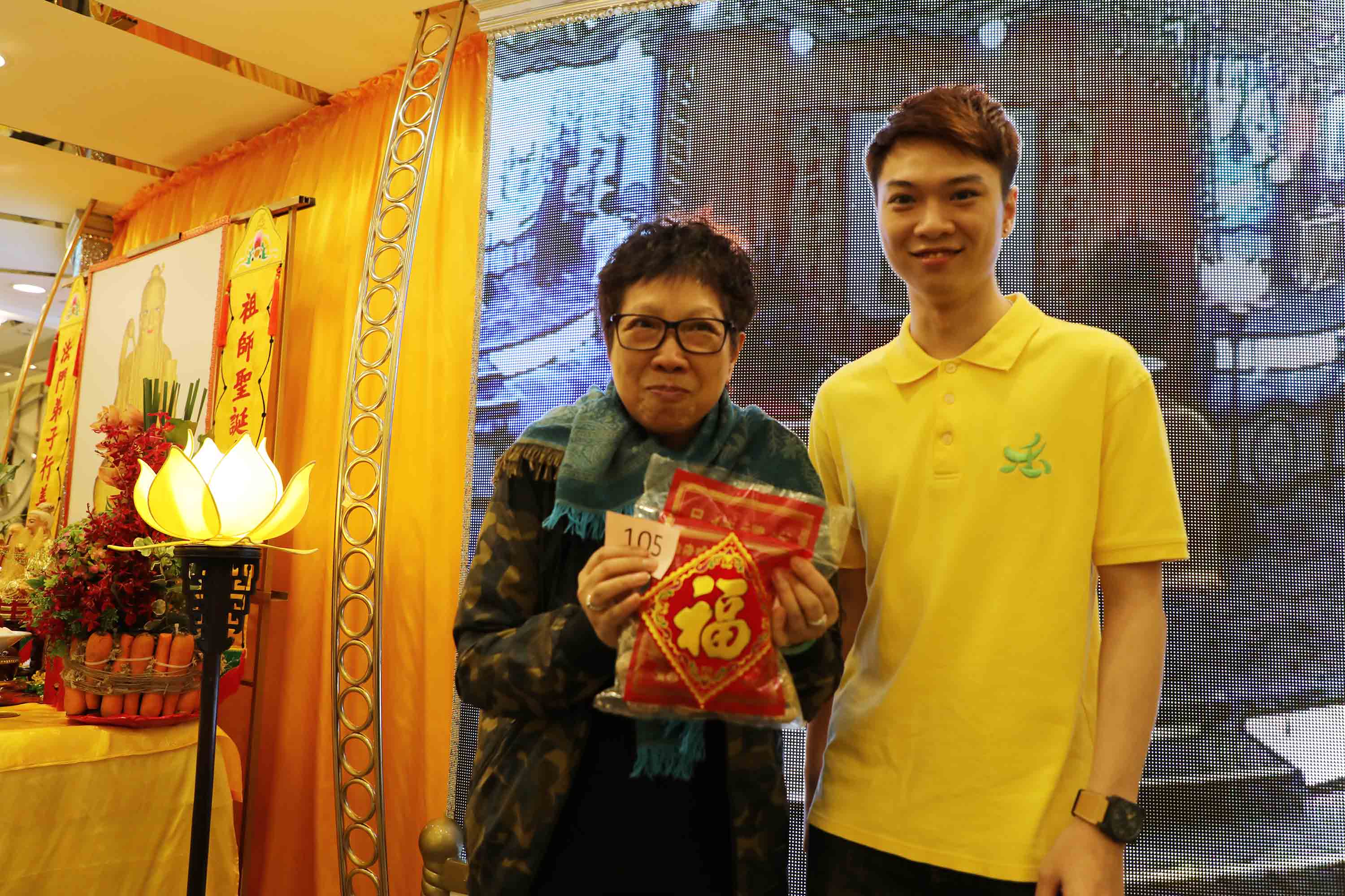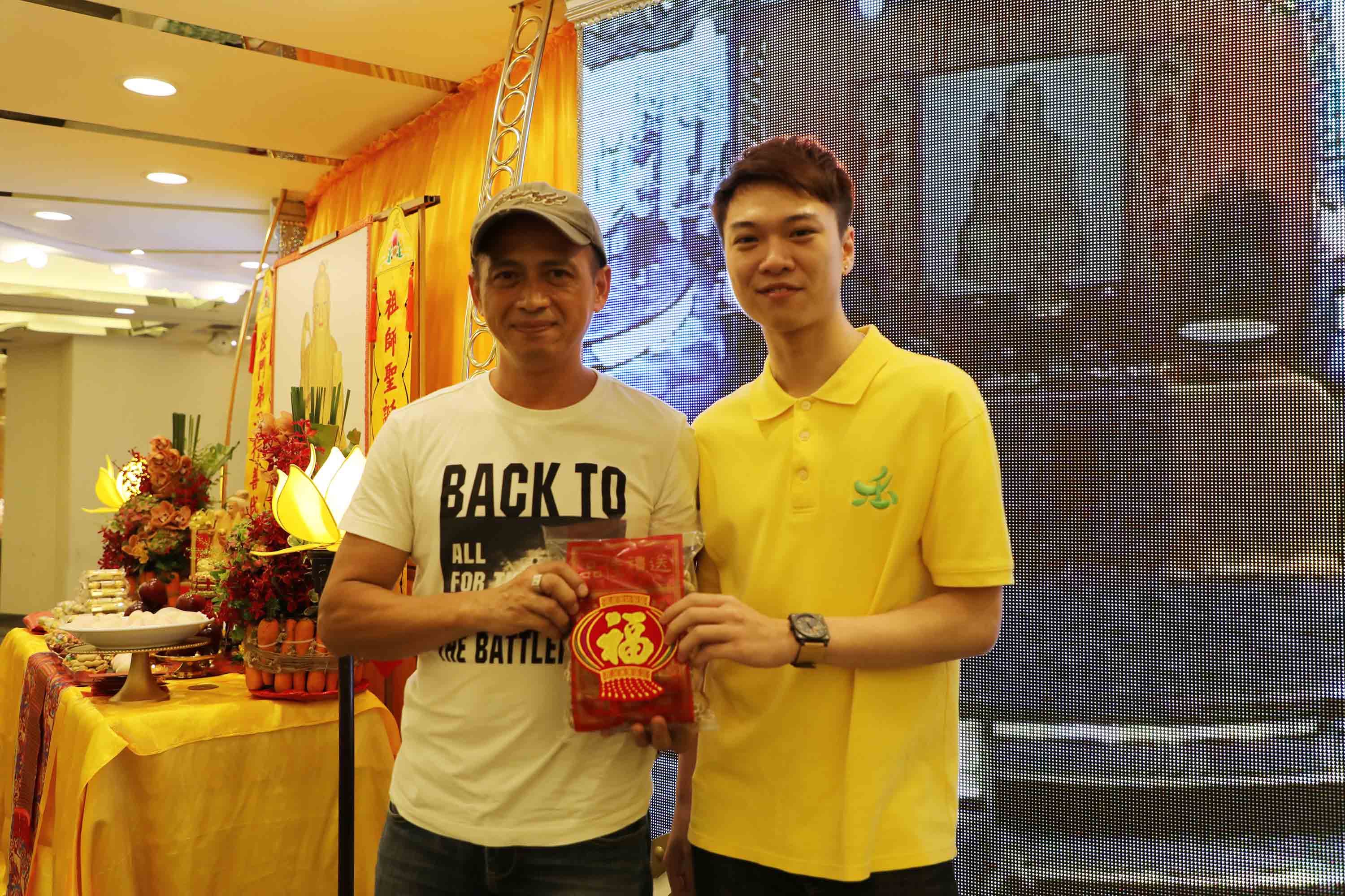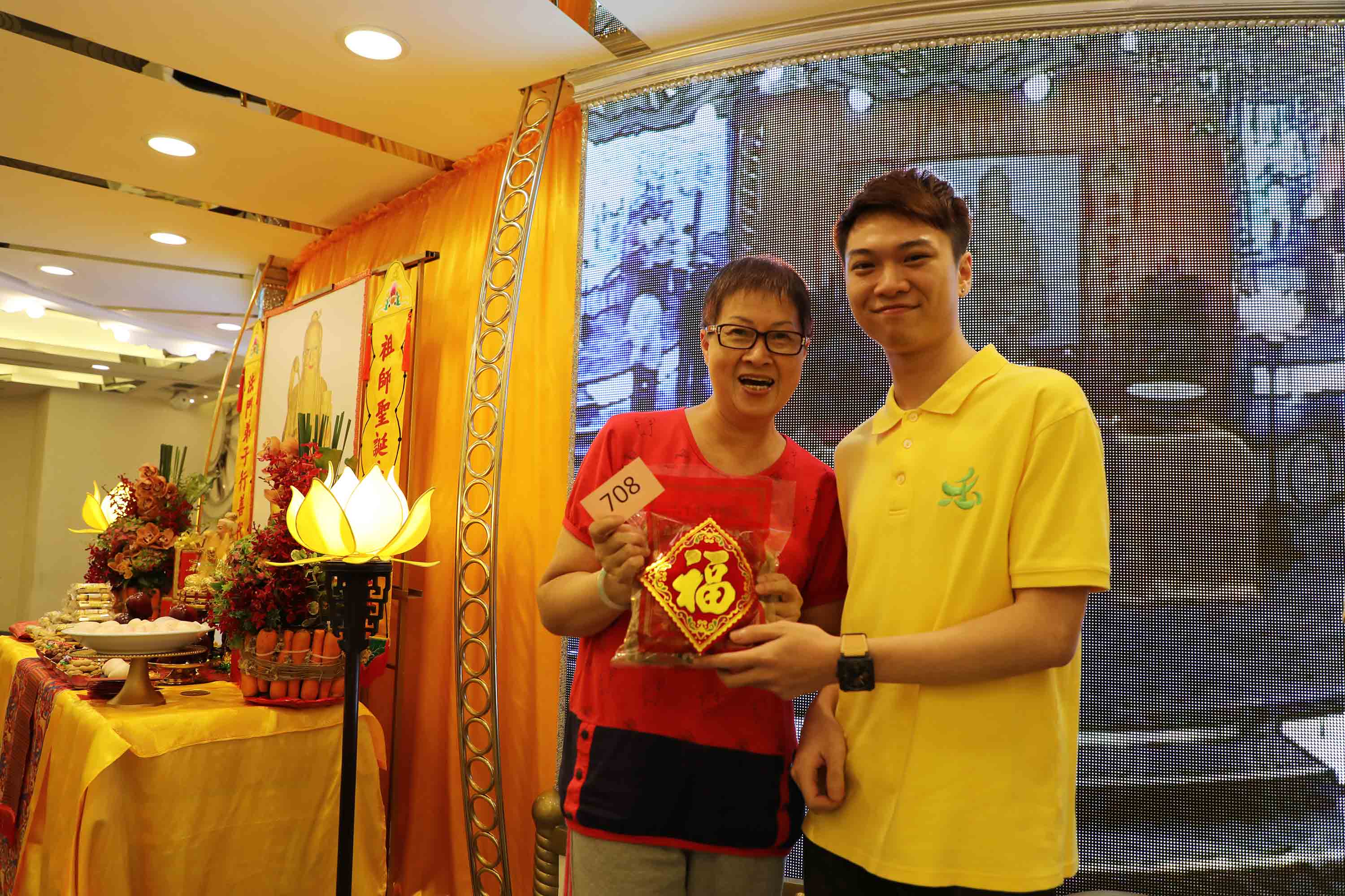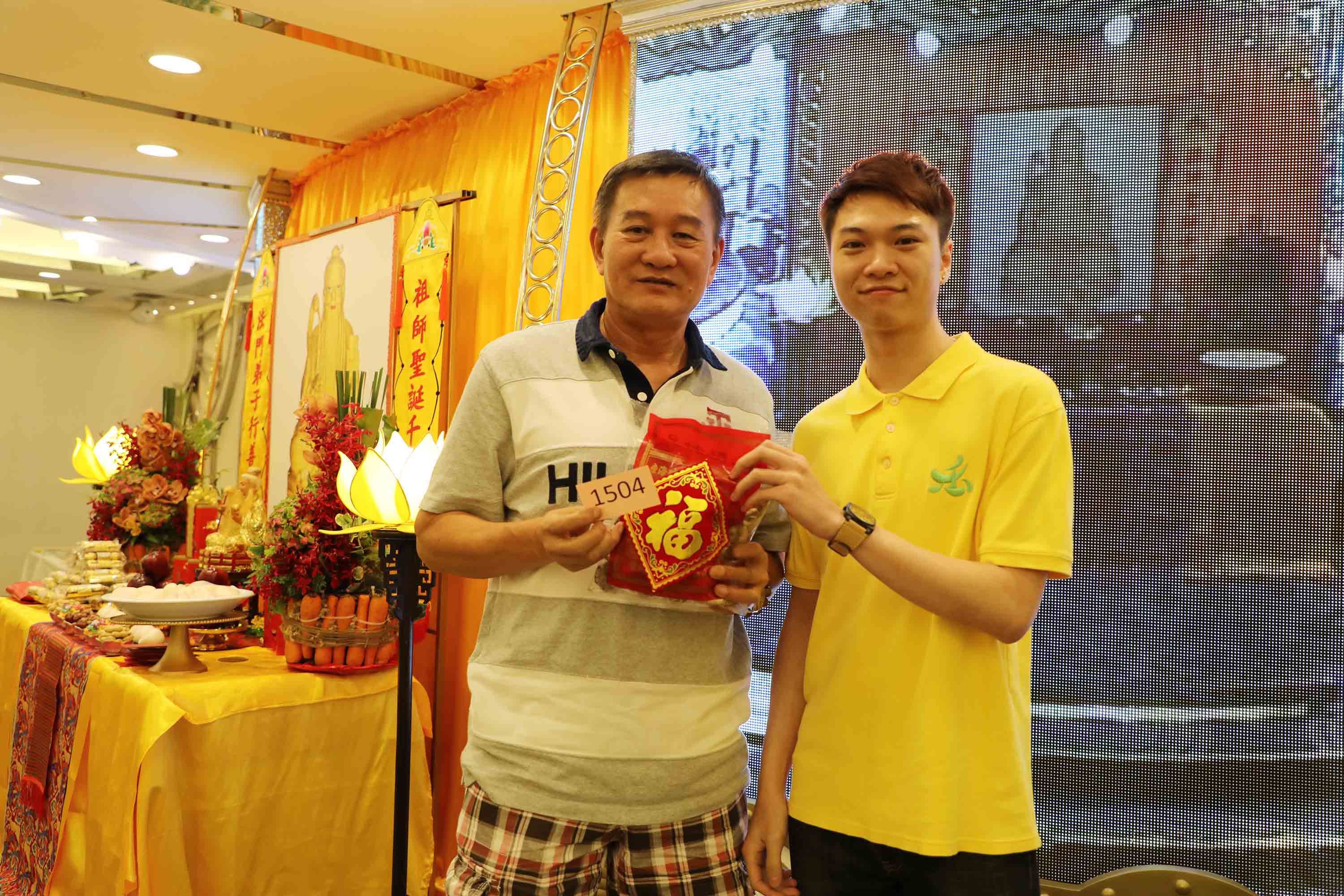 抽獎禮品: 祖師爺開光果皮、冬菇;以及三份大獎:以 法門Logo小袋子袋著、裝有 祖師爺開光茶葉的茶盅。