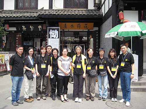 旅程完結前的合照。身後「清水荷花」是成都出名的特色素菜餐廳,位於著名遊客區文殊坊內。