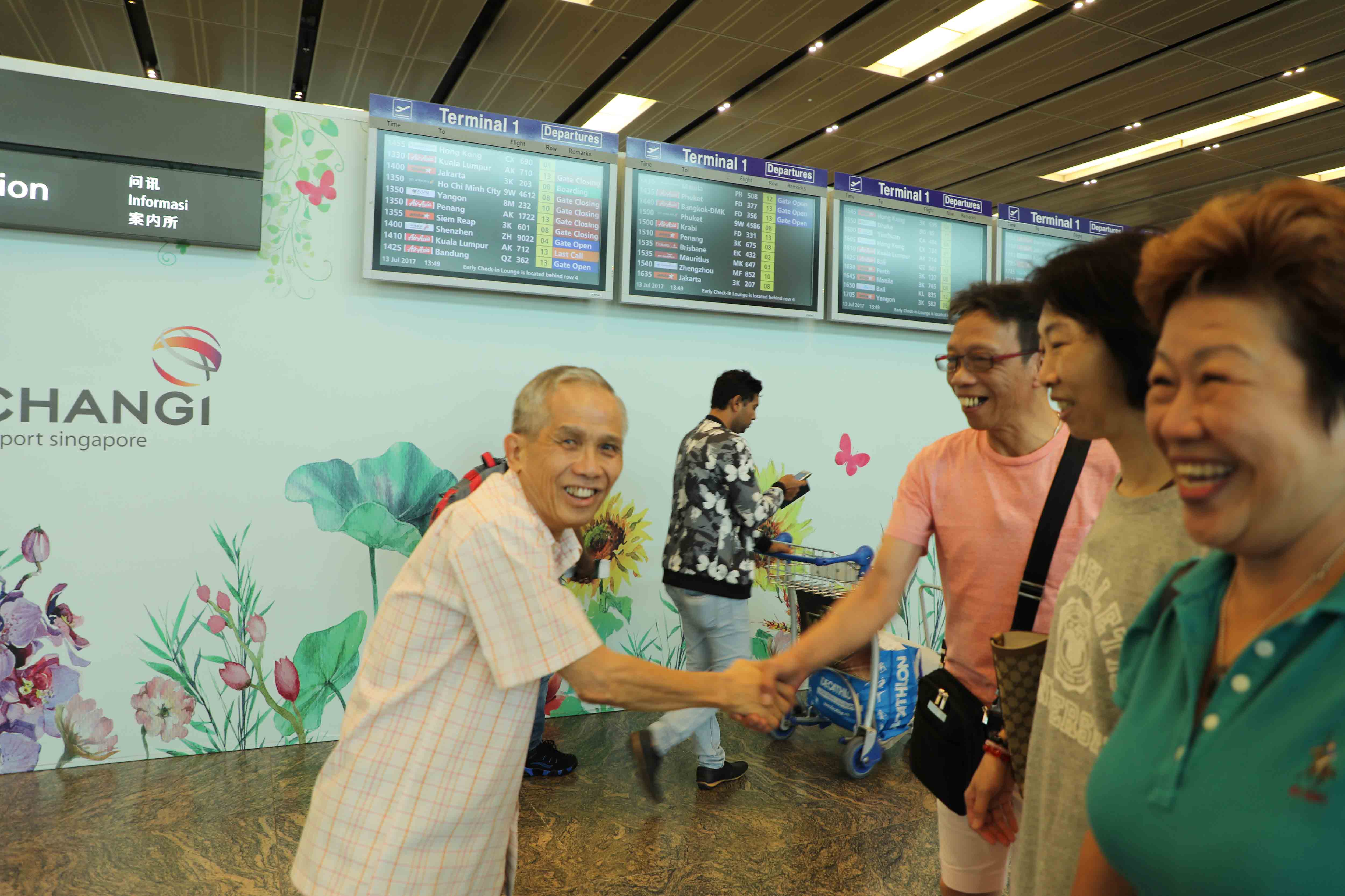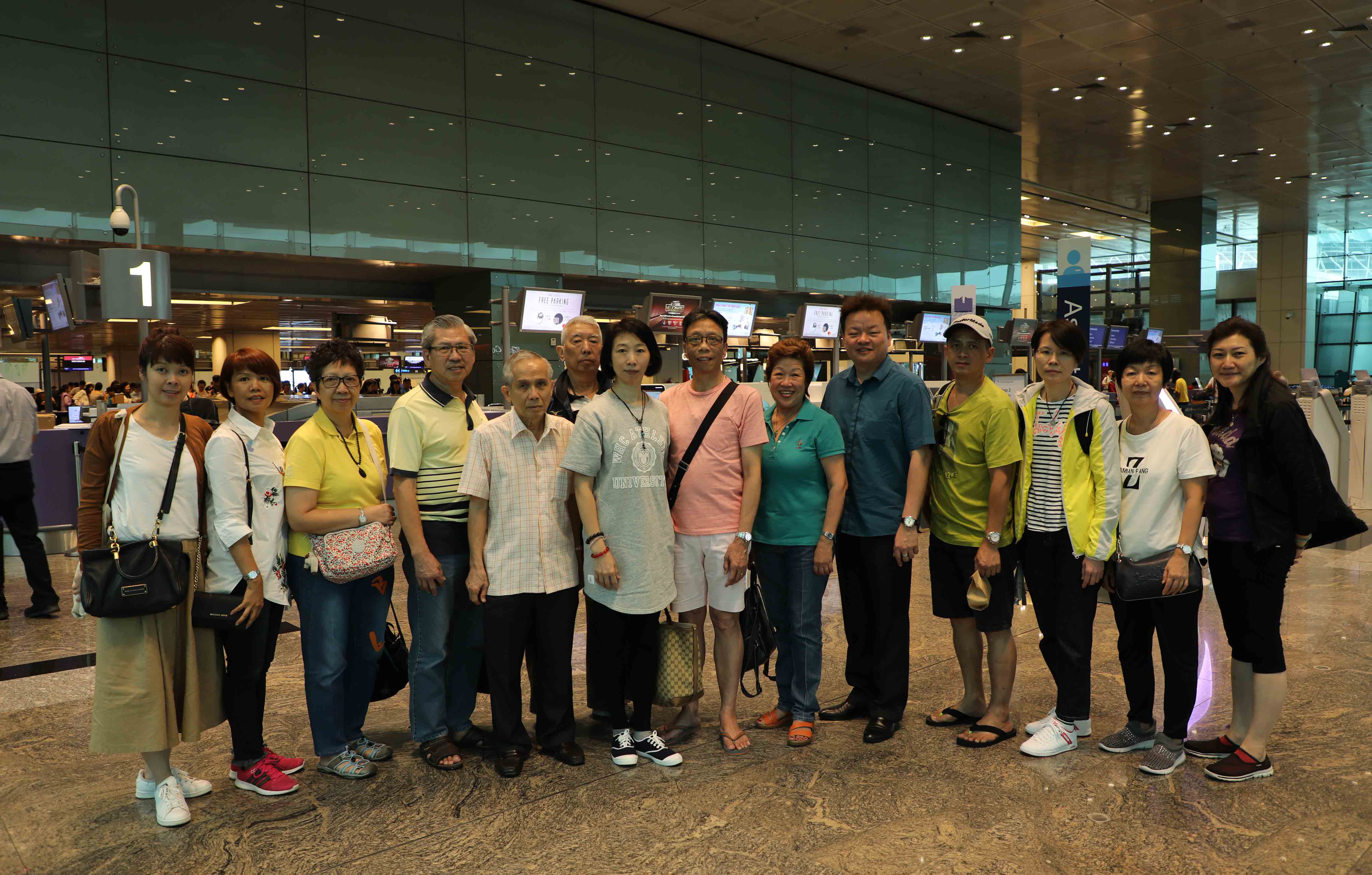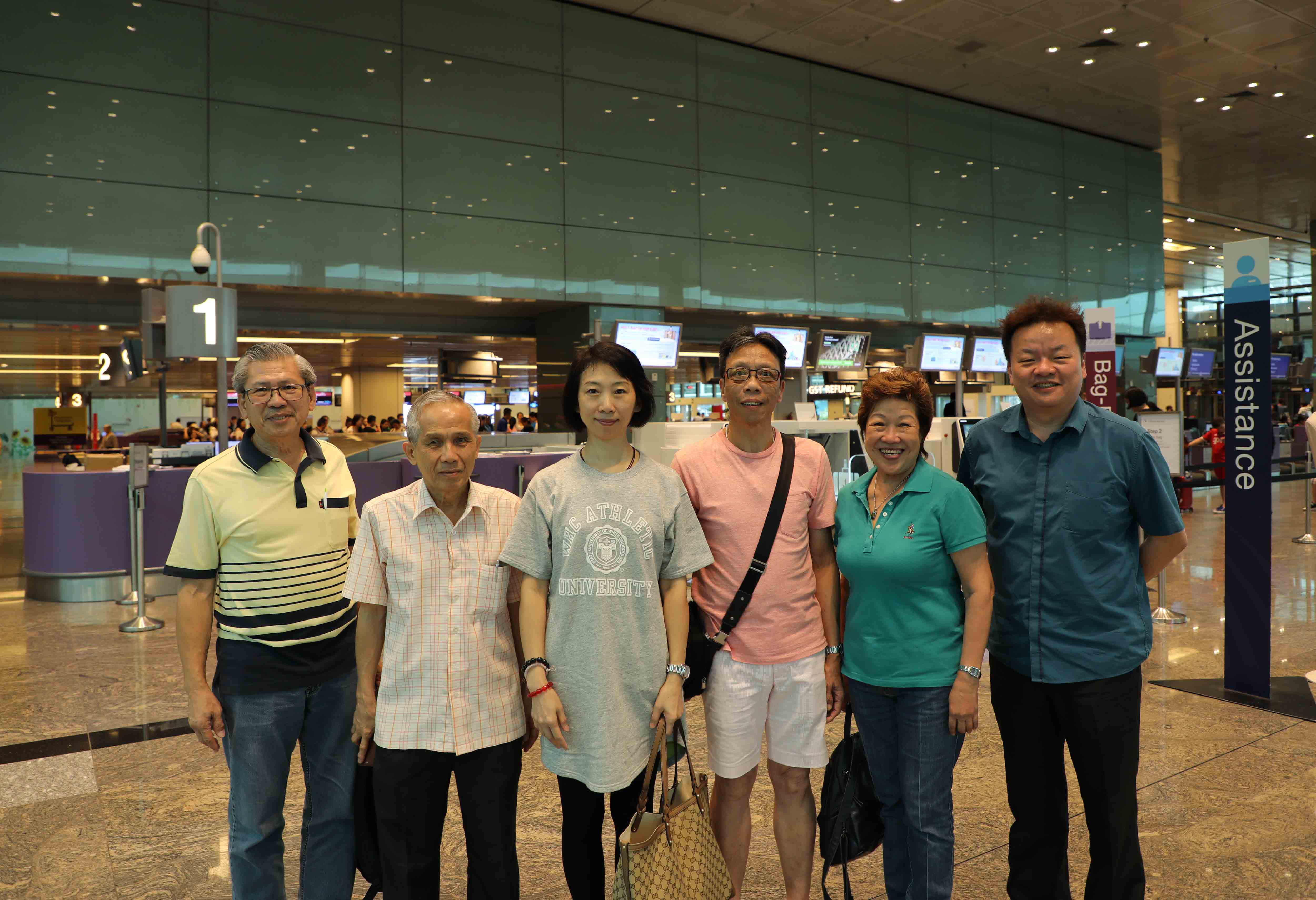 臨別星洲,金鳳廟委員陳先生(左一)、大伯公廟的Helen(右一),特到機場一聚。