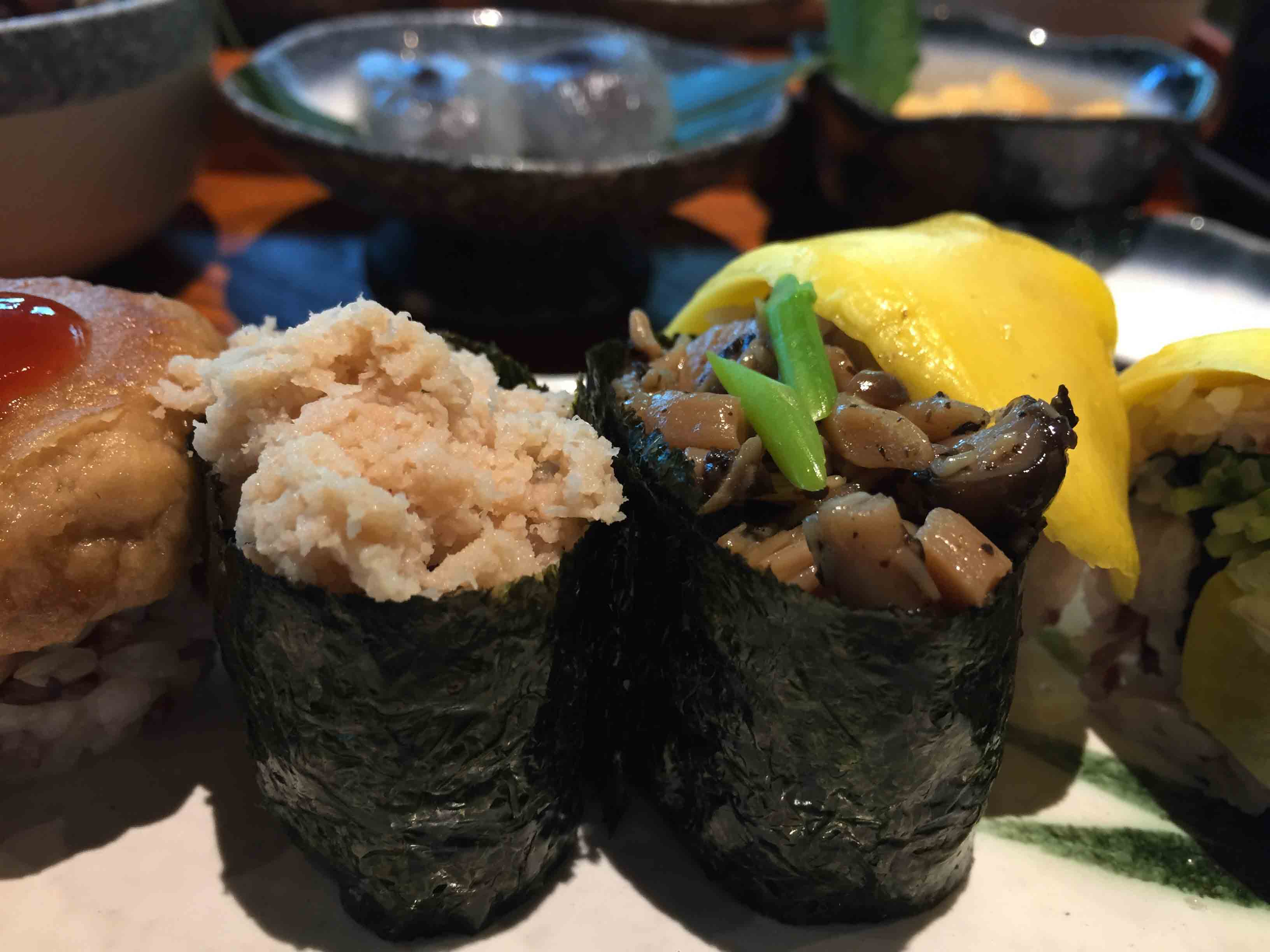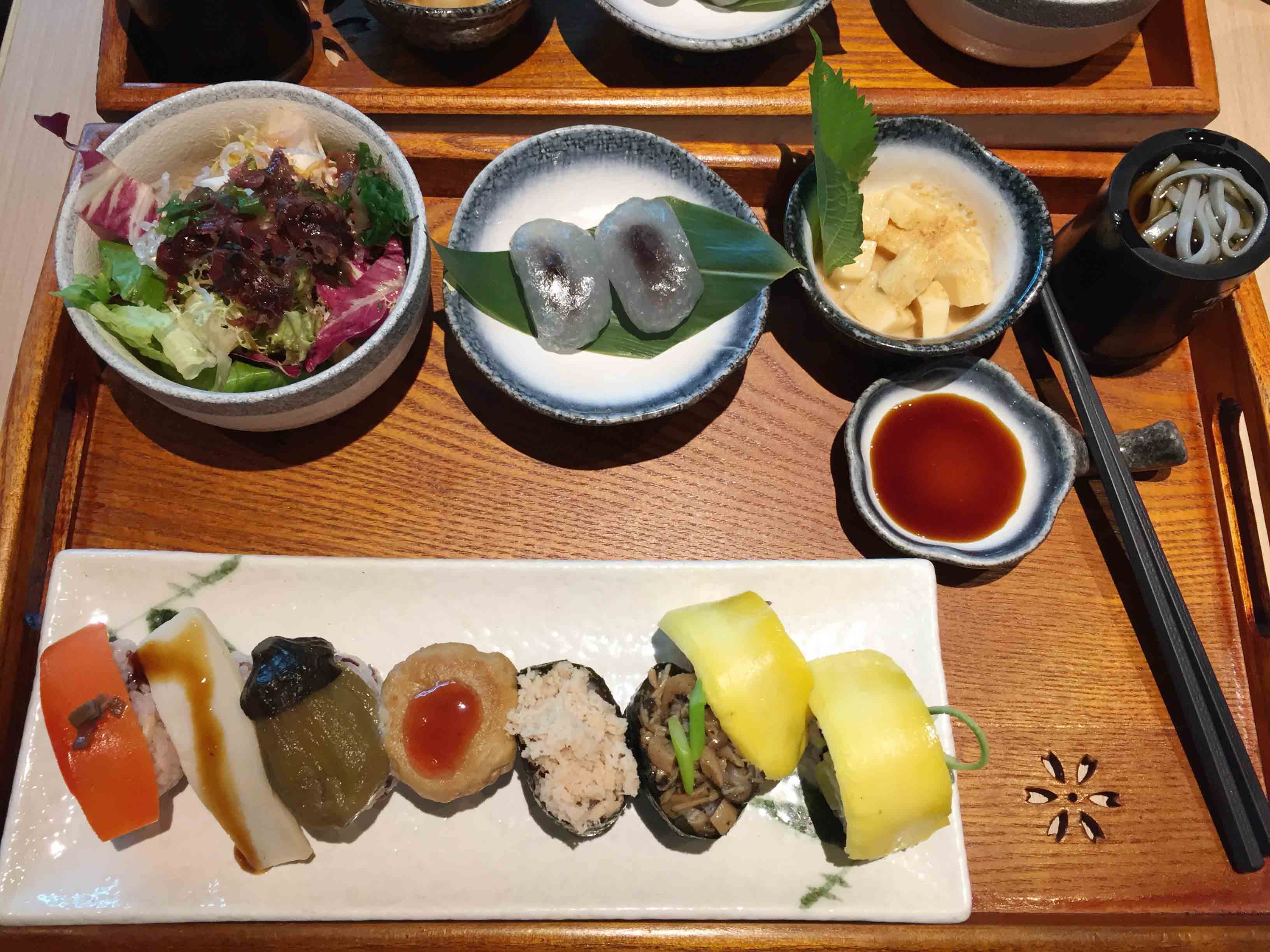 壽司以蔬菜作材料,例如茄子、露荀、雞脾菇、淮山蓉、素肉雞片、芒果片等。