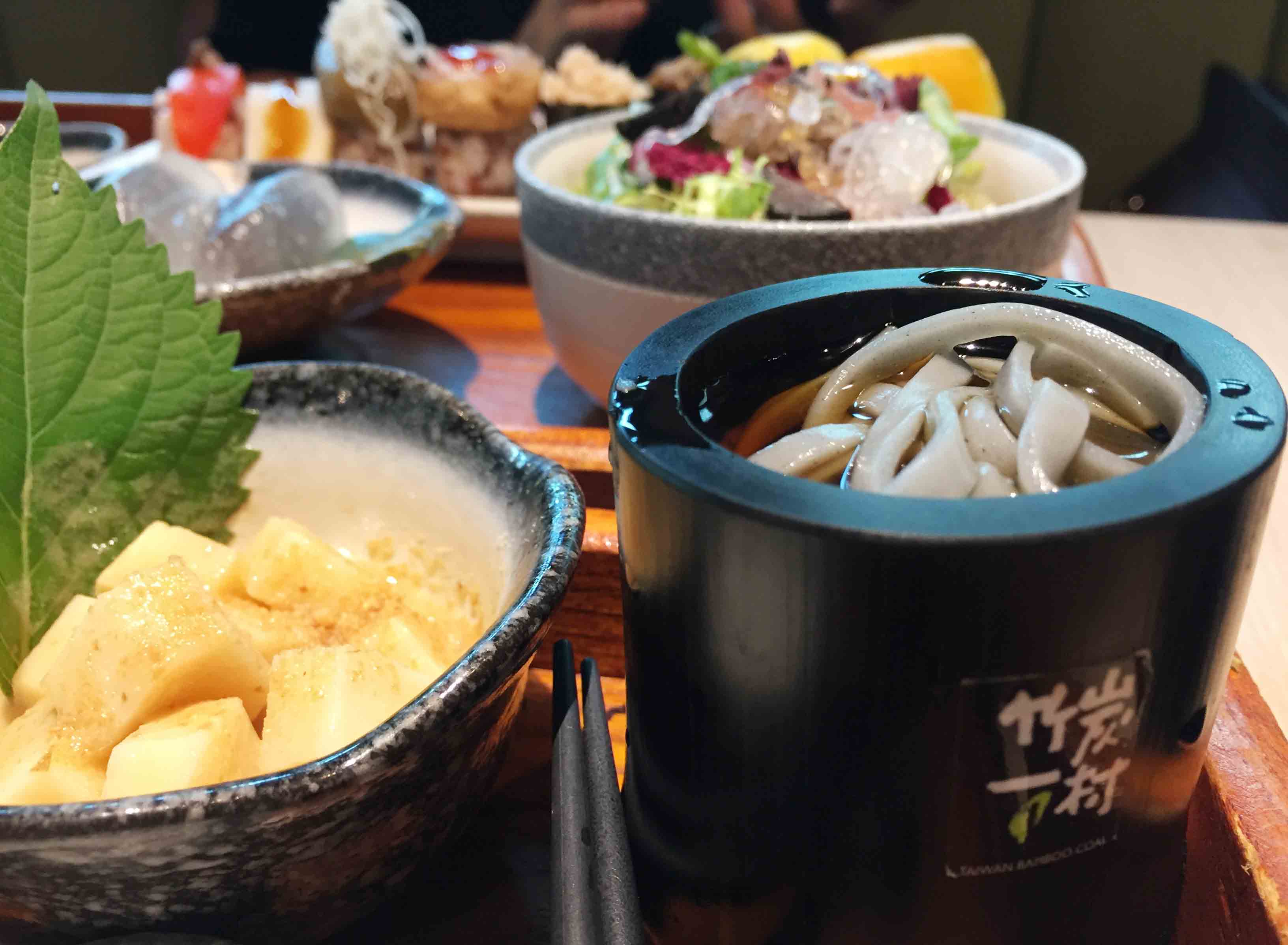 竹炭杯一口冷麵和涼拌亞麻籽藥丁。