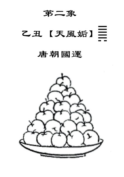 這是一幅概括唐代江山大勢的圖象。盤子裡放了二十一個梨子。梨諧音李,暗示唐代傳二十一位皇帝,繁榮強盛。「莫明其數」,暗示武則天稱帝可算可不算;第四個果沒有果柄,是說唐中宗的權柄失落了。「萬物土中生」,李唐開國 (618年,即戊寅年,戊為土) 於土年,有「中土大唐」之稱。從唐代建國到滅亡,共是290年,就應了「二九先成實」的頌詞。「一統定中原」,指唐朝統一天下,強盛而不霸道,「陰盛陽先竭」,從武則天稱帝後,女人干政亂政,國勢步步衰竭。