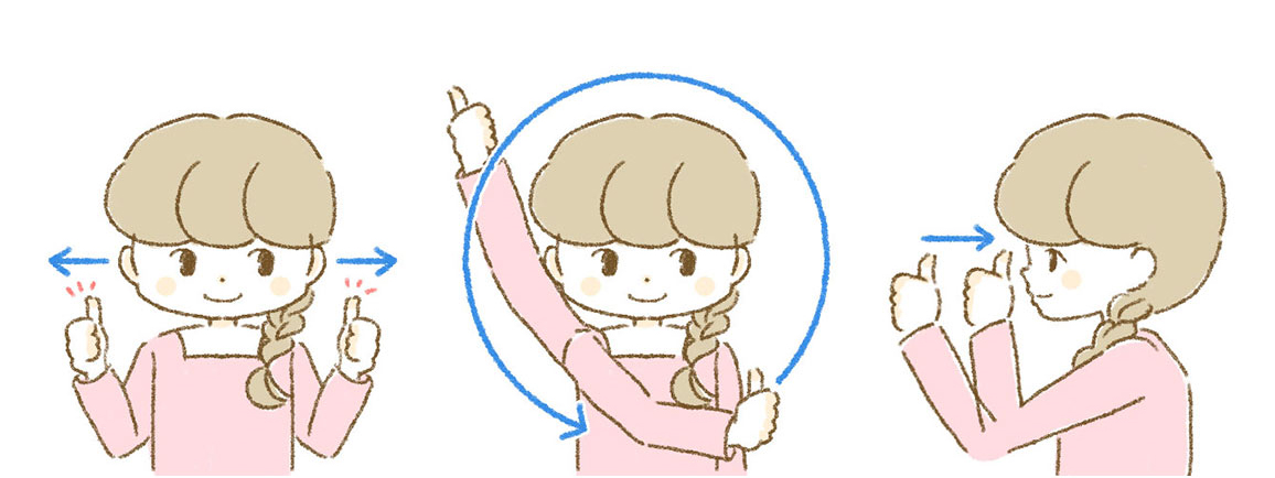 - 食指向上移動,之後,食指順時針方向慢慢畫大圓,眼球跟隨指尖轉動 (脖子不要動)。
