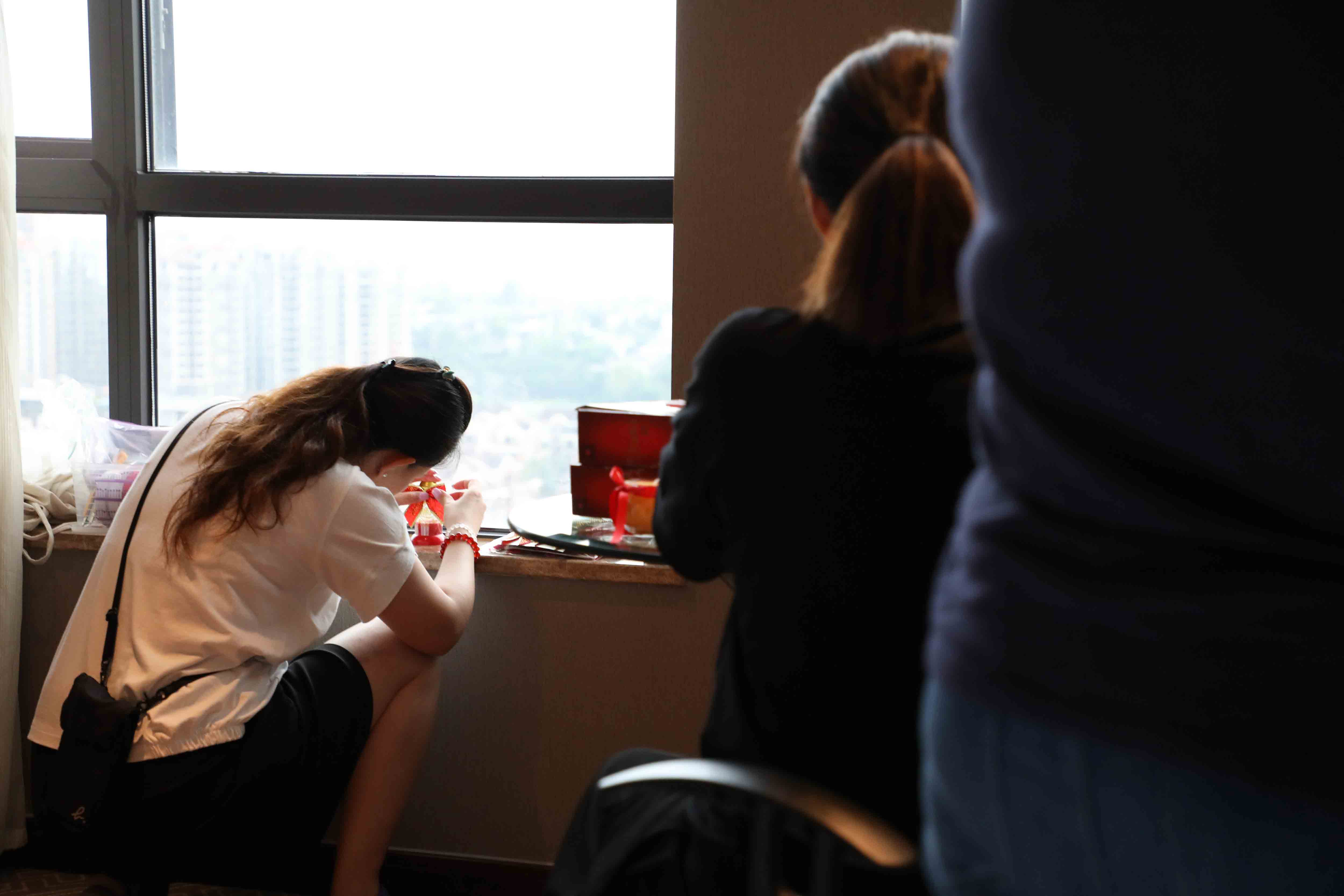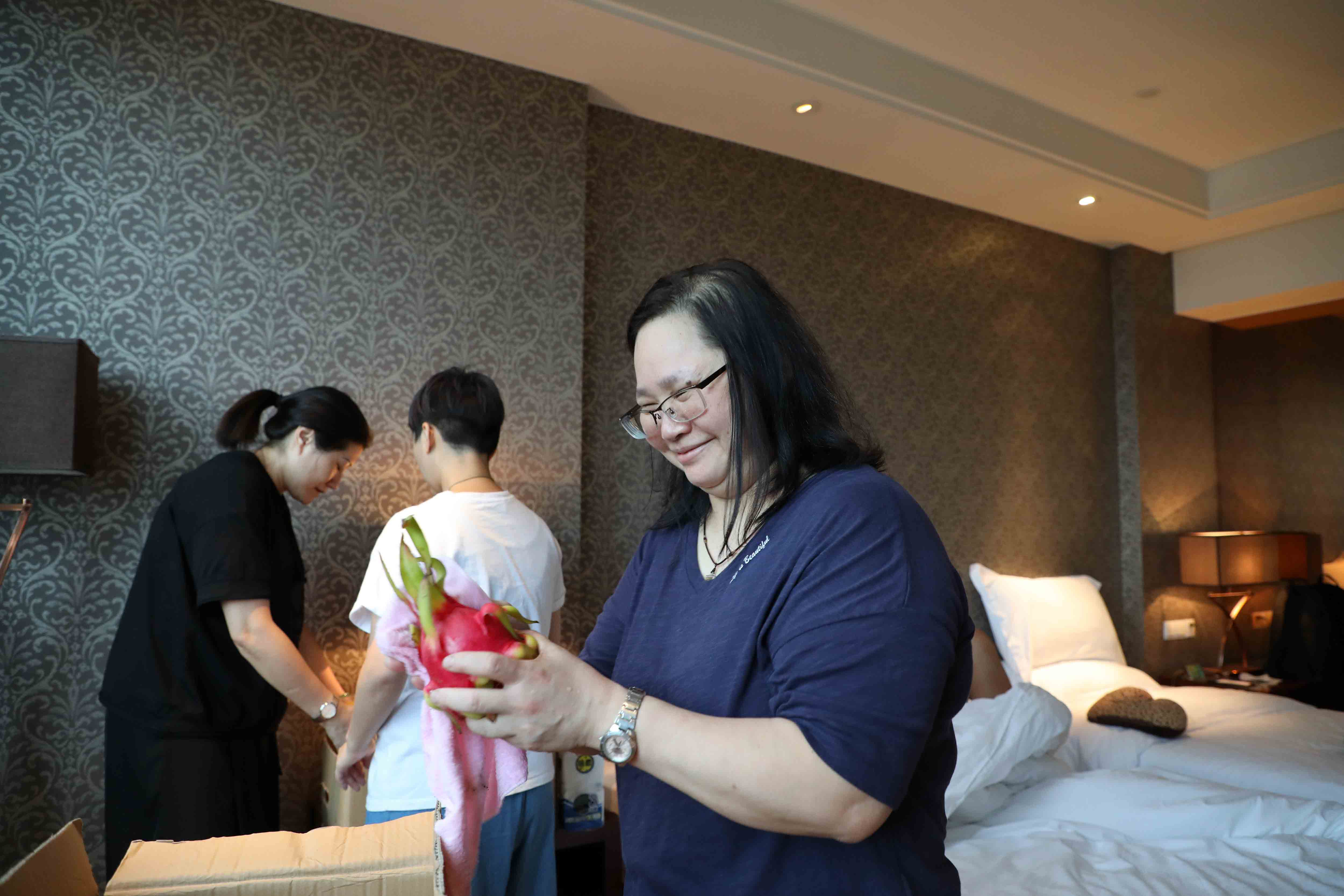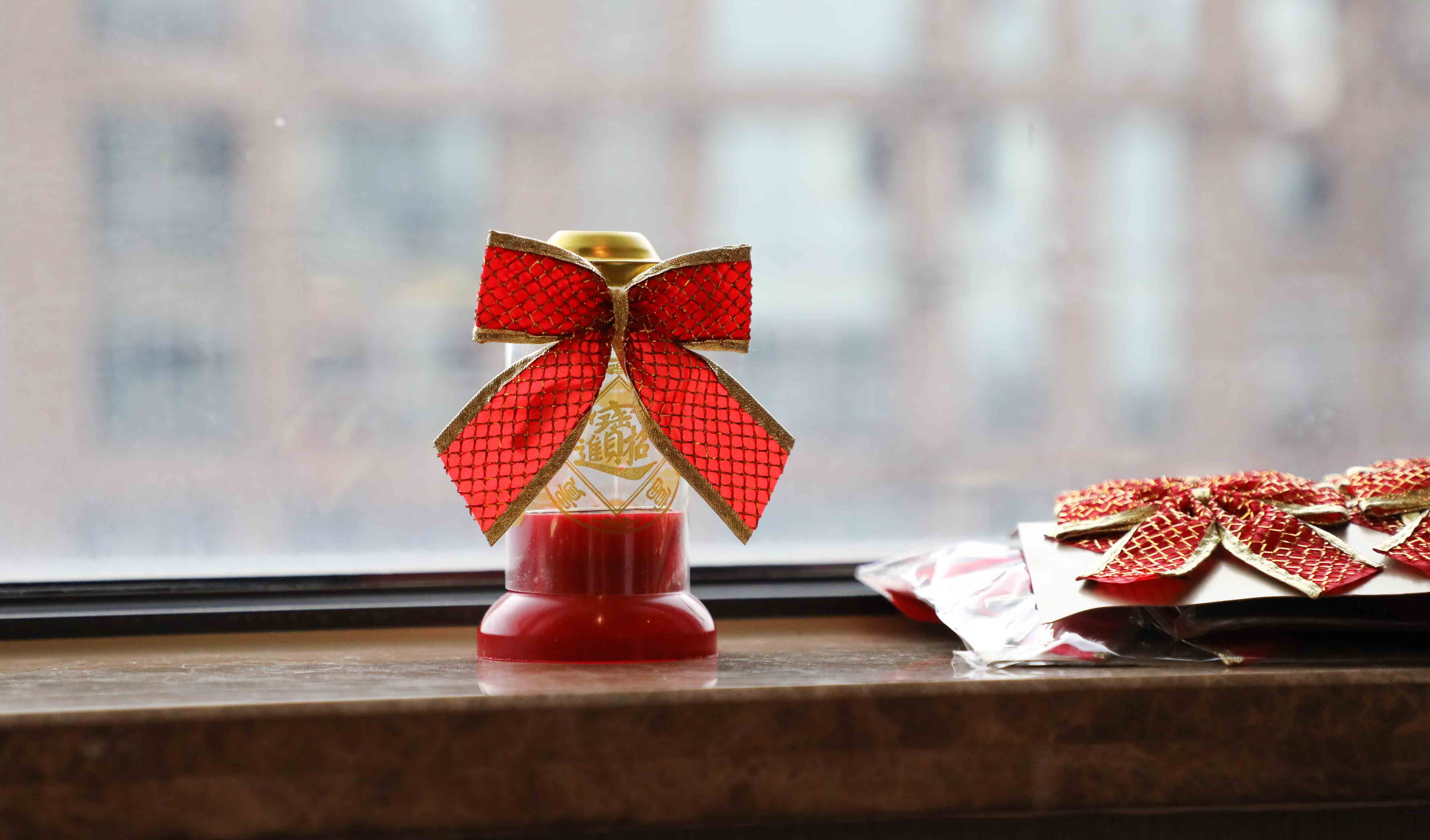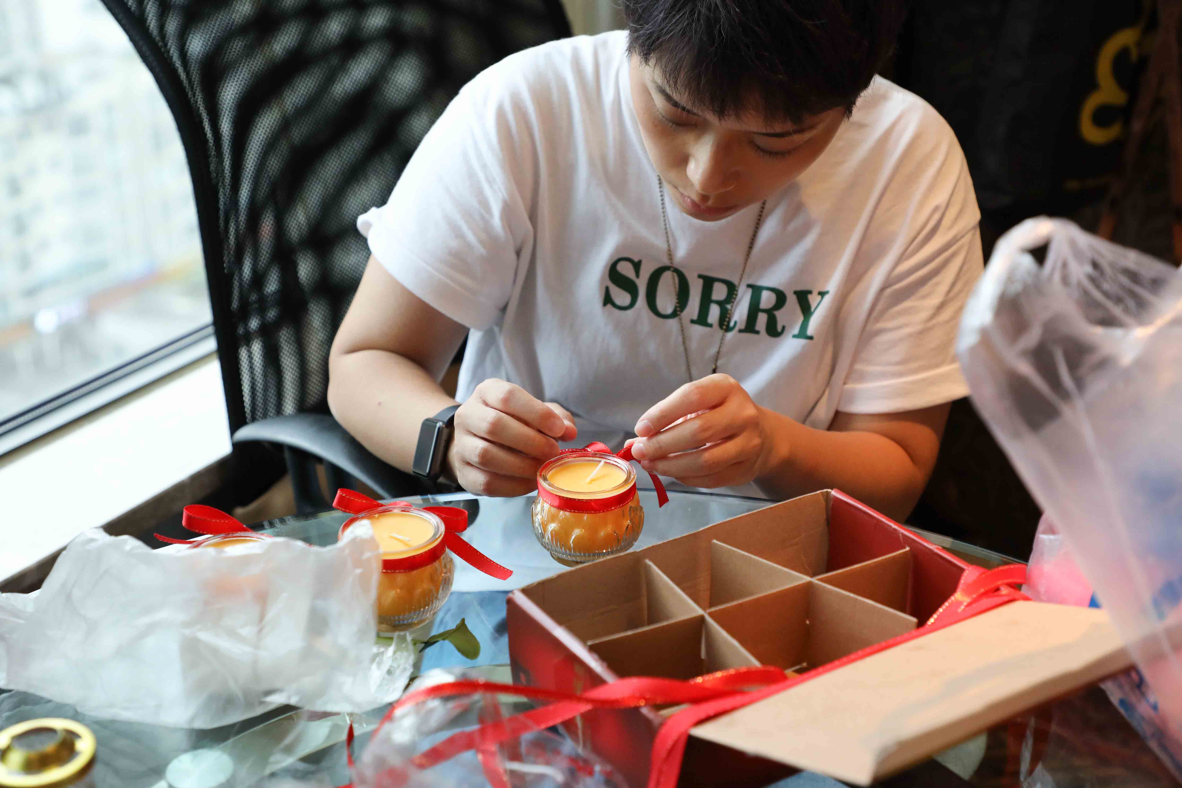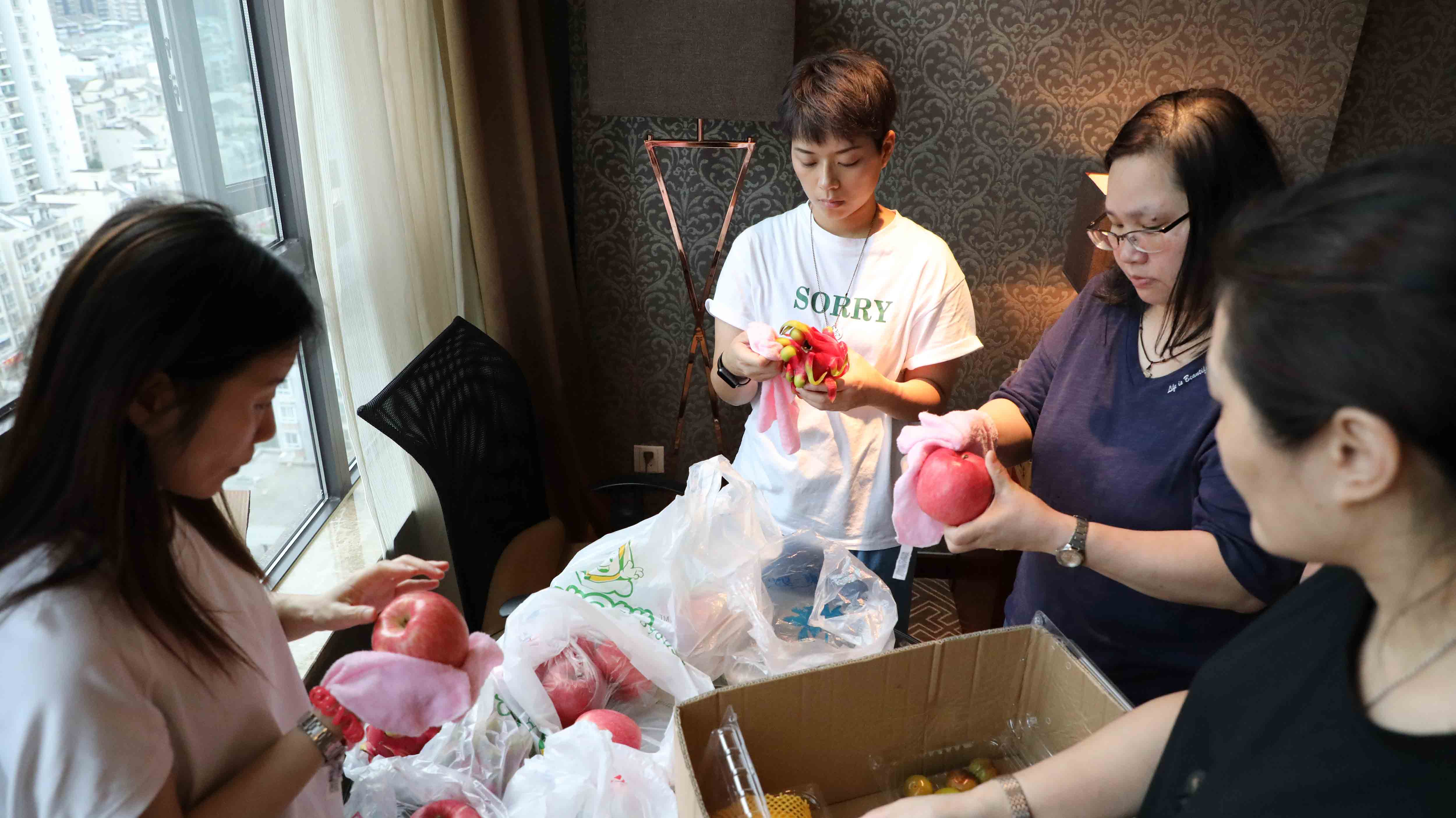 按照 師父的教導,眾弟子逐一以柚葉清抹貢杯、貢碟、鮮果、紅棗、蓮子、花生和彩糖,並以紅絲帶莊嚴果蠟,為明天的賀誕做好準備。