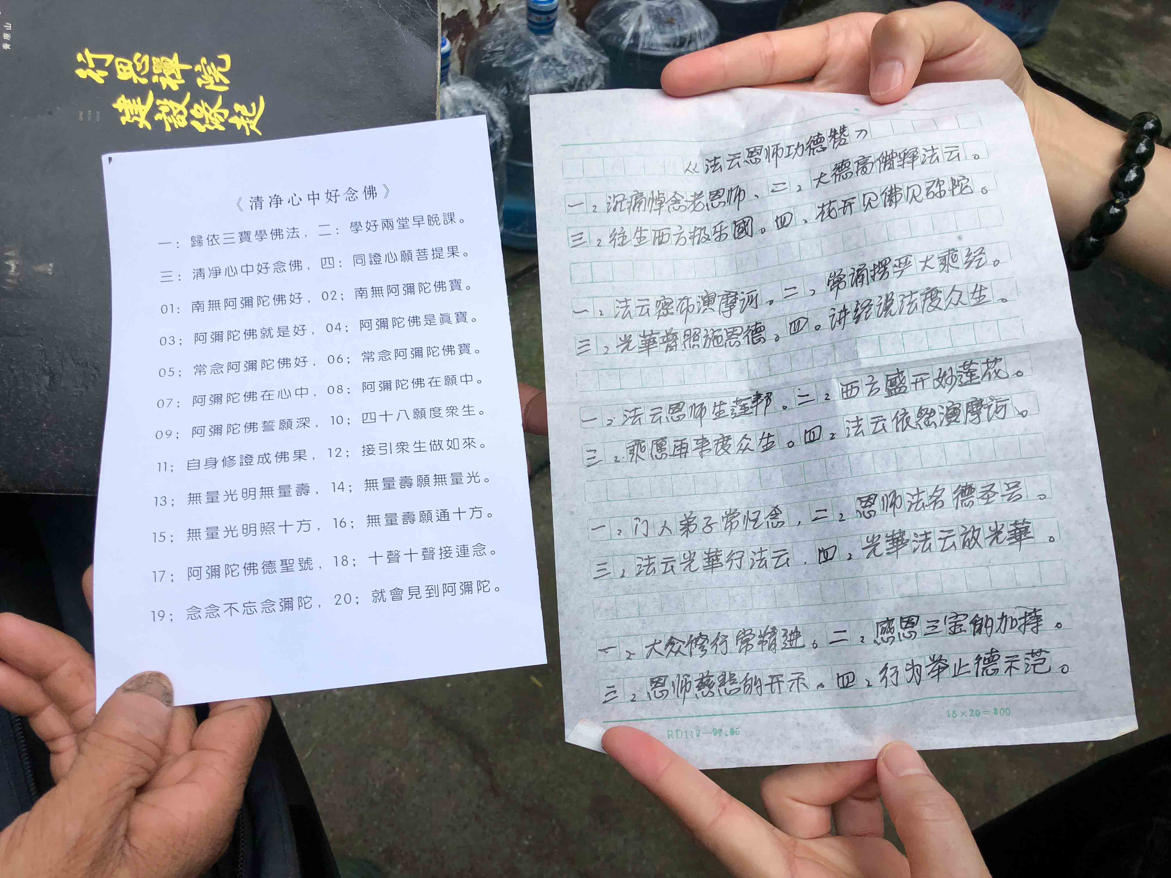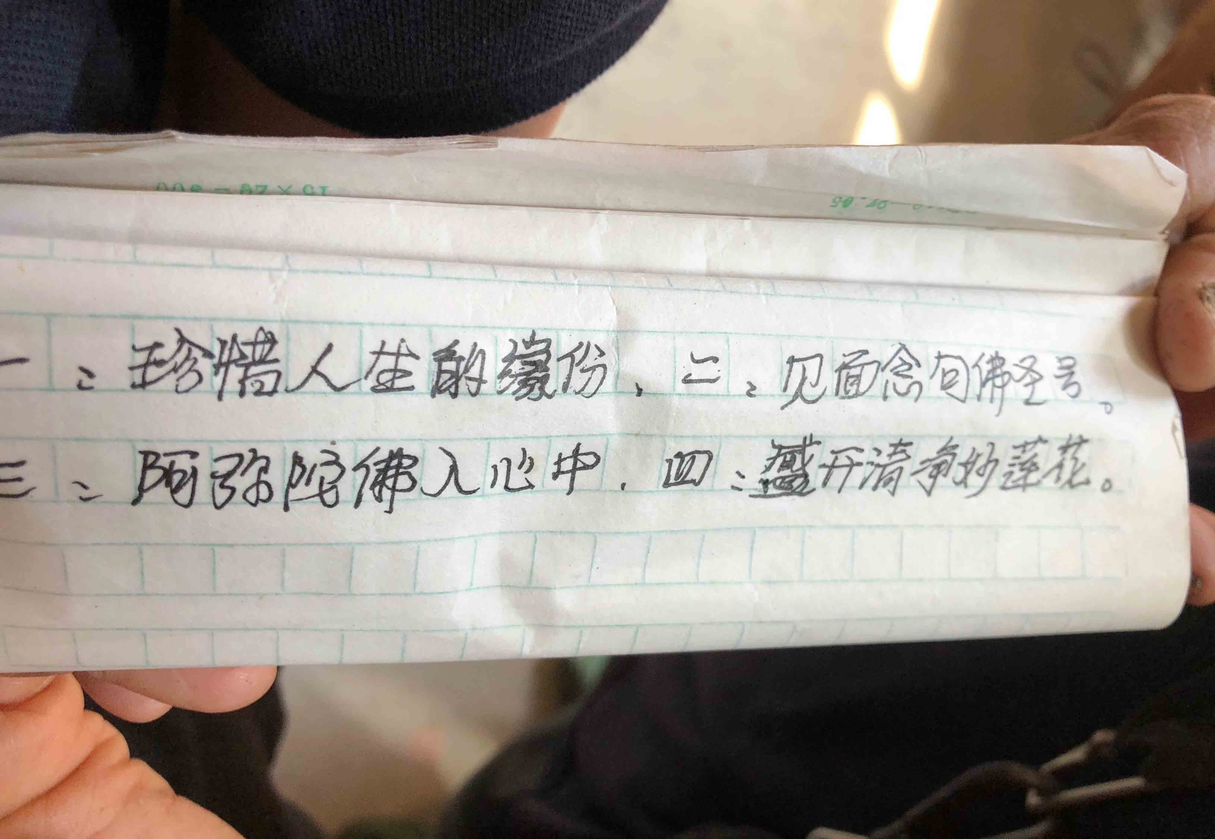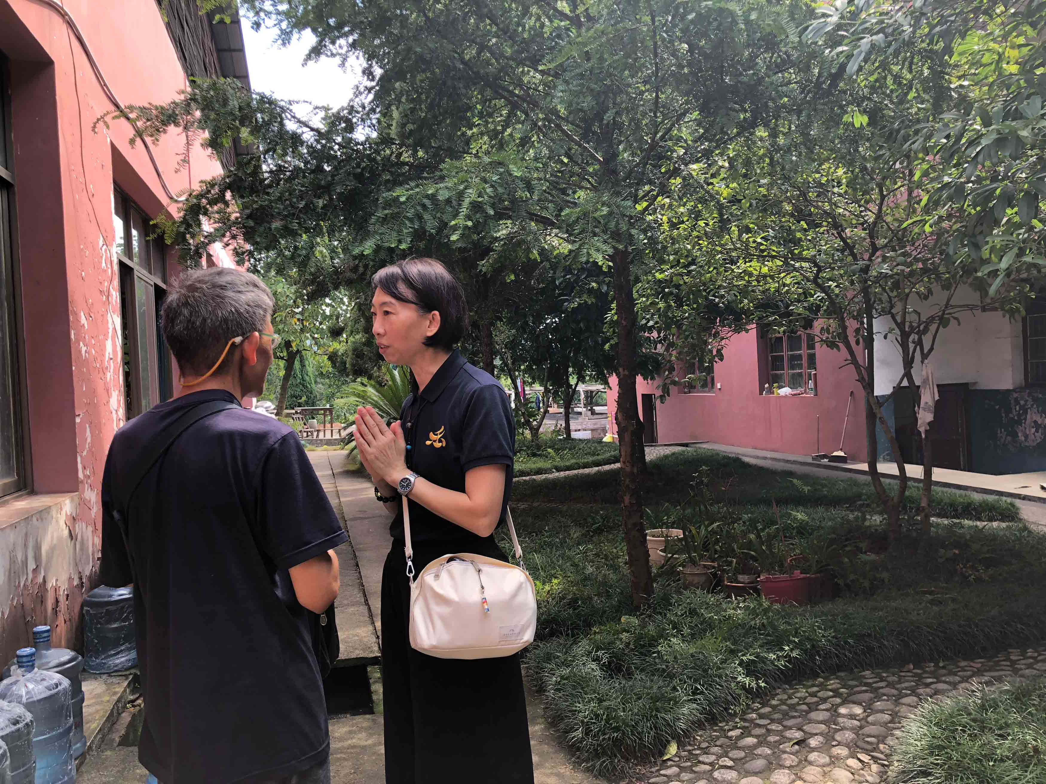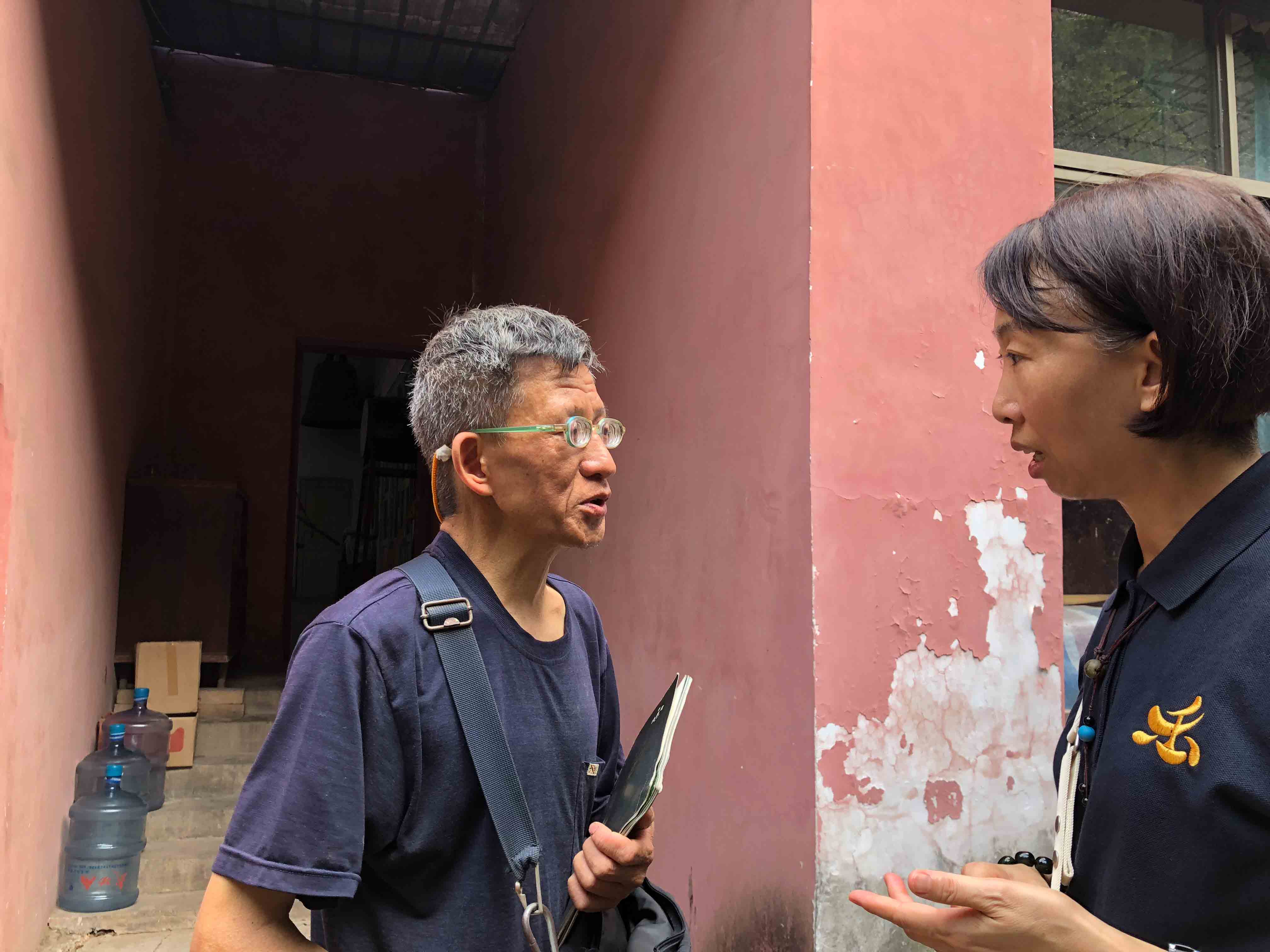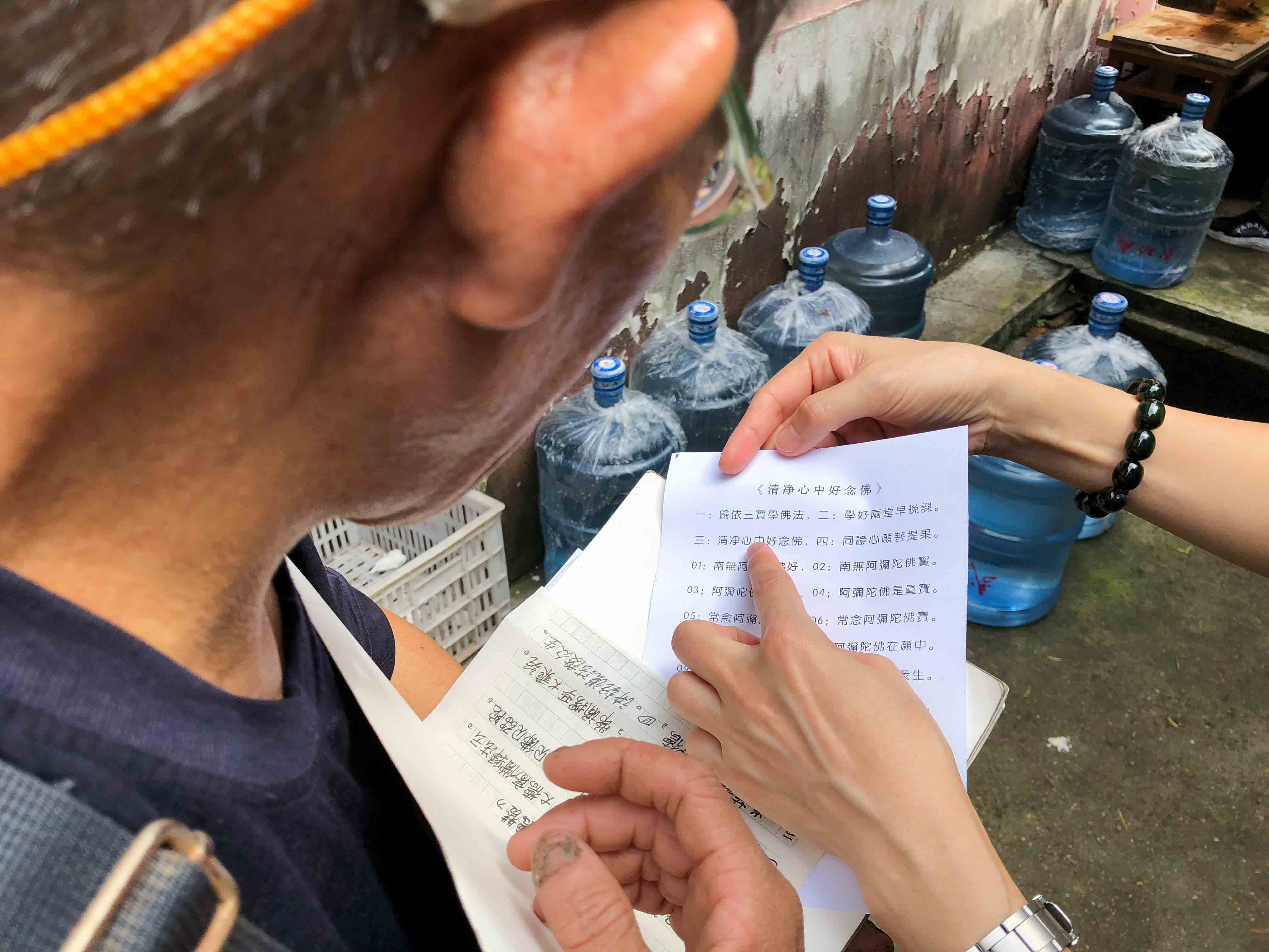 上法下雲法師的追思法會小休期間,當地村民俞先生看到 師父,便走過來與 師父傾談。54歲的俞先生說一般可稱呼他「小俞子」;小俞子說以前他膽子很小,十多年前在金輪寺接觸到《彌陀經》,之後開始每天誦念,便不再感到害怕了。