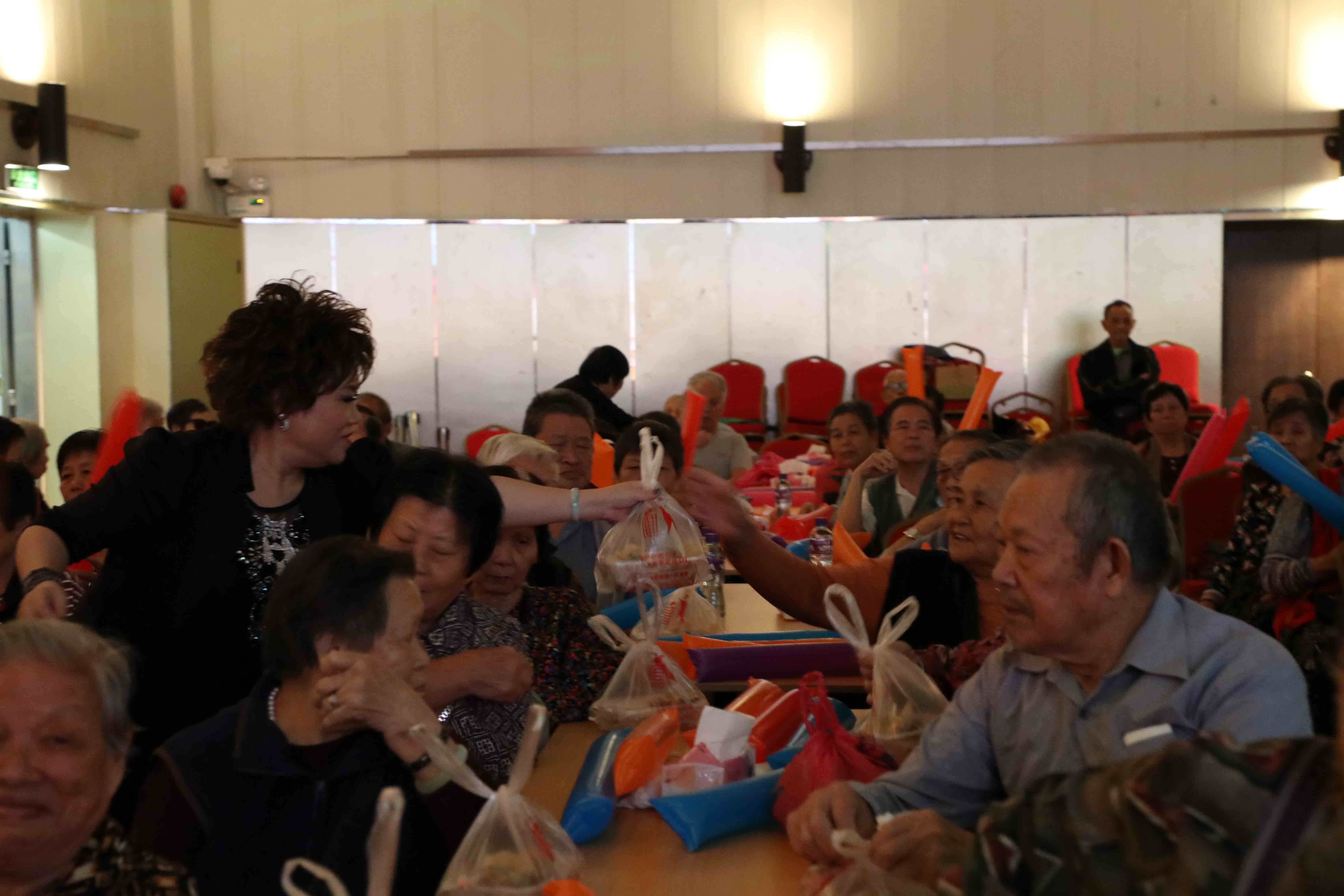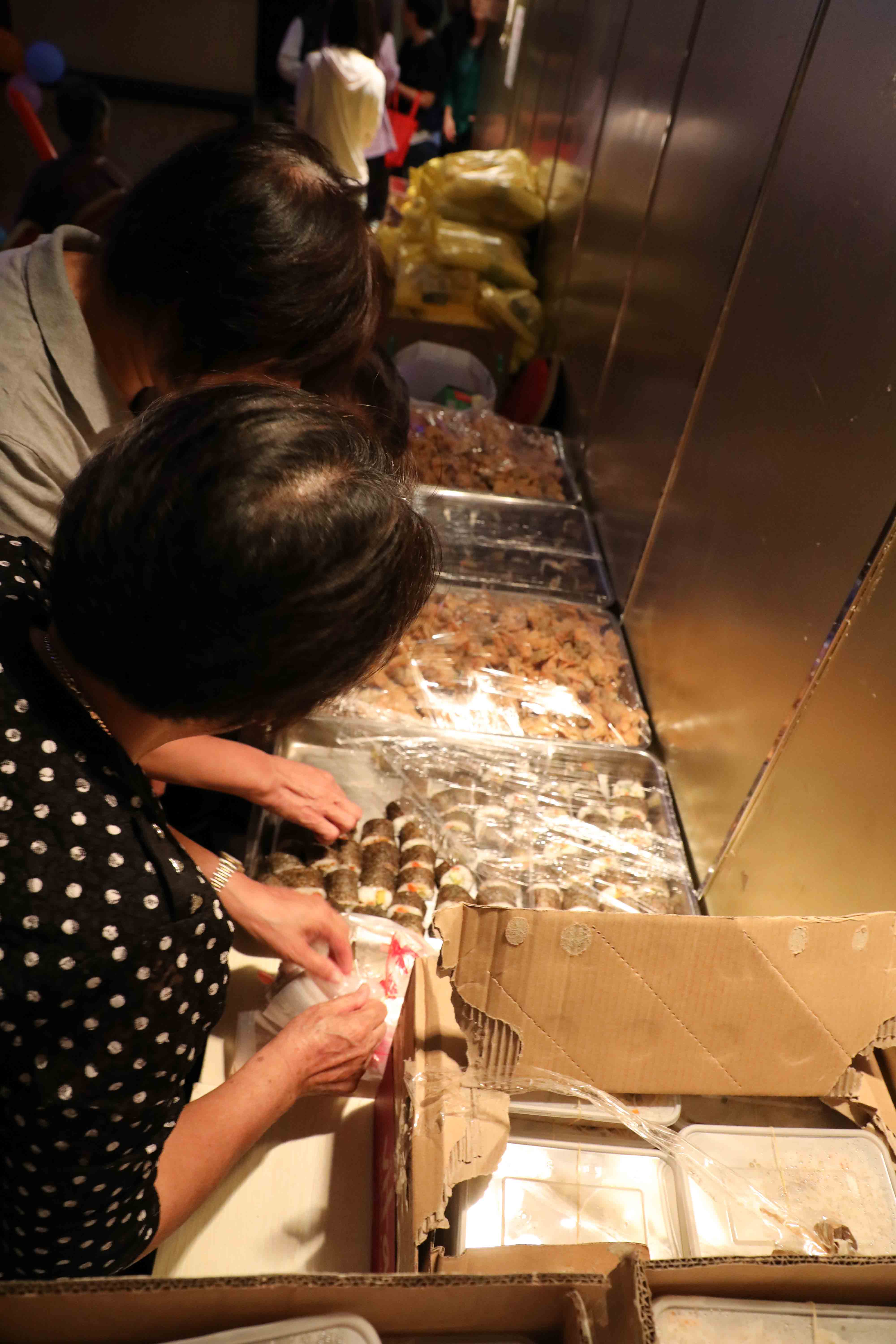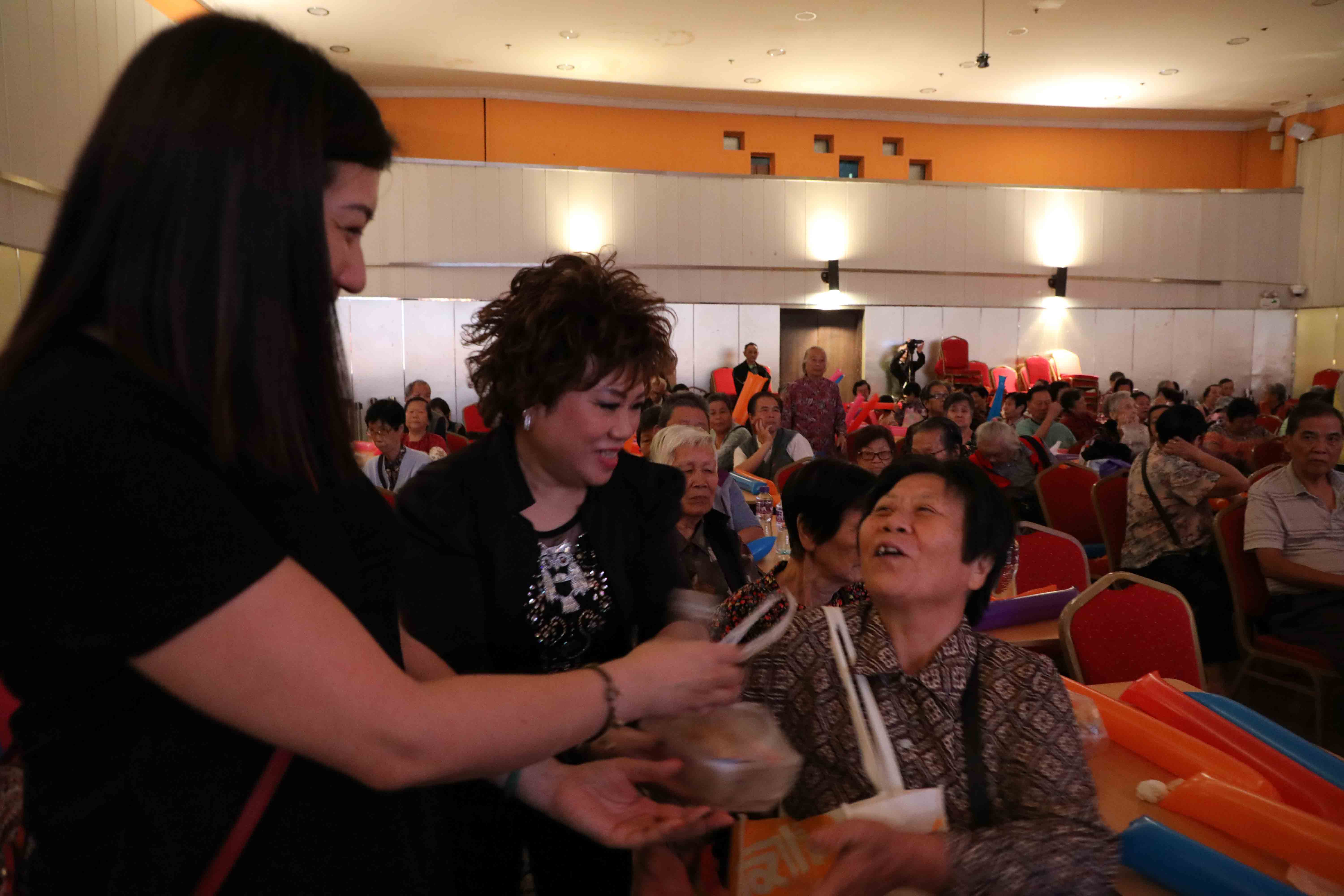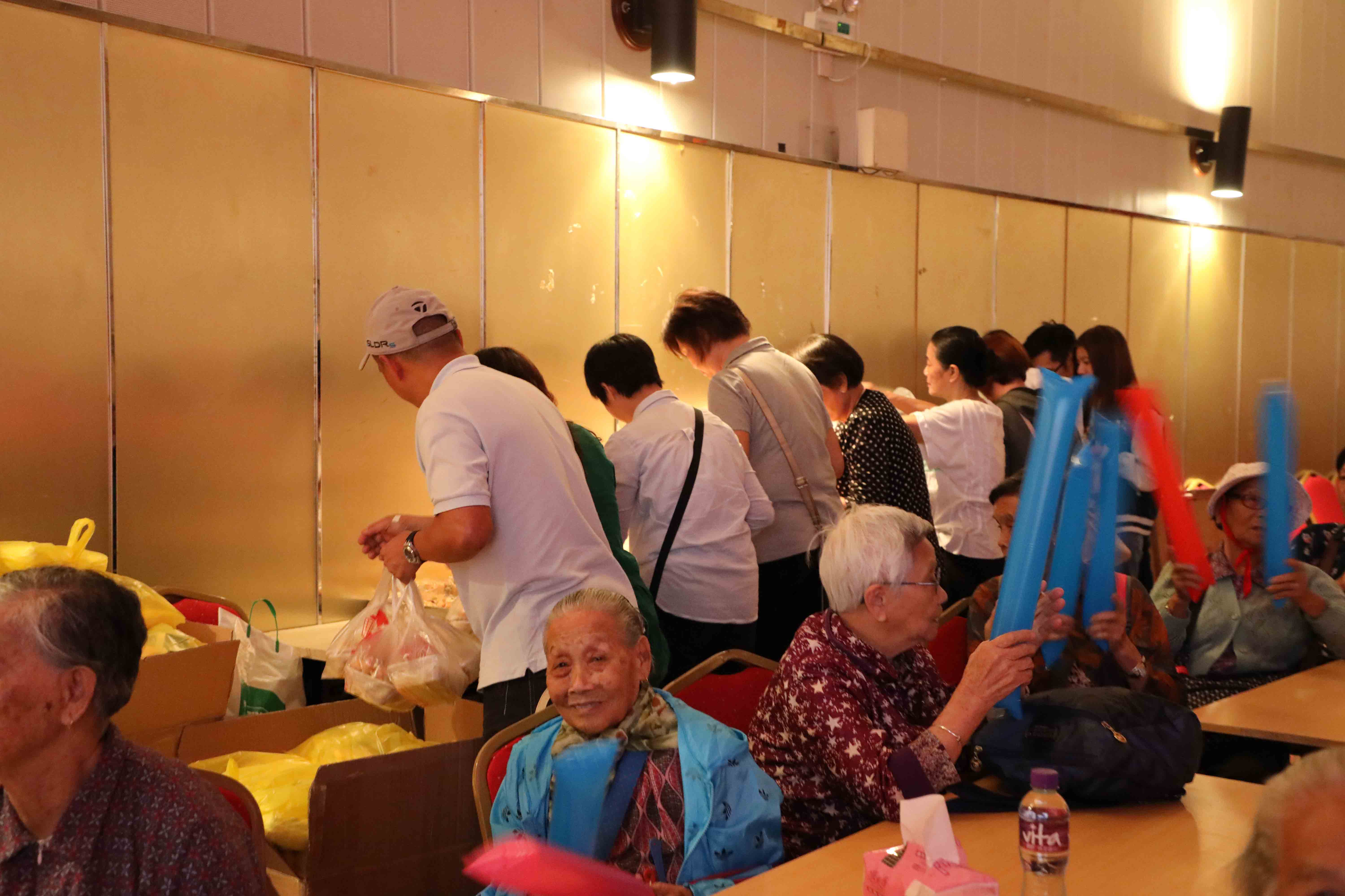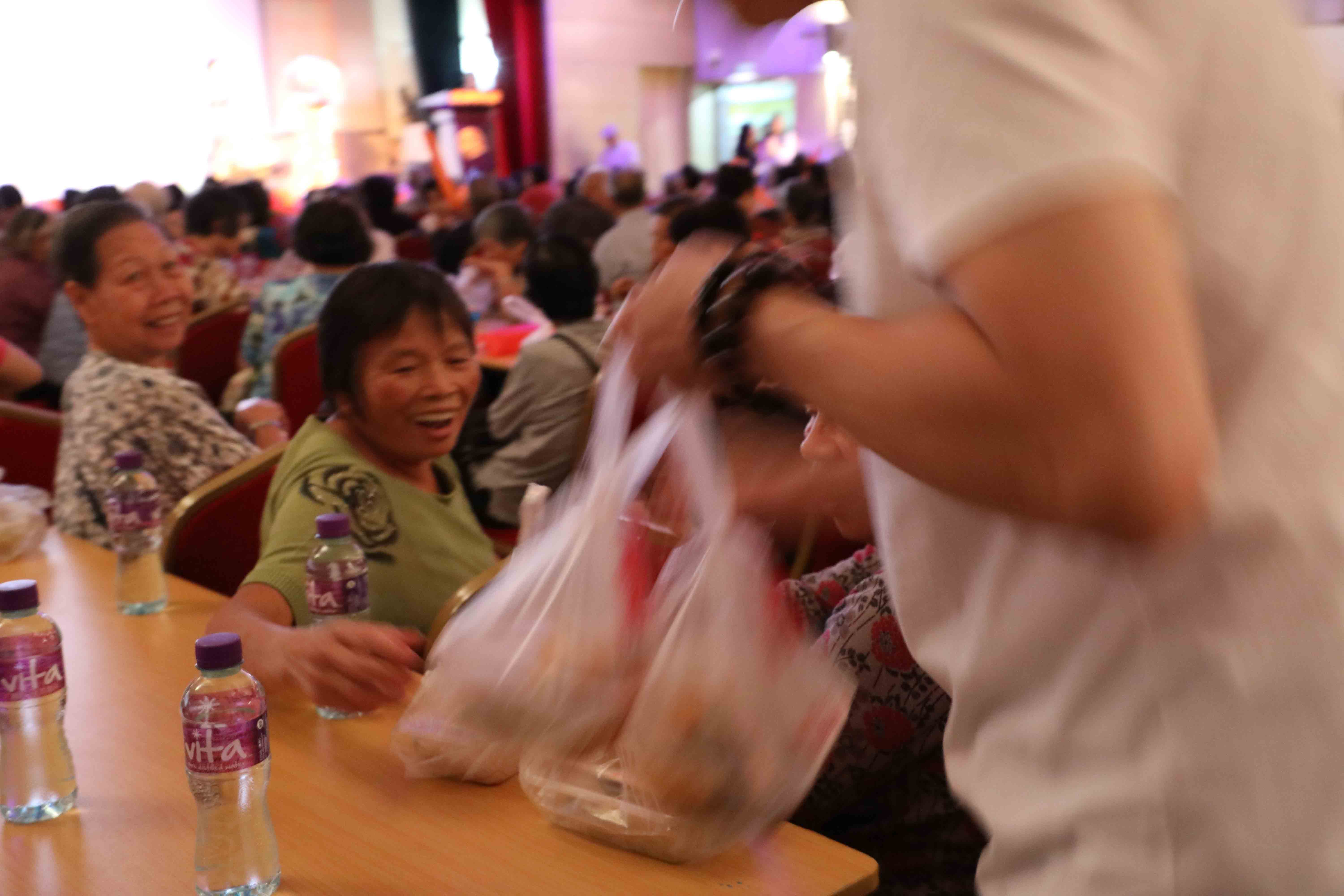 精心安排歌唱節目外, 師父還準備了現場小食、紙包飲品等,讓長者們一邊欣賞表演一邊享用;另外亦如去年,每位參與的長者觀眾均獲一份小小結緣品、和一份晚餐盒。表演中段,師兄師姐幫手運送餐盒入會場。