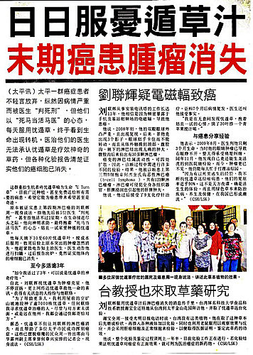 醫生當初講他沒有得救,如今吃了憂遁草,竟然可以將淋巴癌治好,讓他高興得非筆墨所能形容劉聯輝對憂遁草可醫癌信心百倍。