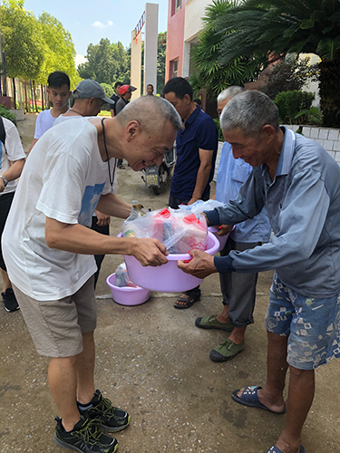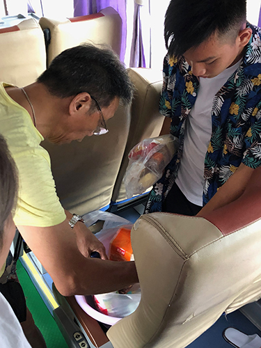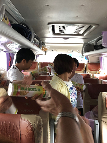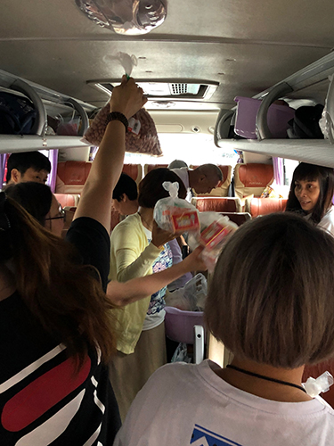 停雨後,包裝的工作地點轉移到旅遊巴士裡, 法然師伯帶領眾人合作下,只5分鐘便極速完成工作!感恩 師伯!