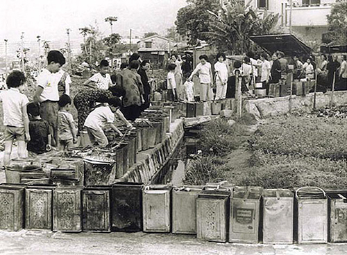 香港首次實施限制用水是在1895年,至1982年的八十多年裡,曾多次制水,其中以60年代最為嚴重。1963年香港出現六十年來最嚴重的水荒,全港水塘存水僅夠43天食用。自1月起規定每天供水4小時,其後更改為每4天供水一次,每次4小時。每次制水,洗澡、洗衣等皆成問題,居民苦不堪言。一家人提著水筒,於街上輪流排隊取水乃成了一般市民生活的重要環節。因輪候爭水,街坊反目,甚至鬧上法庭的事情亦多次發生。
