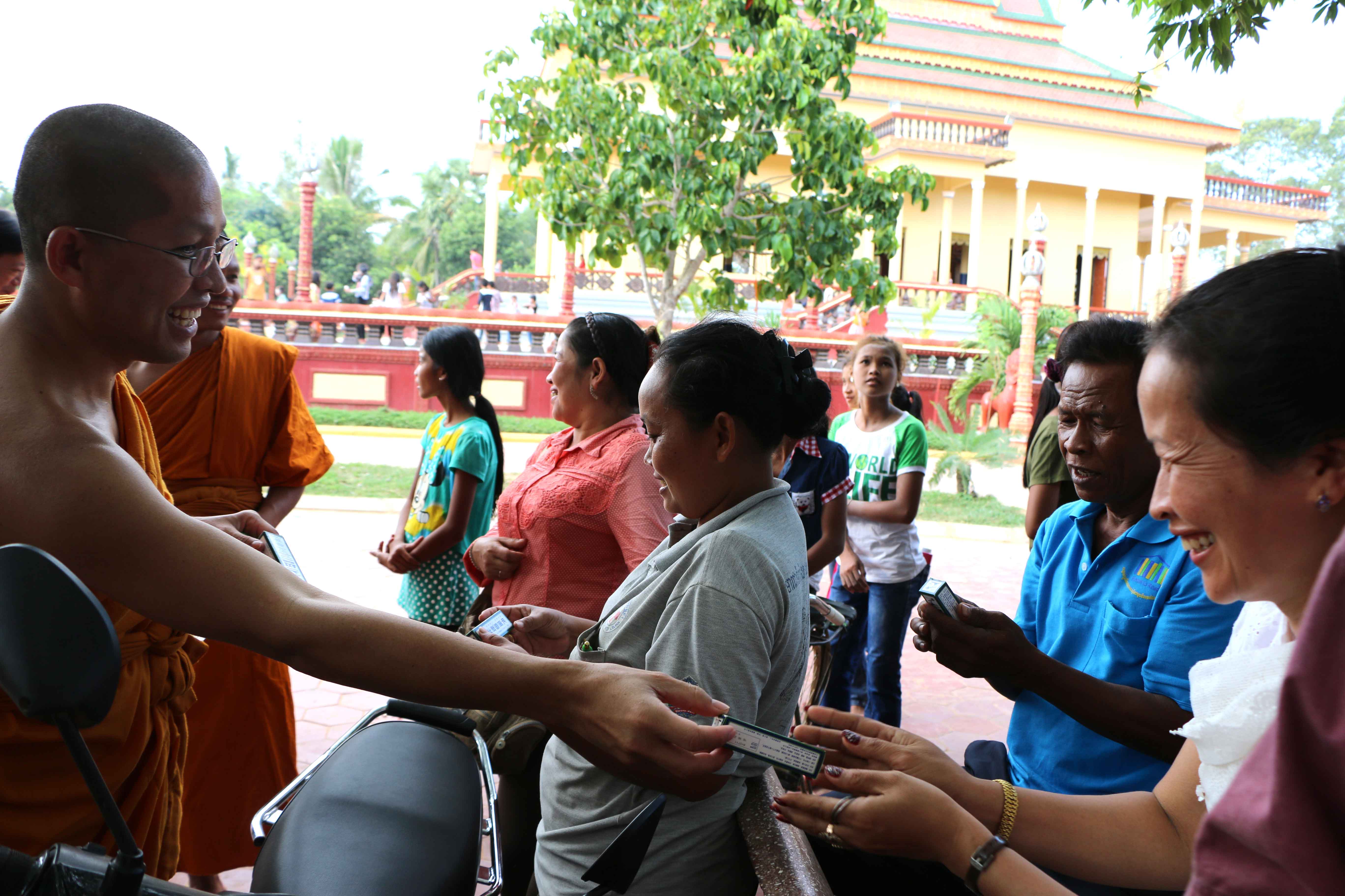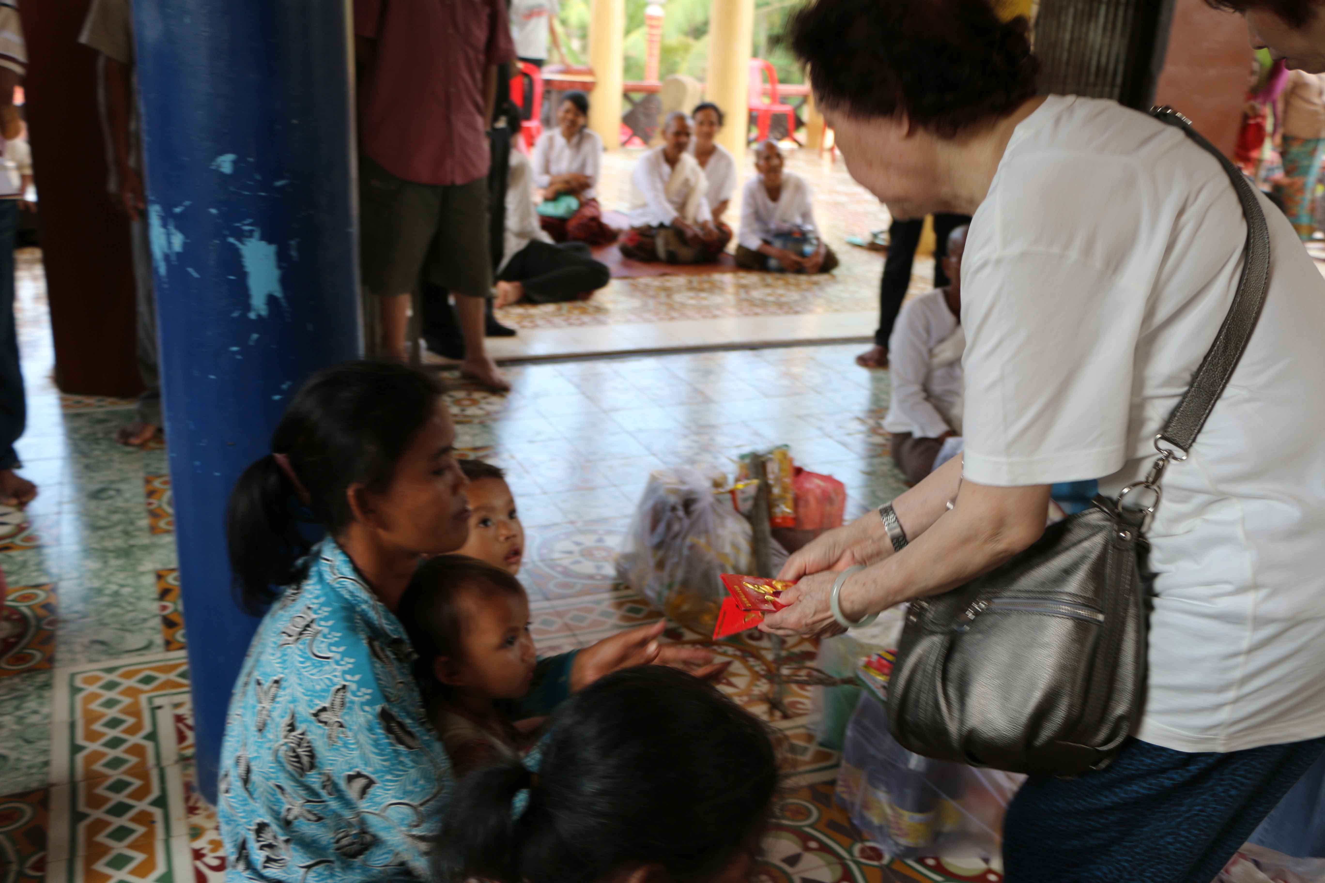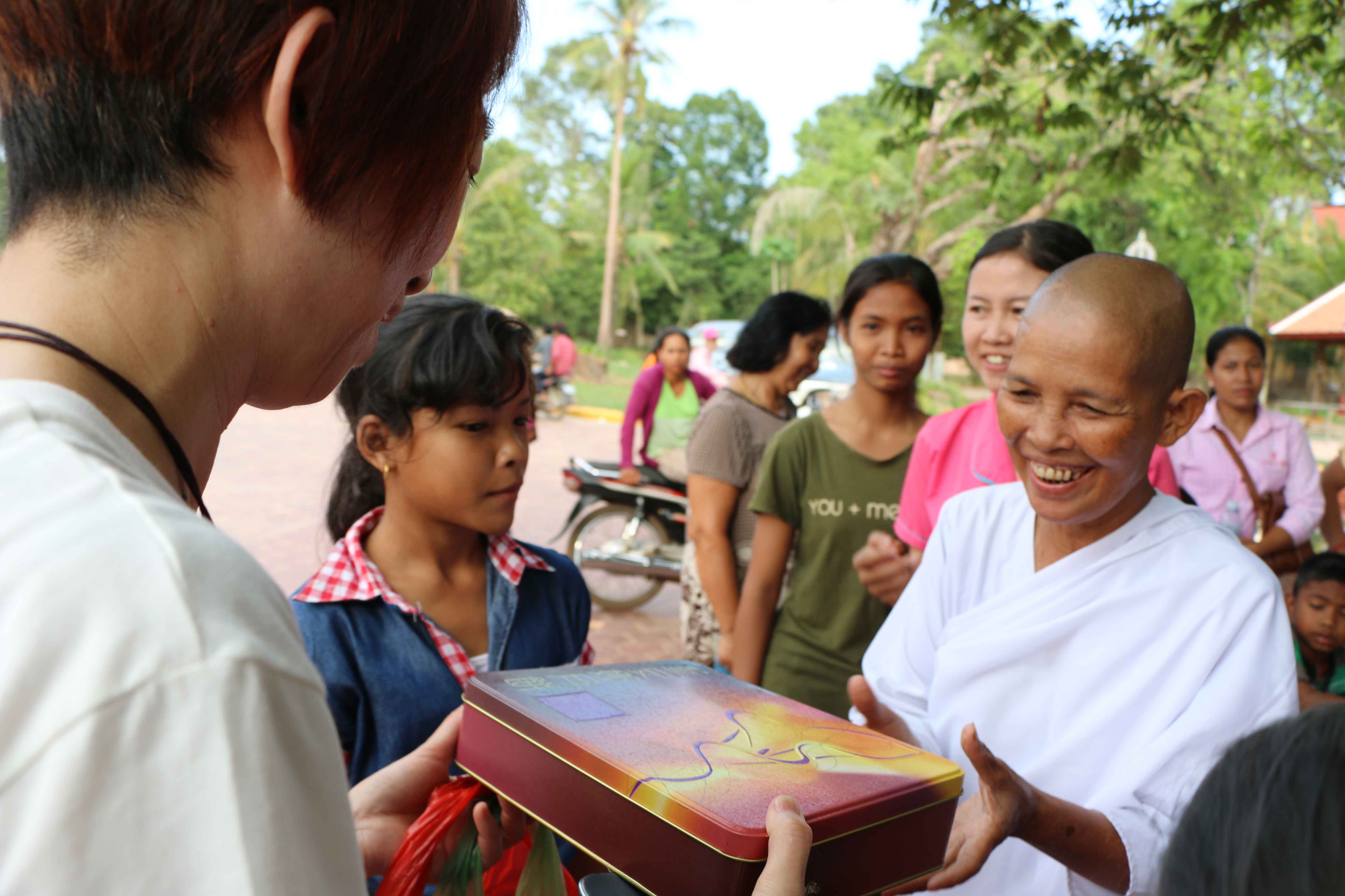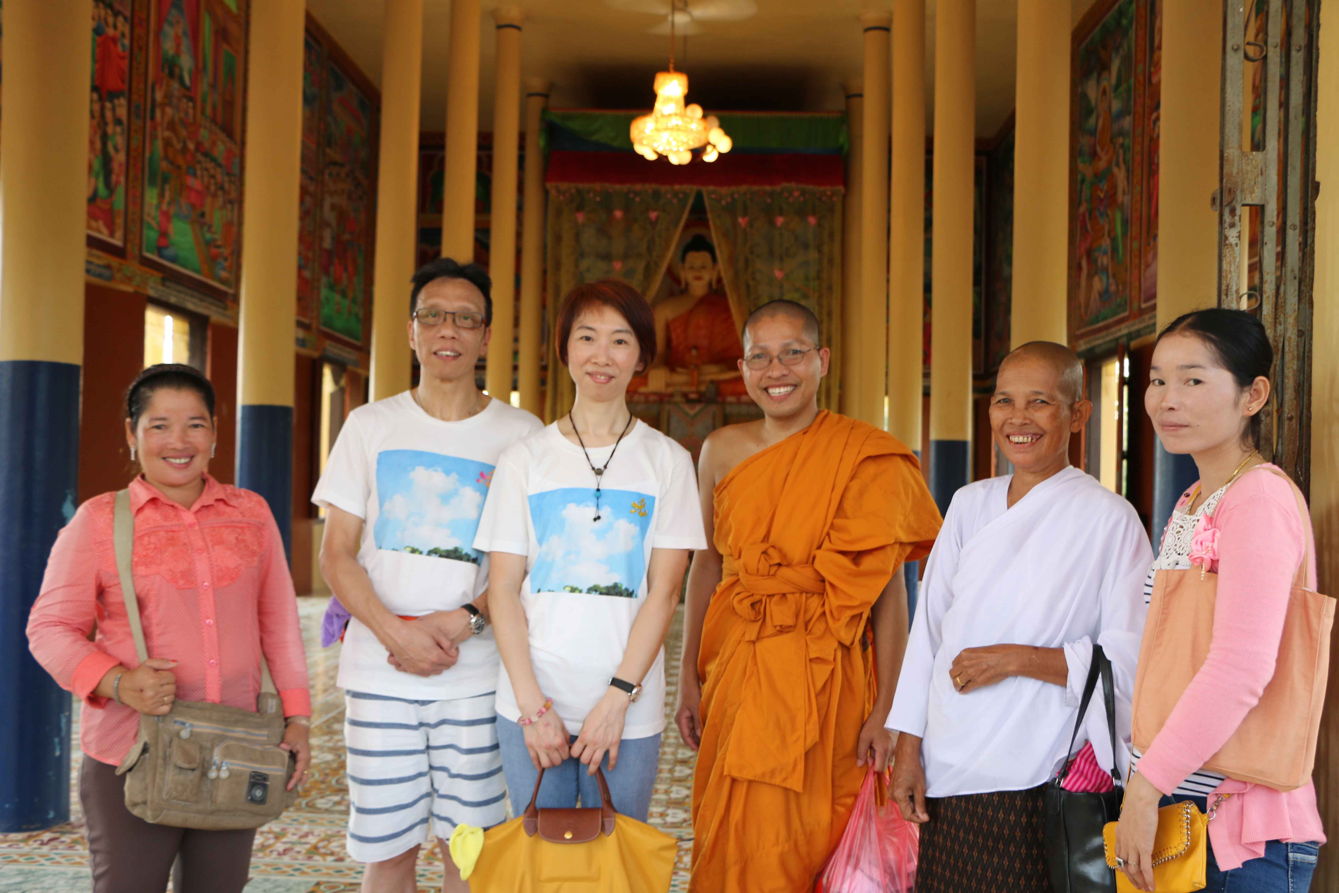 Ven.Somnieng代將驅風油、水壺等物資送給協助打理廟宇的村民廟祝; 師父亦與Ven.Somnieng、Ven.Somnieng母親、其僧人助手Loeurm Lorm以及村民廟祝結緣利是。