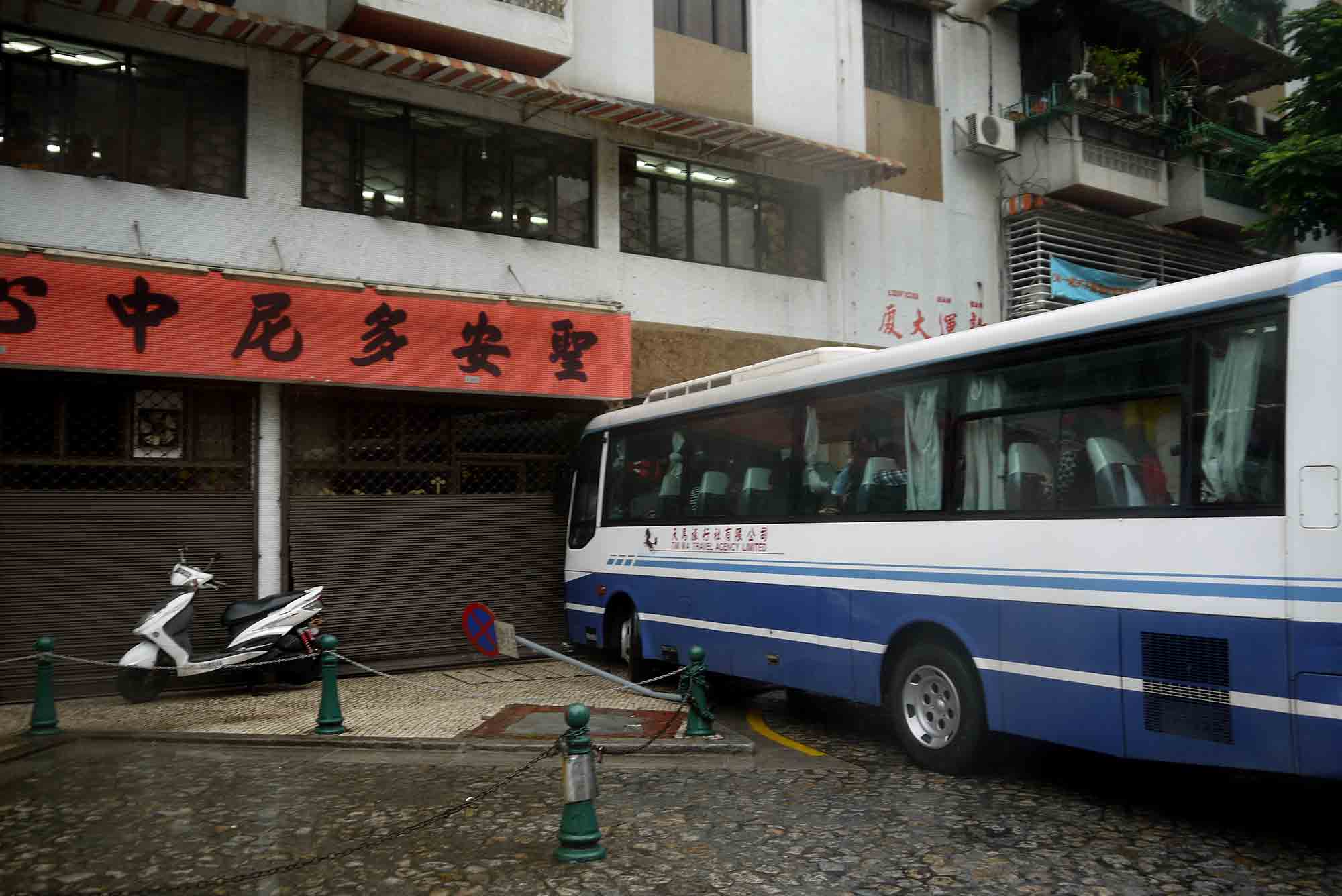 一輛旅遊巴士突然在我們面前,徐徐駛過,卻不依馬路指示方向前行,轉左直撞關了門的商店……