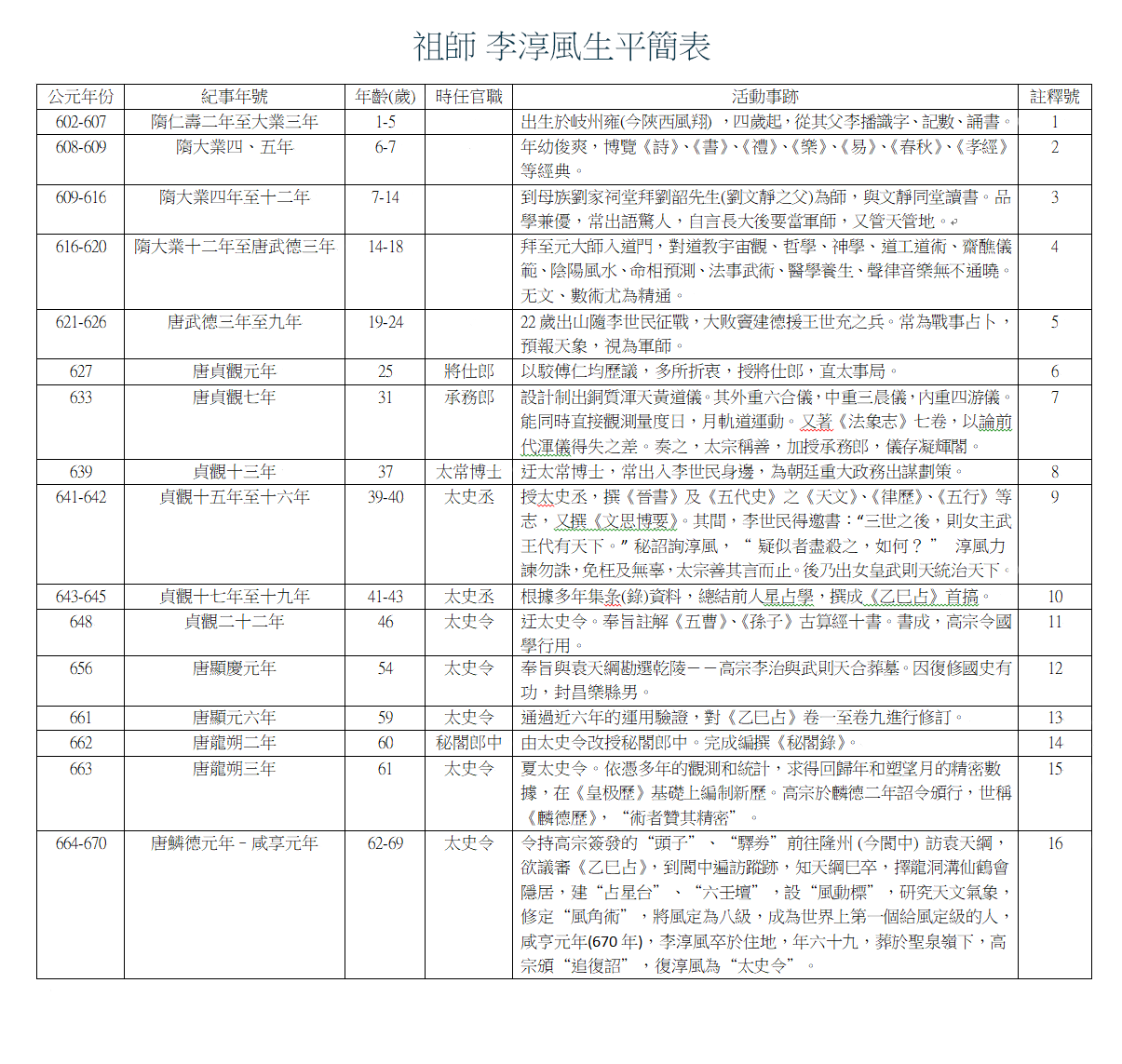 1. 文出,《舊唐書,李淳風傳》卷七十九北京圖書館《新唐書》李淳風卷一六五. 卷二二五 北京圖書館《中外歷史年表》,剪伯贊主編,中華書局《唐年庫》李淳風甲歷台北故博物院