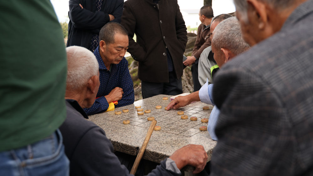 老榕樹下聚了正在下棋子的退休村民。