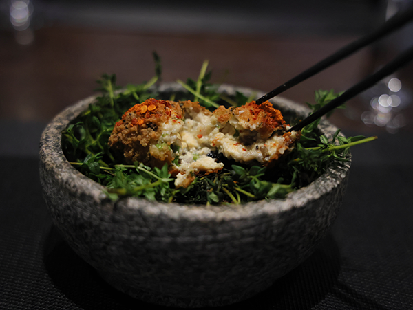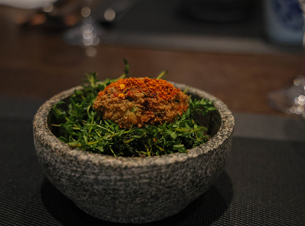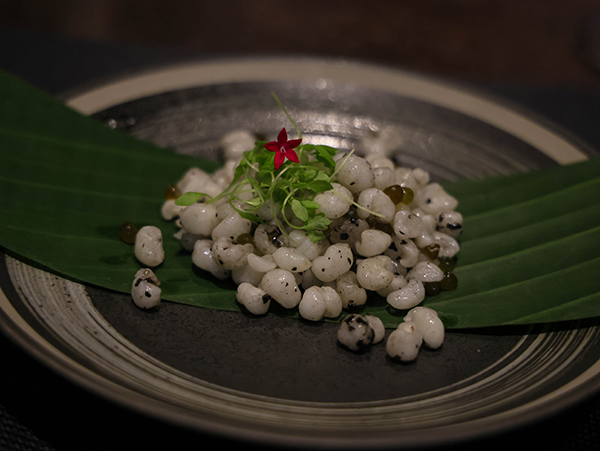 第三道:盤心珍珠。主食材:玉米胚芽、舞茸菇。