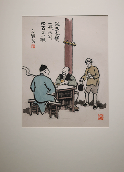 《茶館》畫中題詞:「從三文錢一碗吃到四百元一碗」。
