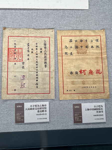 豐子愷先生為上海中國畫院院長的任命書(右)、豐子愷先生為上海市人民政府文史研究館委員的聘書(左)。