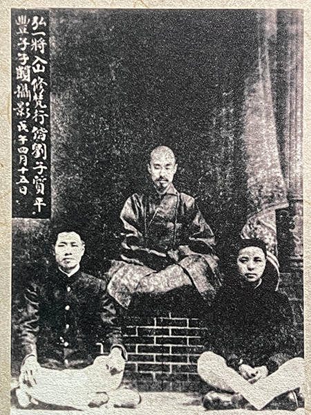 1918年5月24日,弘一法師(李叔同)入山修梵前,與豐子愷(前右)、劉質平合影留念。