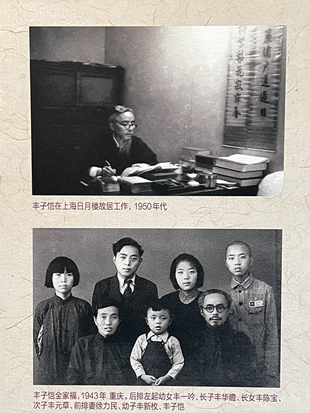 豐子愷在上海日月樓故居工作,1950年代(上)、豐子愷全家福,1943年 重慶。 後排左起幼女豐一吟、長子豐華瞻、長女豐陳寶、次子豐元草、前排妻徐力民、幼子豐新枚、豐子愷(下)。