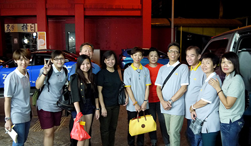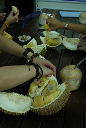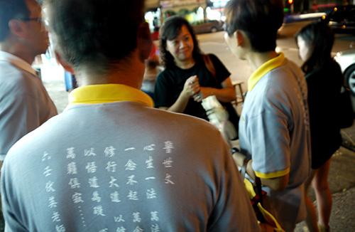 到訪新加坡芽籠區(Geylang) 一嚐當地出名的榴槤,準備離開之際, 突然有一女士走近,詢問我們 「灰色戰衣」背後經文 《六壬伏英老師公降示 警世文》的意思,細談之下, 原來她的兒子也是六壬弟子,當下 師父即鼓勵她:兒子身為六壬弟子,理應勤於讀誦 《祖師爺經》。