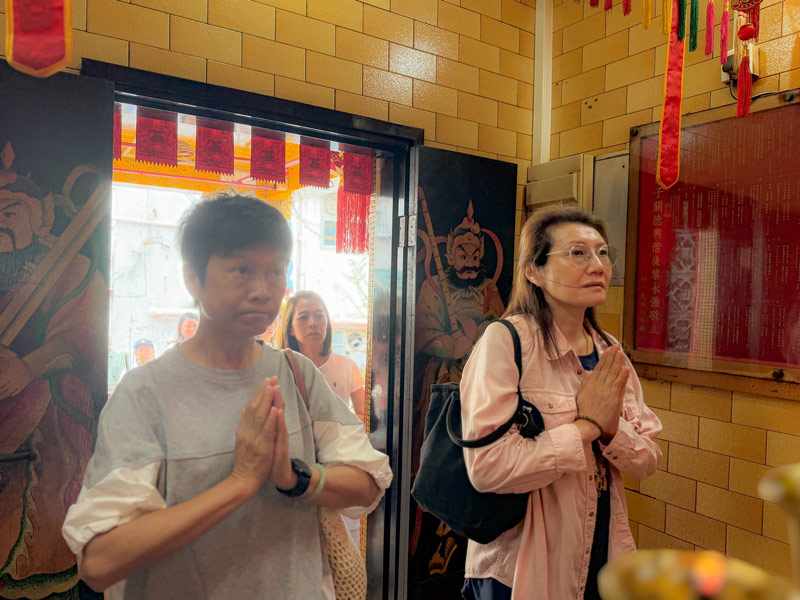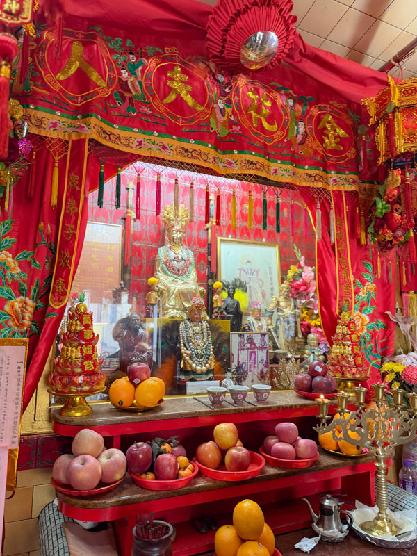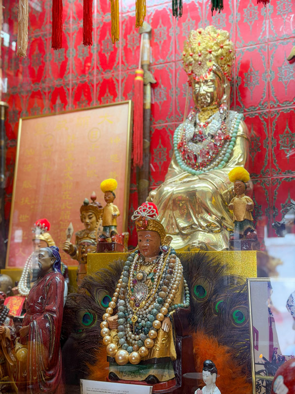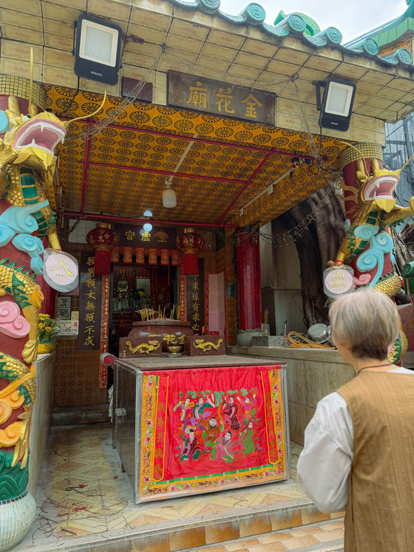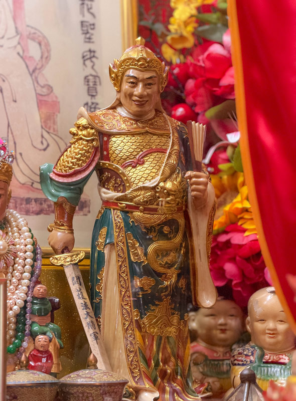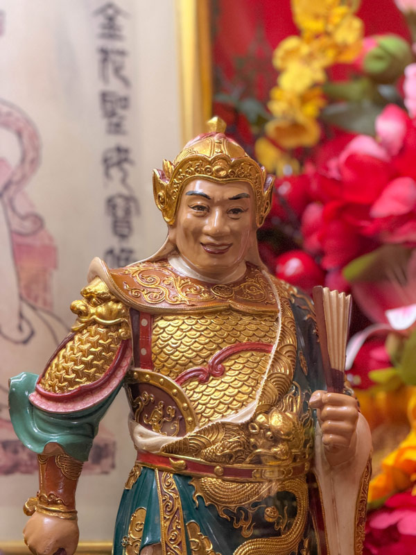 廟內安放著一文一武的 金花娘娘像,旁邊擺放著 關德興先師像。事緣 關德興師傅得 娘娘顯靈,指示他前往坪洲祝賀金花誕;後來 關德興師傅被追封為 護法大將軍,守護著 金花娘娘。