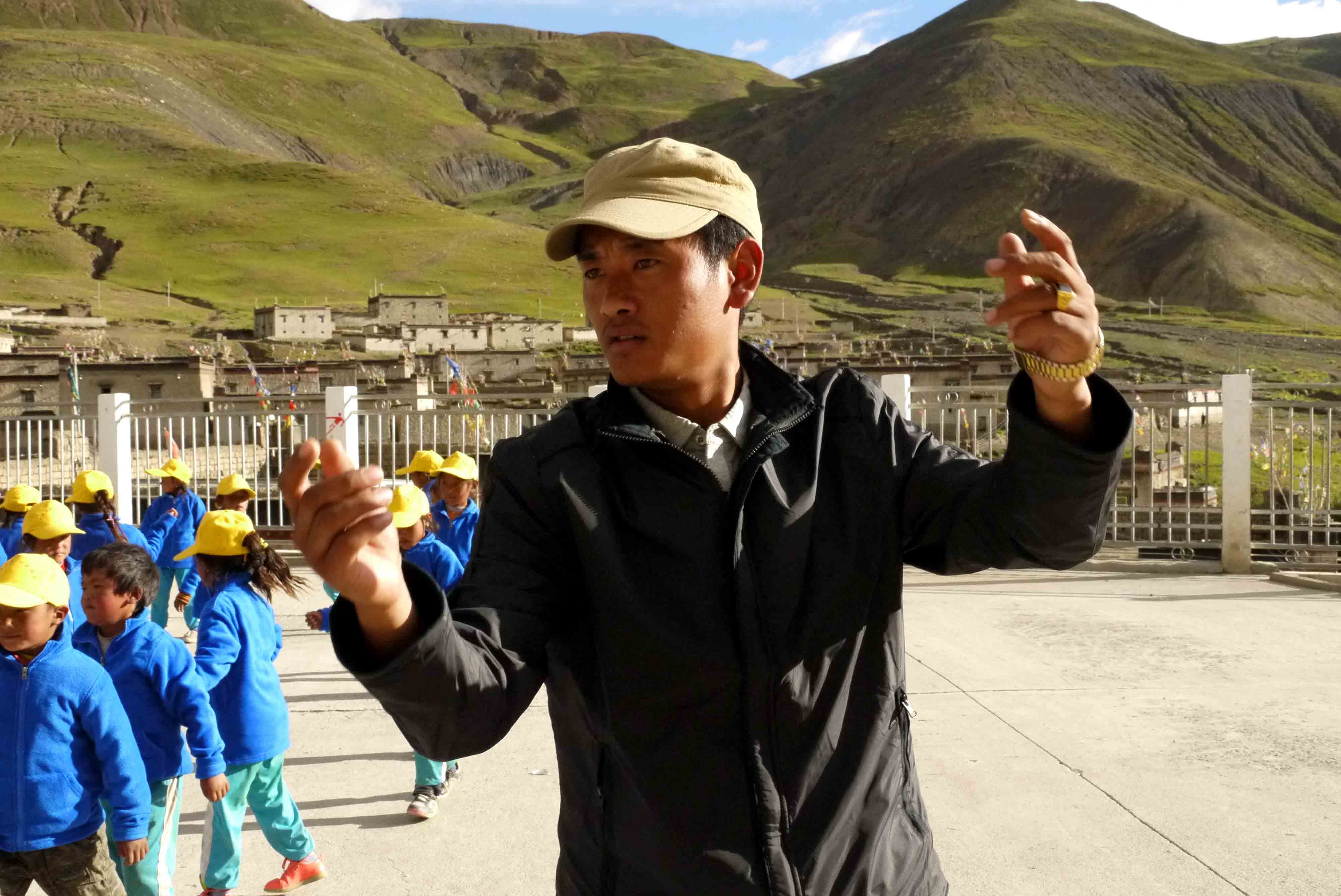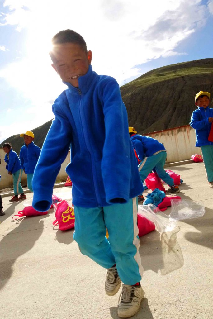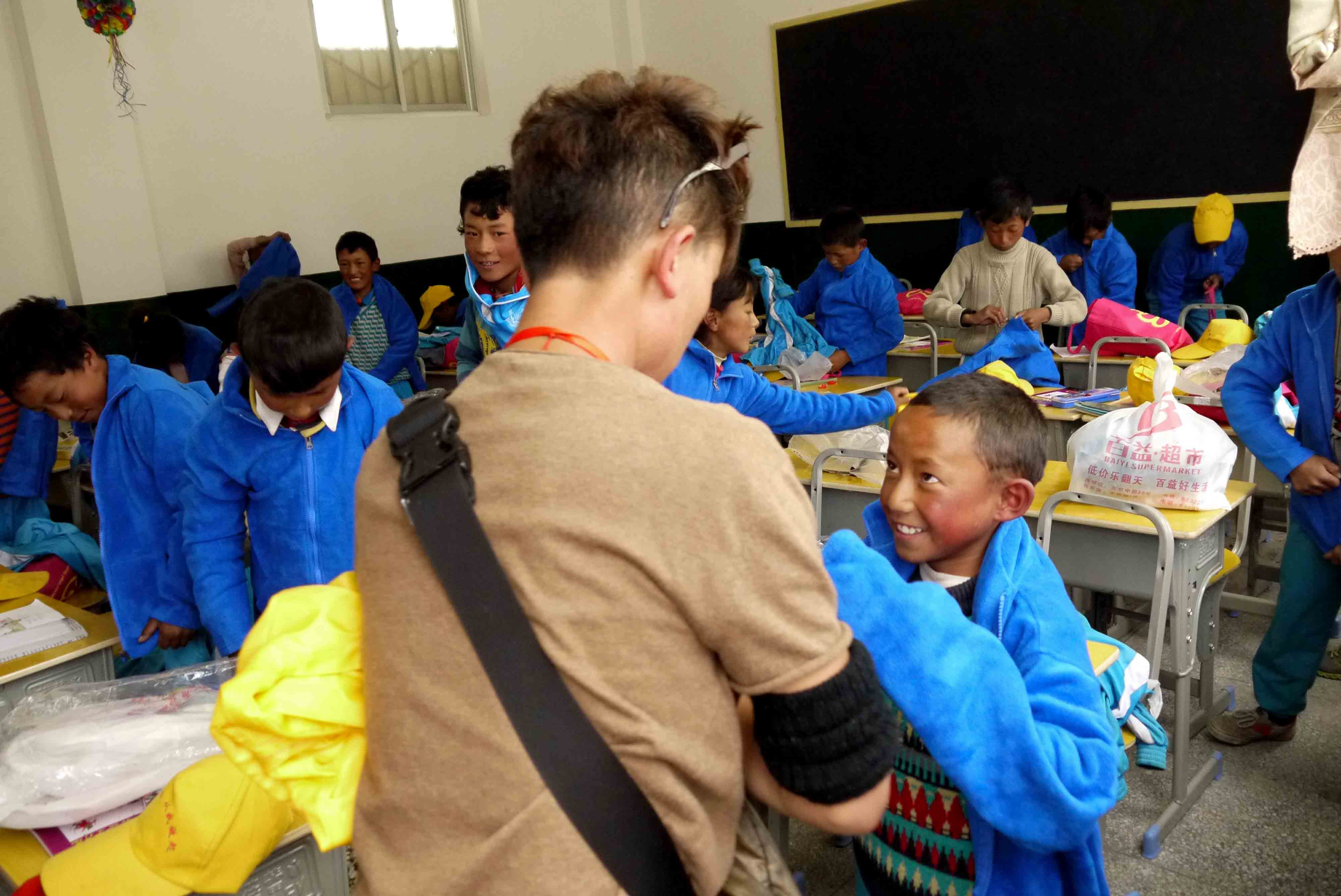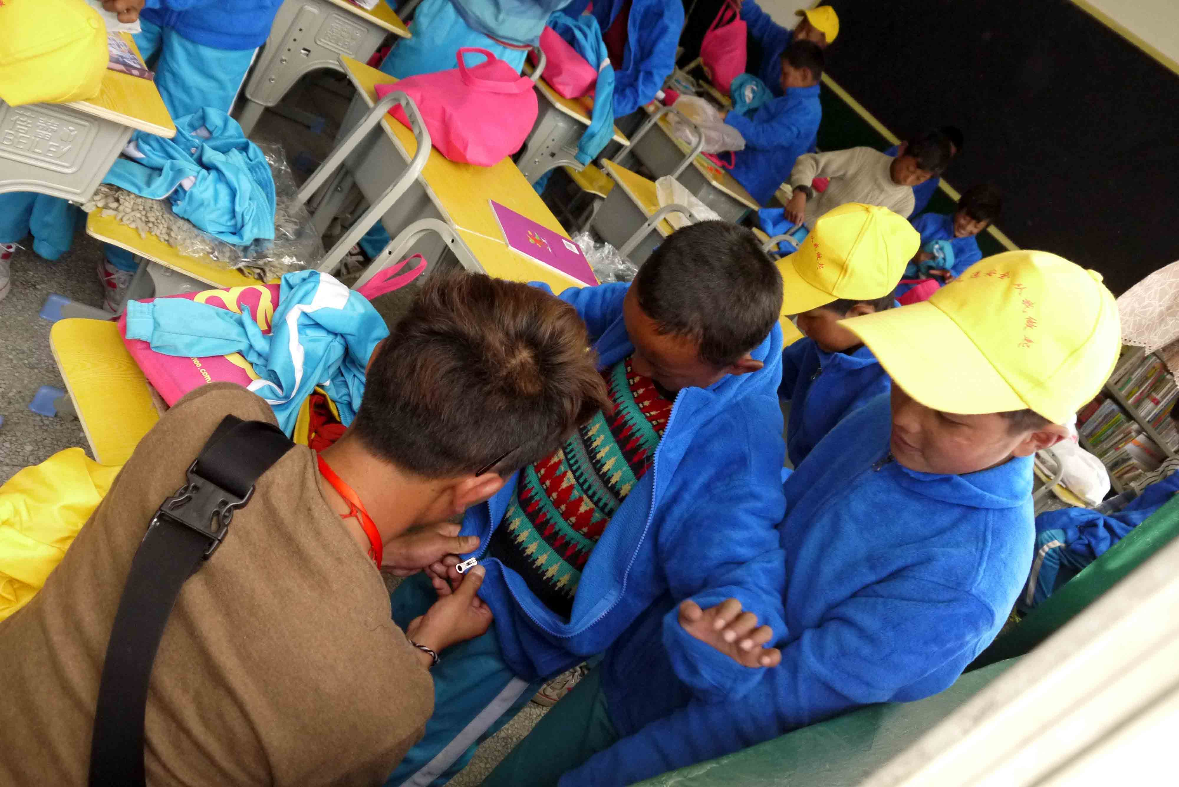 愛可感染別人,我們的藏族導遊達次(他的名字),看到孩子脫不到外套,便細心的幫他一把。