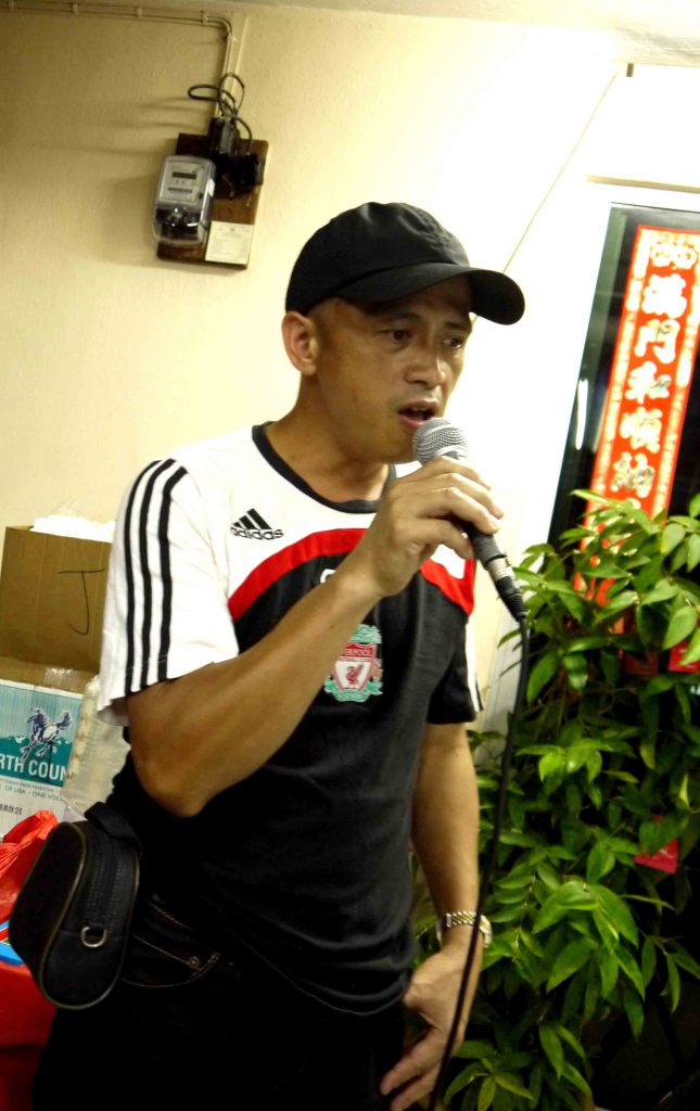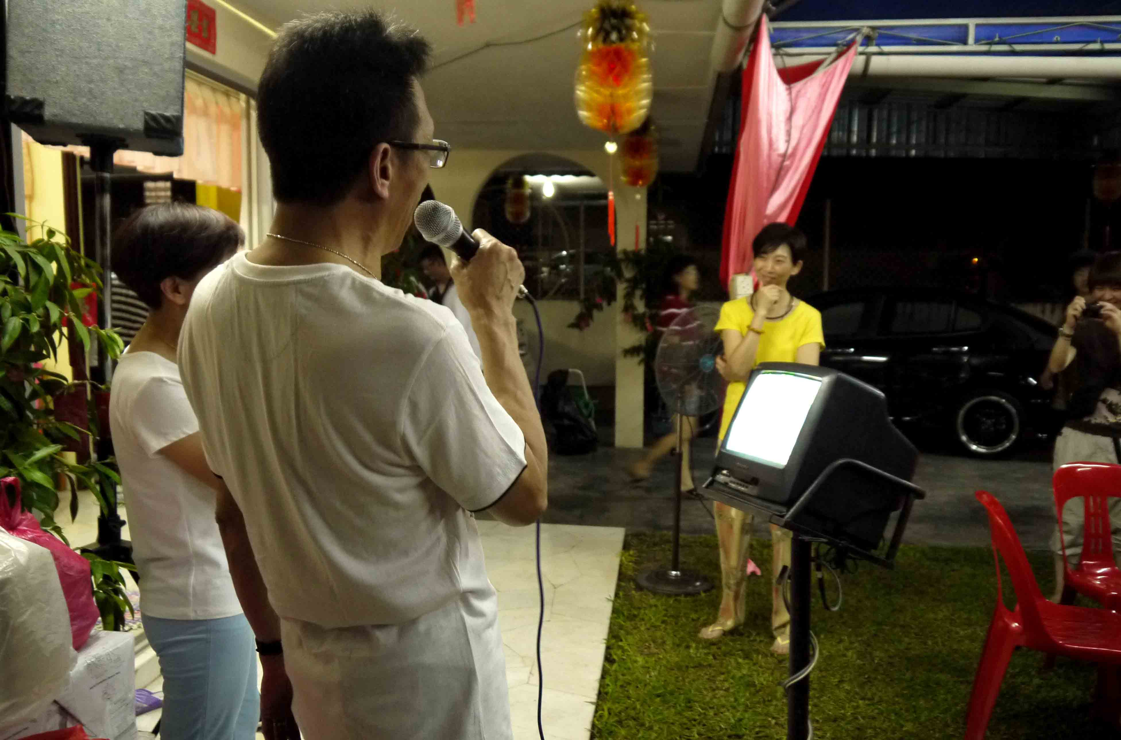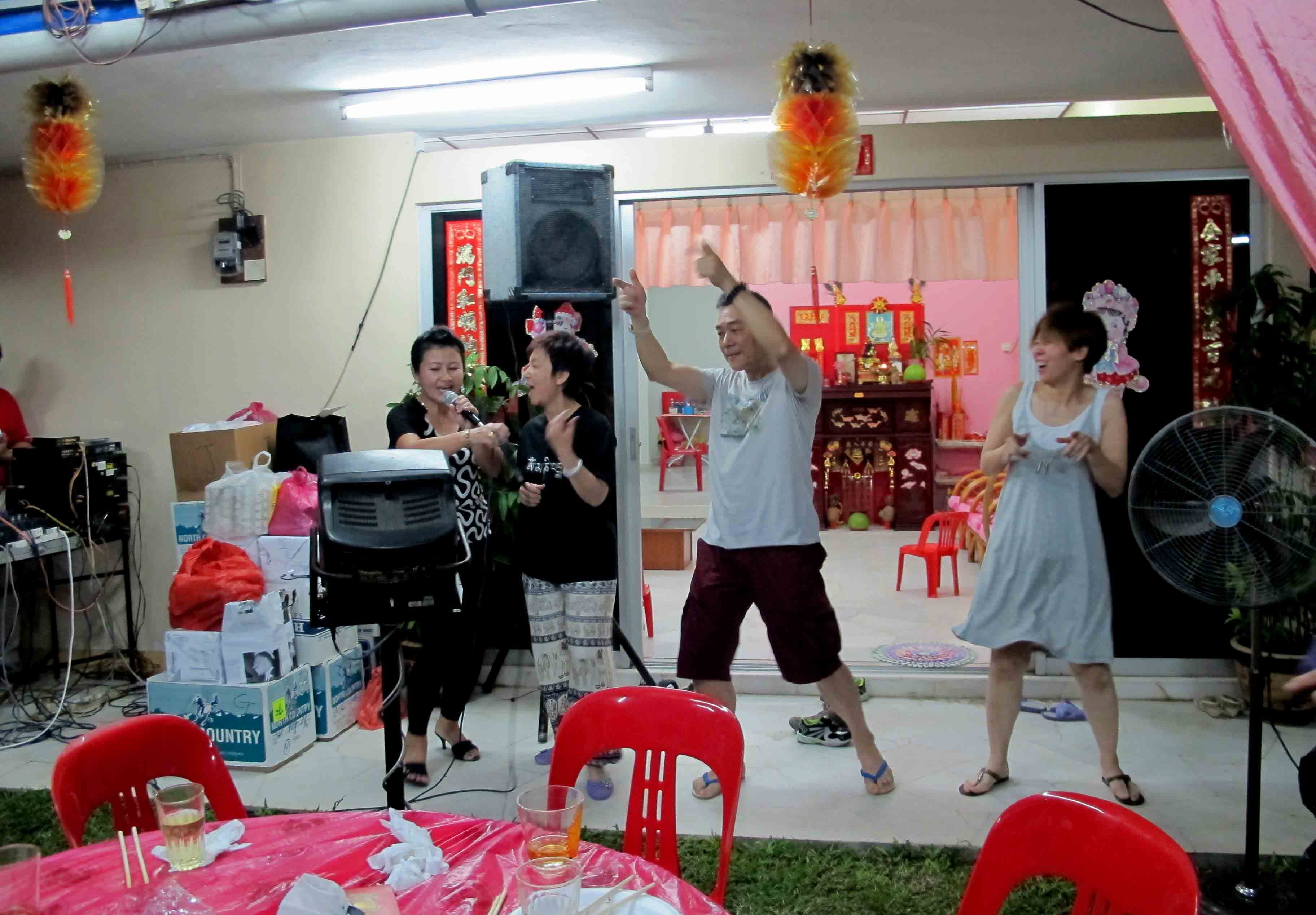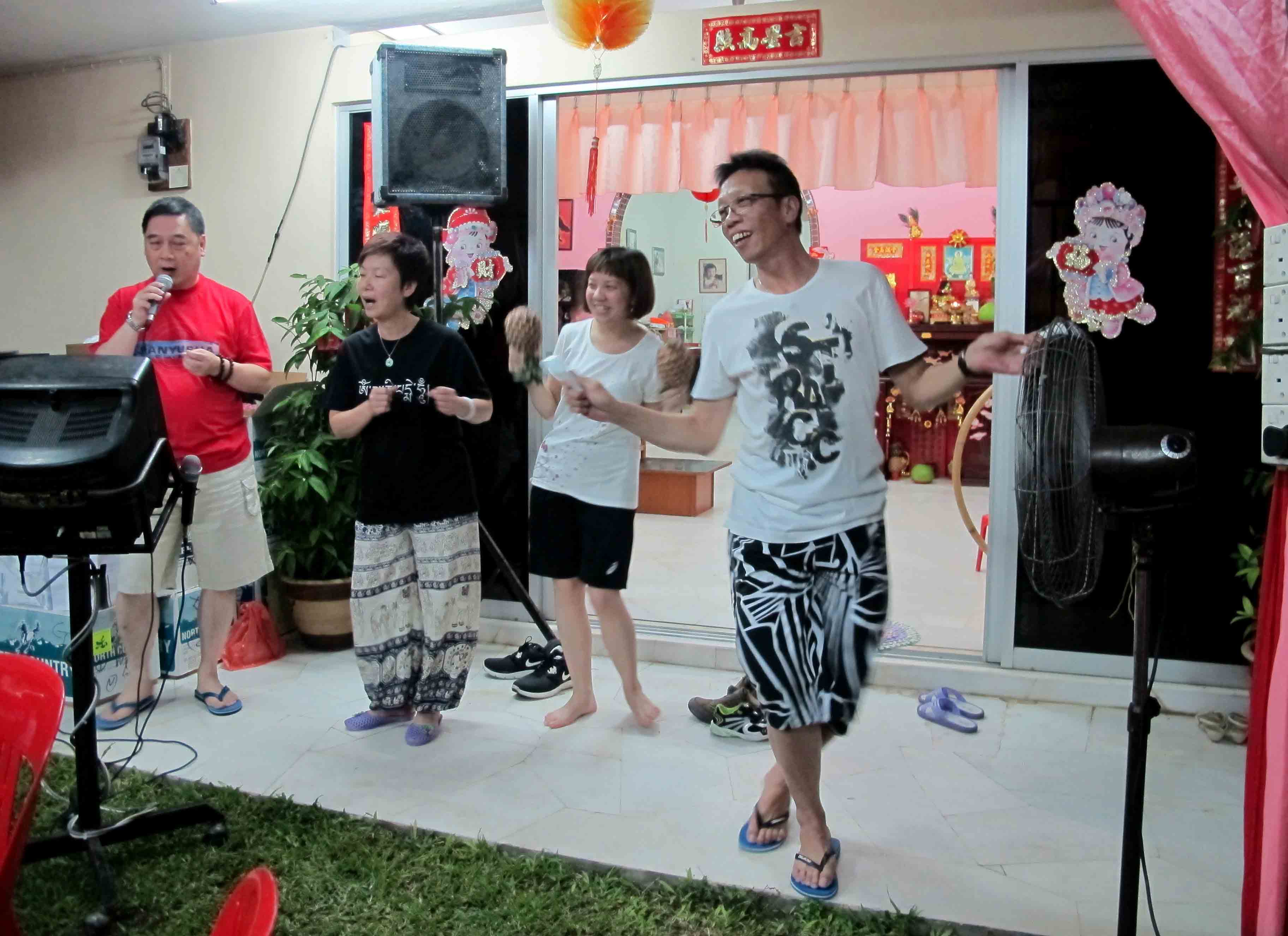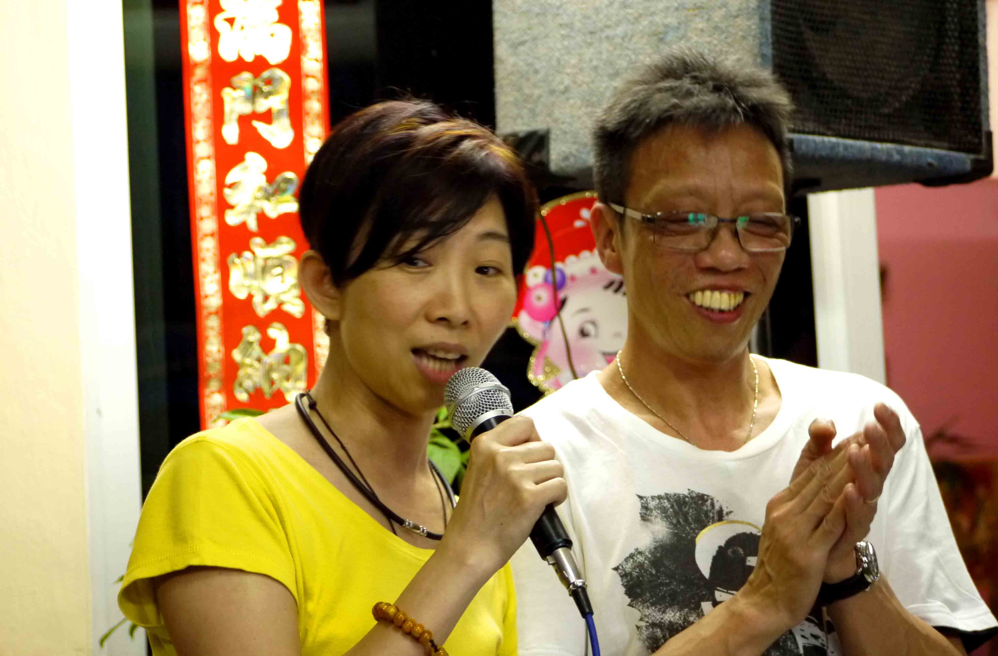 亞倫的太太詩敏拿起2隻波蘿,和 師伯、師姐一起為善信黎先生所唱的《檳城艷》伴舞。