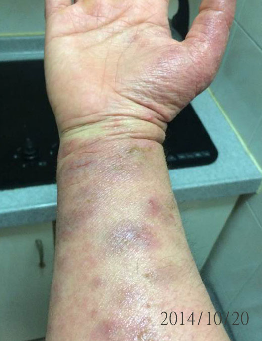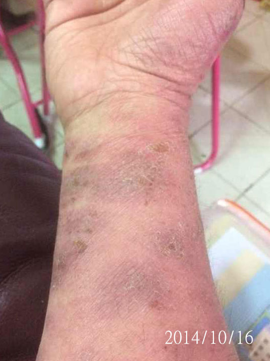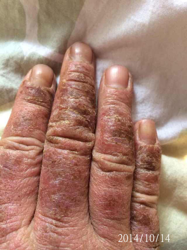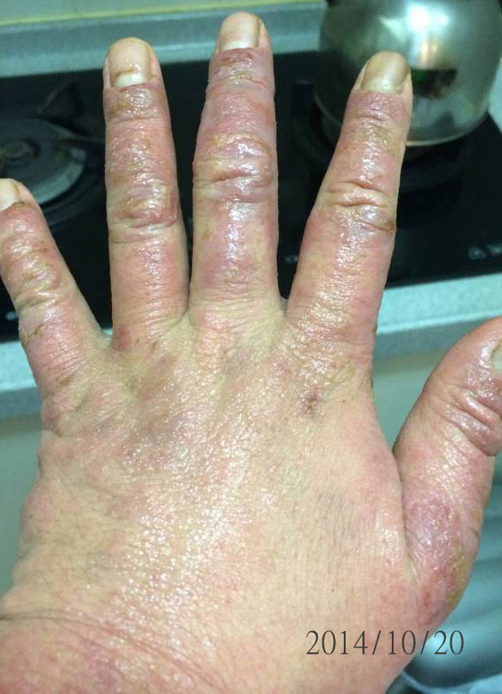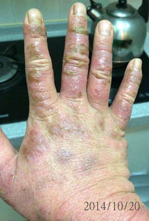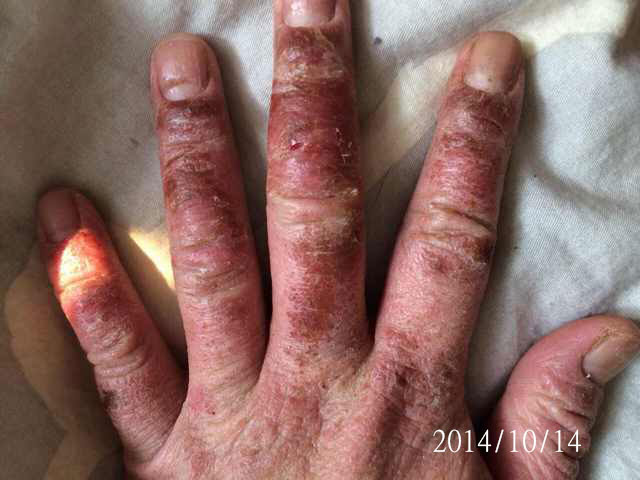 2014年6、7月始,善信Johnny (化名) 臉部、雙手和小腹,無故出現紅疹,十分痕癢,部分紅疹其後竟開始轉黑、腫脹、潰爛、流水和結焦。經醫生診斷,是嚴重濕疹惡化至皮膚炎。由初期看西醫到後期轉看中醫,3個多月以來仍然病情反覆,未見好轉,晚上常被痕癢感覺弄醒,不能安眠。反覆的病情更令Johnny不能如常上班工作。